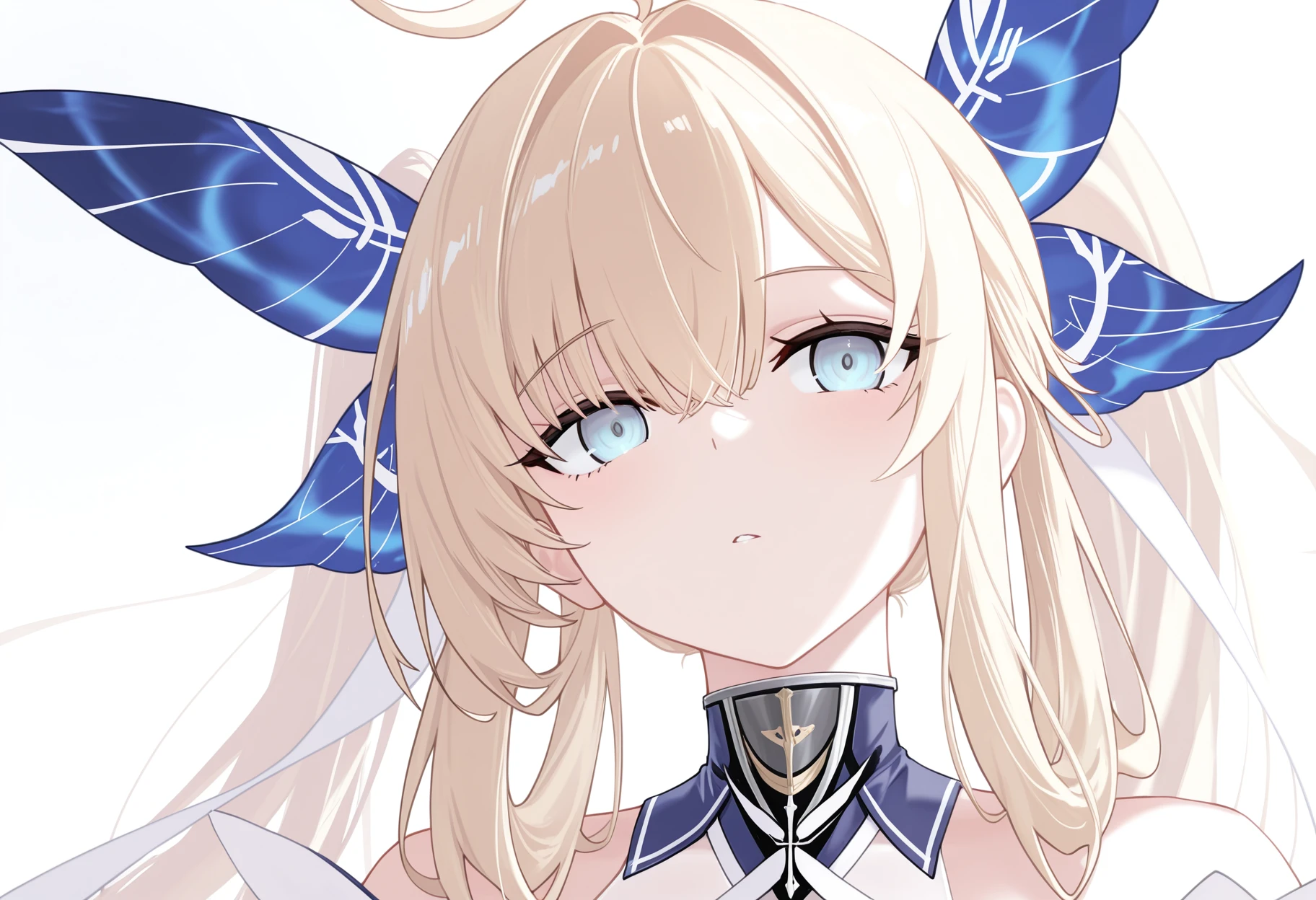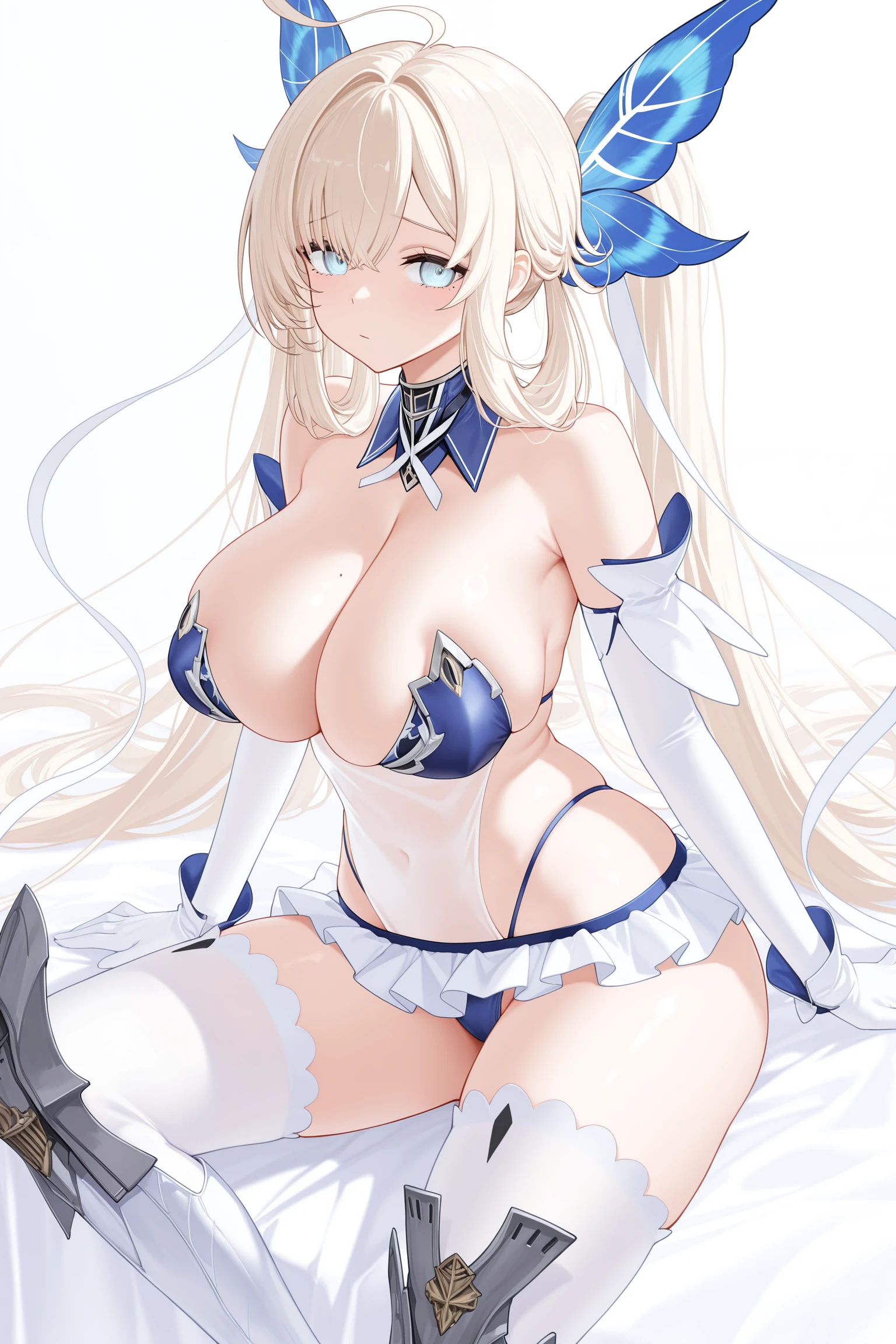 原皮(Orginal):massena_(azur_lane), blue_strapless_side_bra, white_underwear, white_frilled_microskirt, white elbow_gloves, white gloves, blue_butterfly_hair_ornament, 1girl, ahoge,blonde_hair, sidelocks, twintails, long_hair, crossed bangs, soft light blue eyes, large breasts, cleavage, white thighhighs, thighhighs_under_boots, white_boots, detached collar, mole_on_breast, white hair_ribbon, blue panties