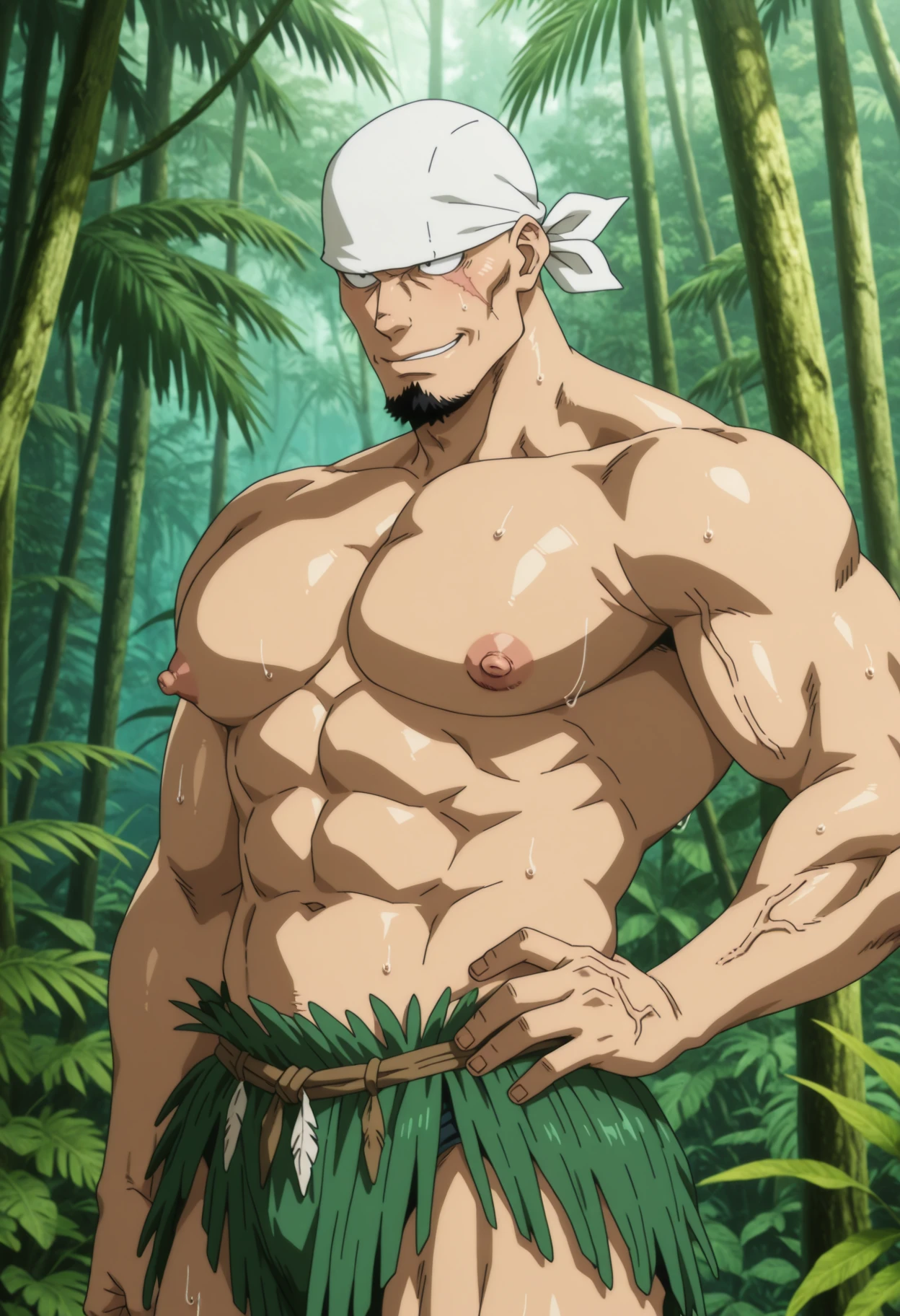 Mature male, manly, white headscarf, black eyes, sanpaku, Right eye scar, No eyebrows, goatee, pronounced cheekbones,