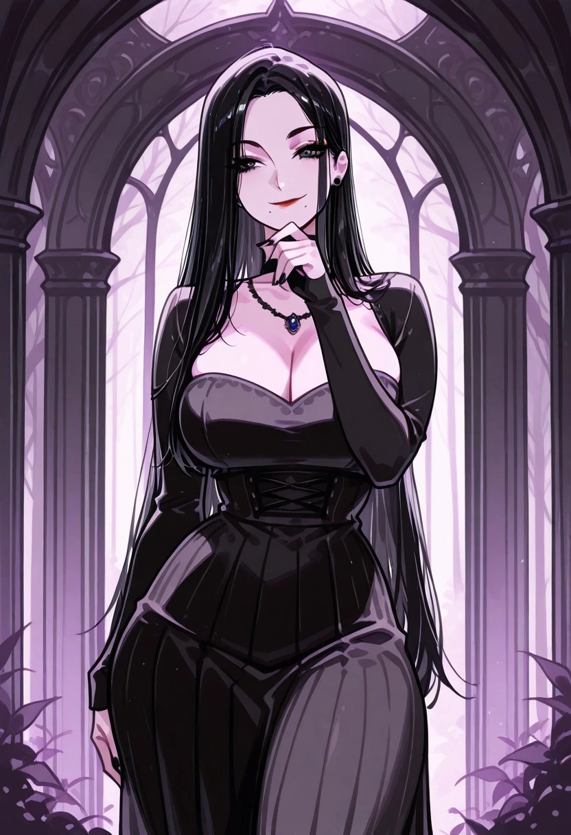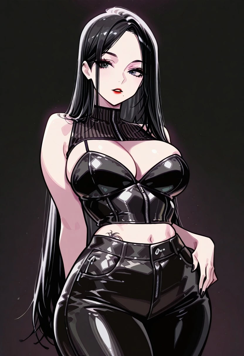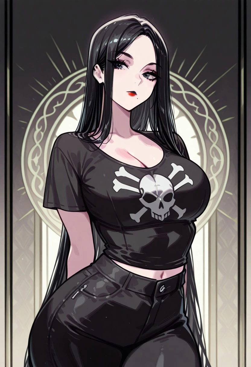 very long black hair, parted hair, straight hair, black eyes, one mole under the mouth, large breasts, large hips