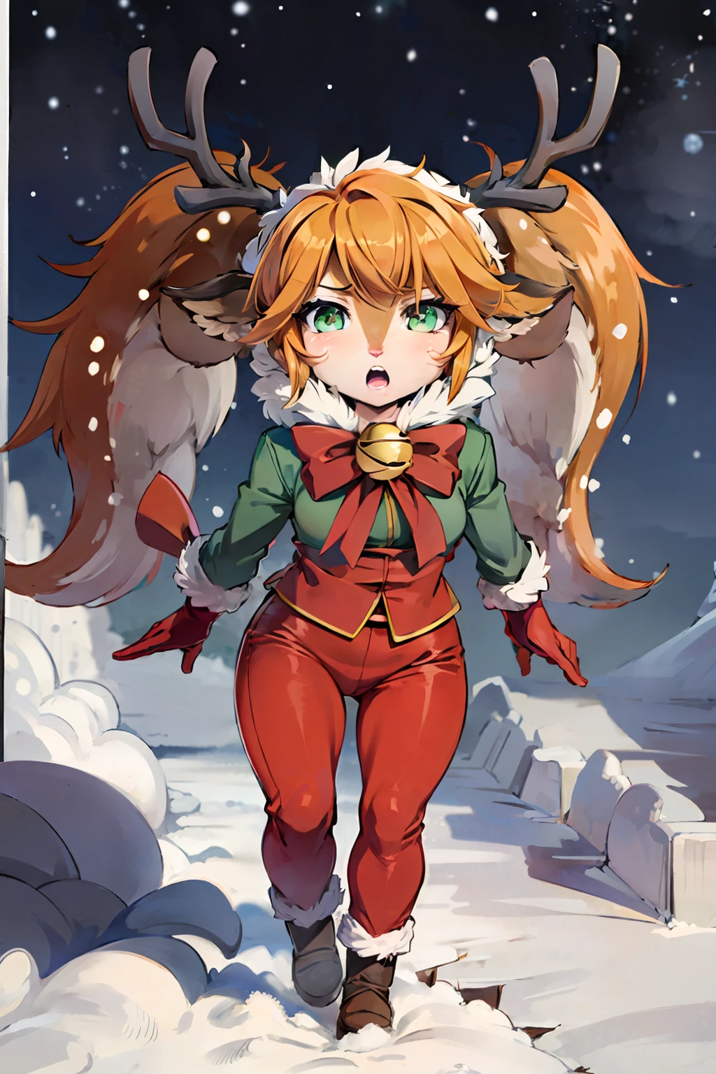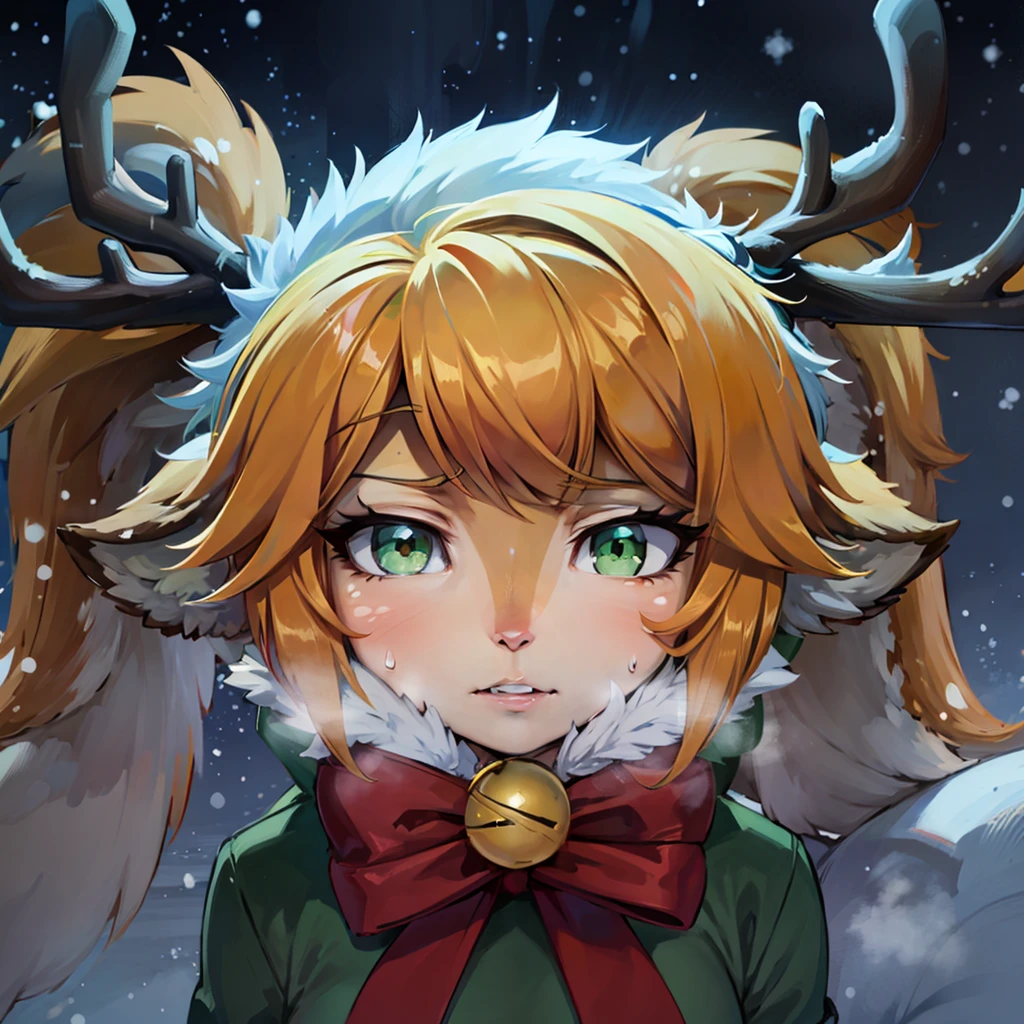 Other useful positive tags: 1girl, antlers, animal ears, green eyes, furry, twintails, tail, bell, red bow, red pants