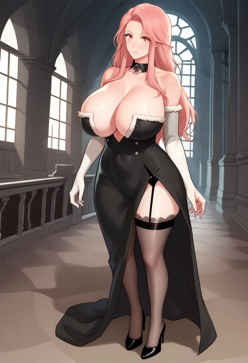 cleavage, low neckline, black choker, black dress, strapless dress, fur trim armwear, elbow gloves, black panties, thigh gap, garter straps, lace trimmed thighhighs, black thighhighs,