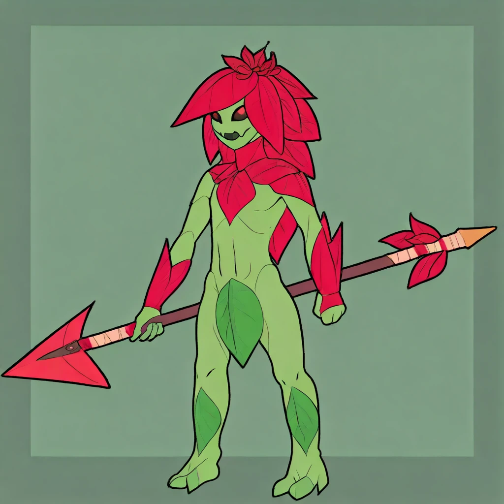 flora fauna, plant humanoid, green skin, leaf hair, solid eyes, fangs