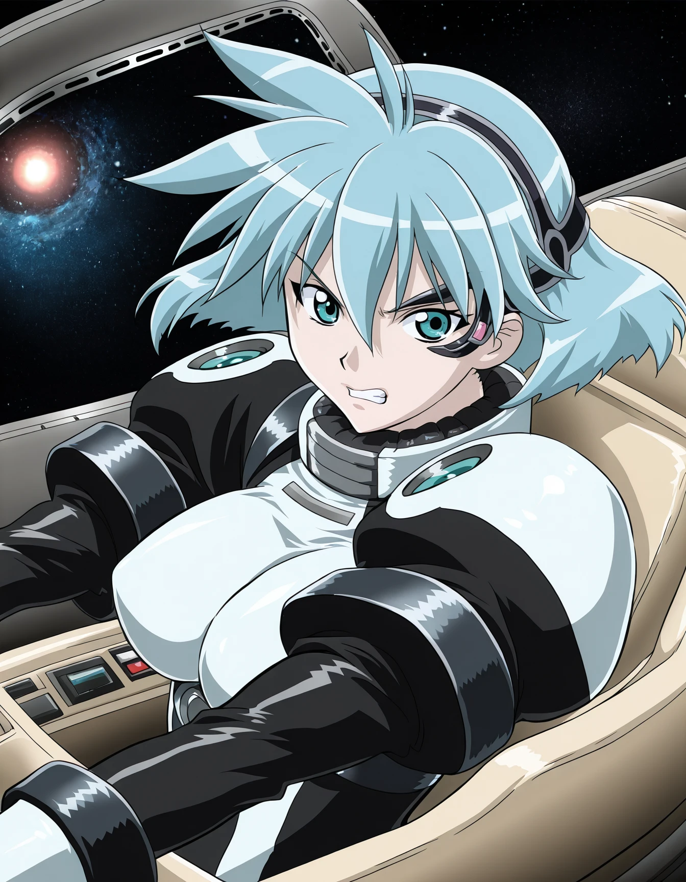 • meia gisborn, (blue hair:0.6), pilot suit, headgear