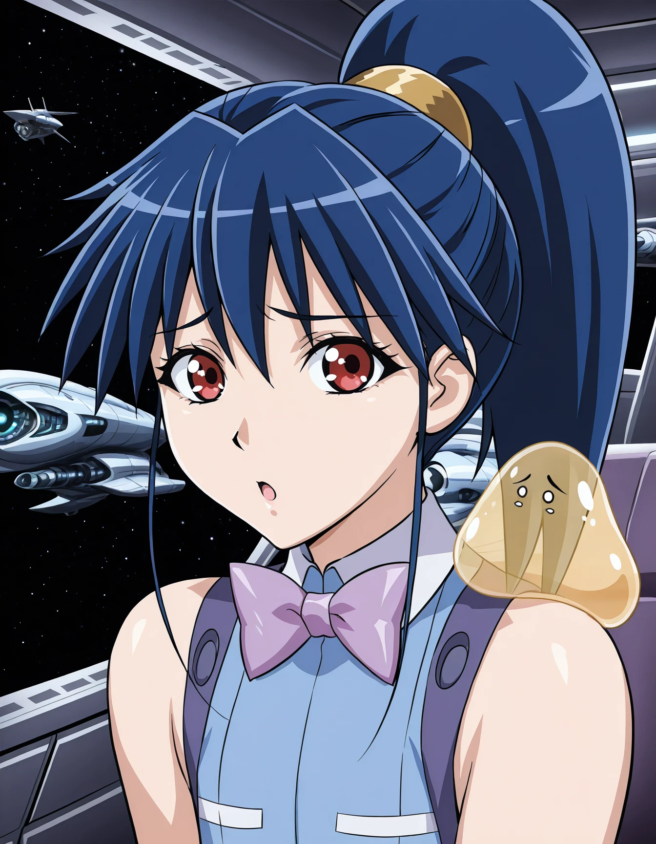 • misty cornwell, (blue hair:0.6), hair tie, sleeveless dress, bowtie, belt