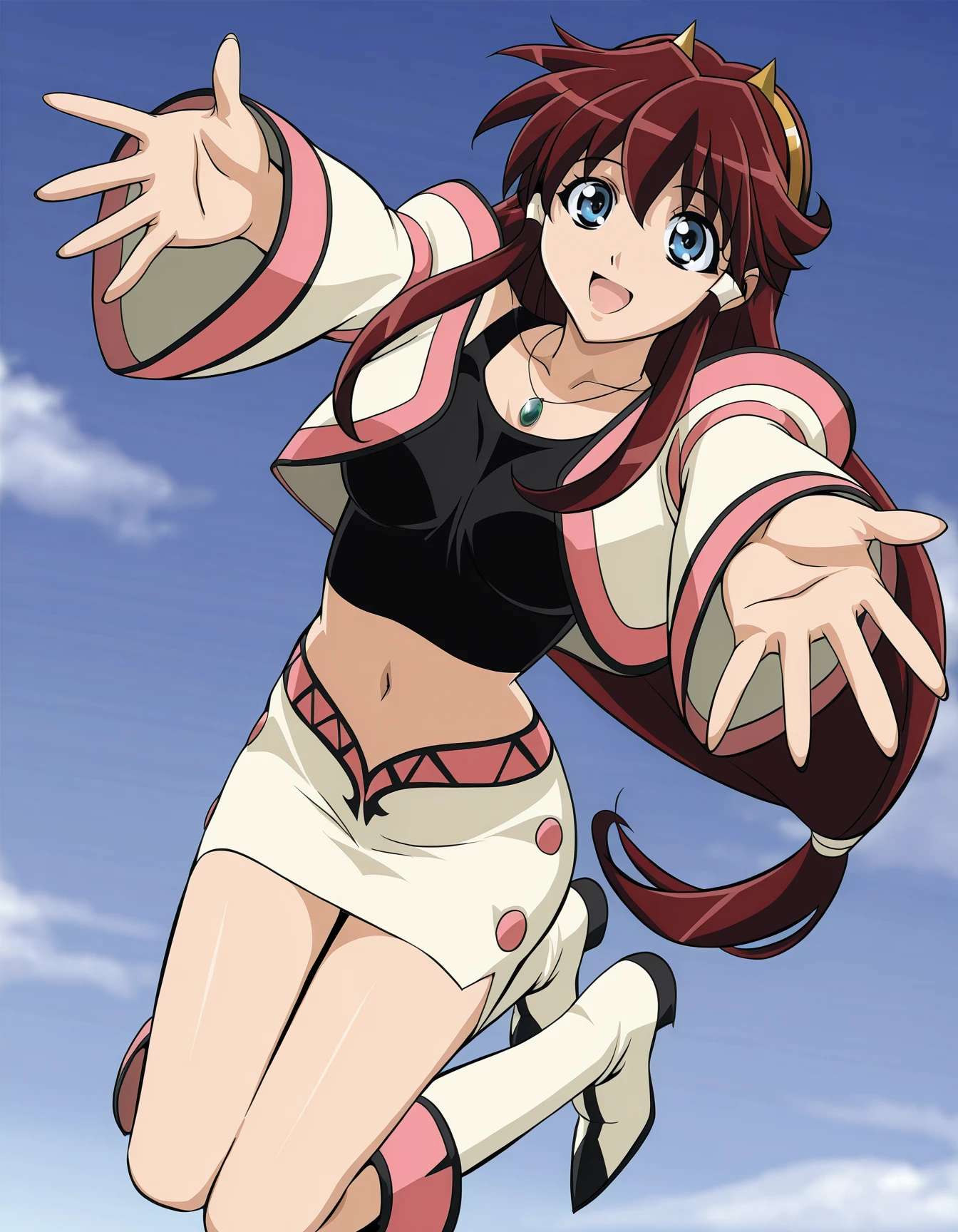dita liebely, hair tubes, necklace, midriff, cropped jacket, tank top, miniskirt, knee boots