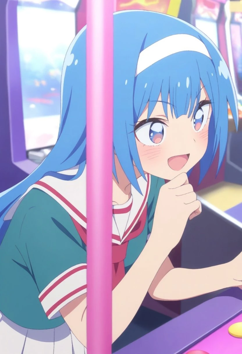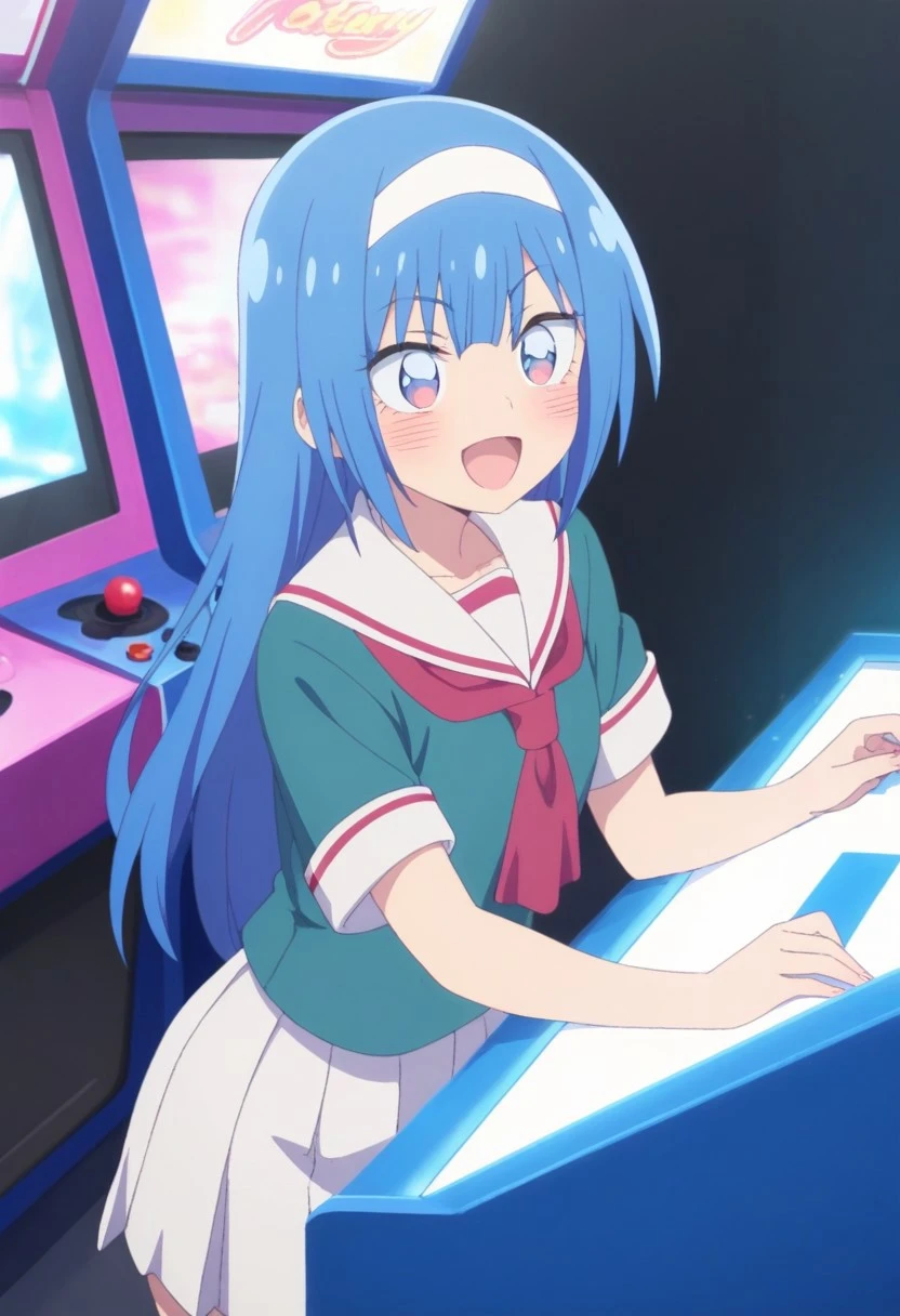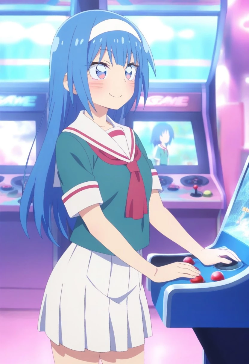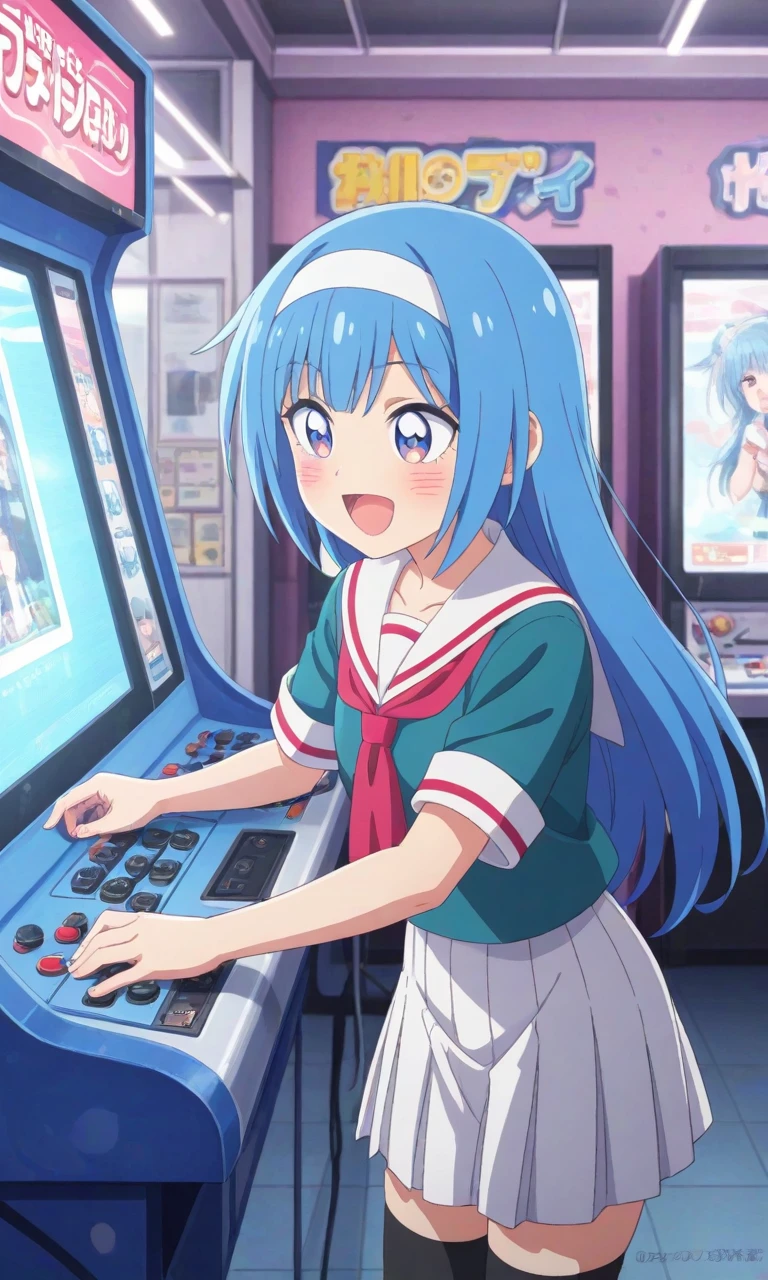 hotaru katsuragi,light blue hair,white headband,blue eyes,teal school uniform, serafuku, sailor collar, red neckerchief, short sleeves, white skirt, pleated skirt, black thighhighs, brown loafers