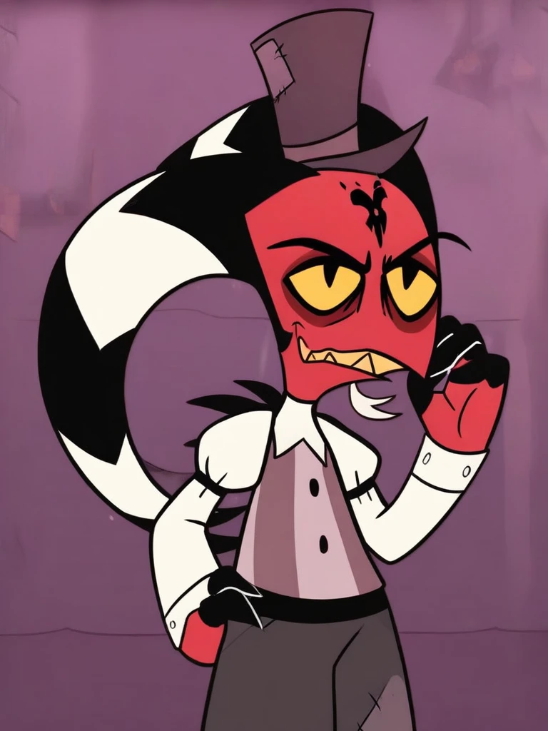 Crimson - Moxxie Dad crimson_HB, colored skin, red skin, colored sclera, yellow sclera, short hair, white hair, horns, demon horns, black and white horns, demon tail, pinstripe shirt, pinstripe pants, fedora, navy blue coat, long sleeves, red shirt, high collar, fingerless gloves, dark blue pants
