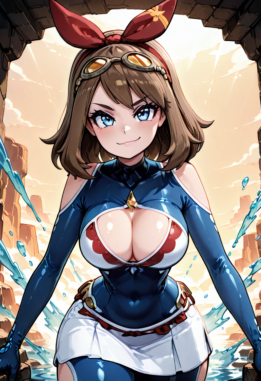 zzMayAquaCitron, blue eyes, brown hair, red bow hairband, medium hair, goggles on head, blue bodysuit, white skirt, large breasts, bare shoulders,