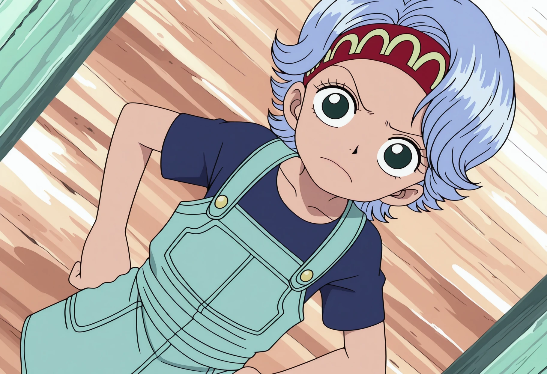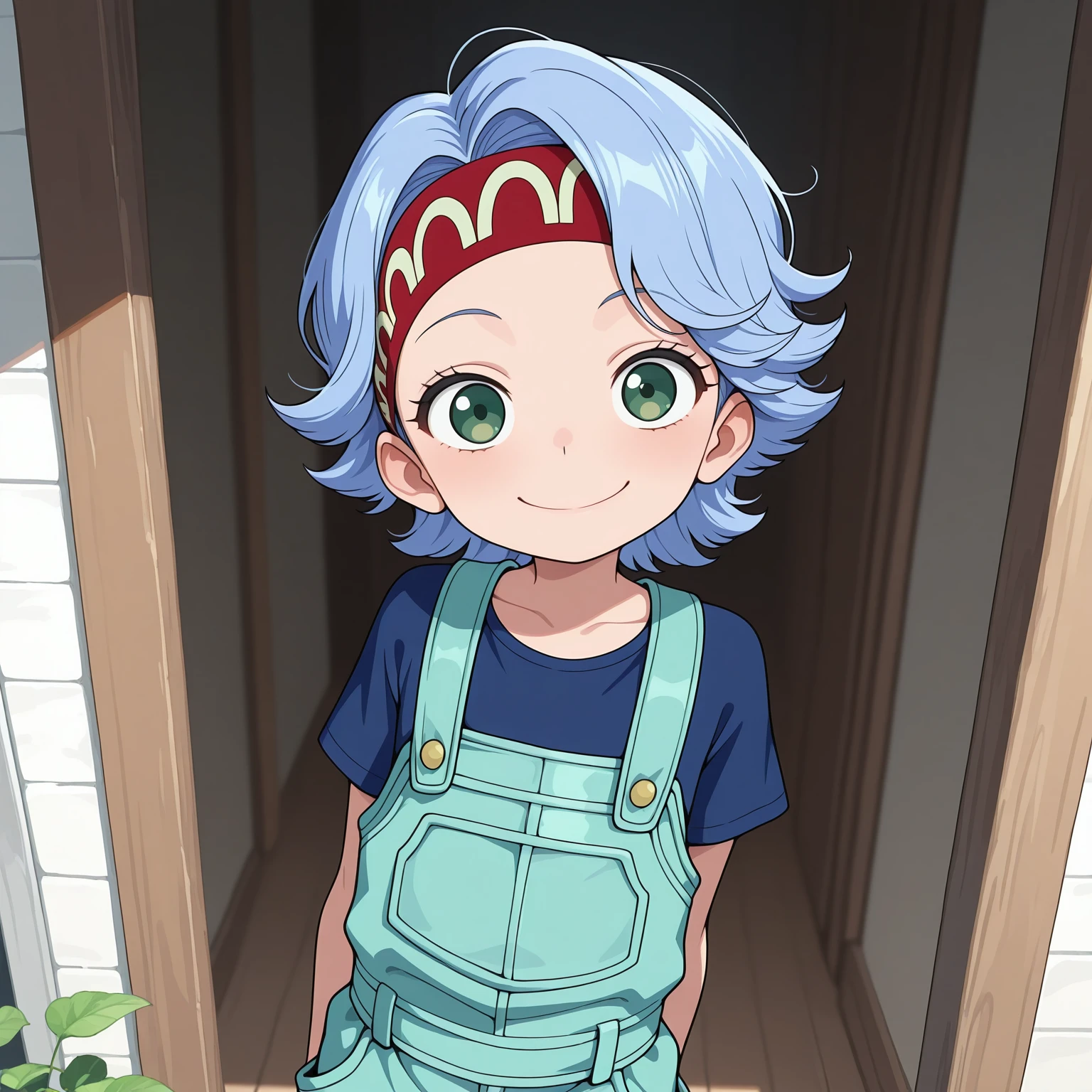 nojiko, retro artstyle, green eyes, short hair, blue hair, headband, blue shirts, overalls, overall skirt,