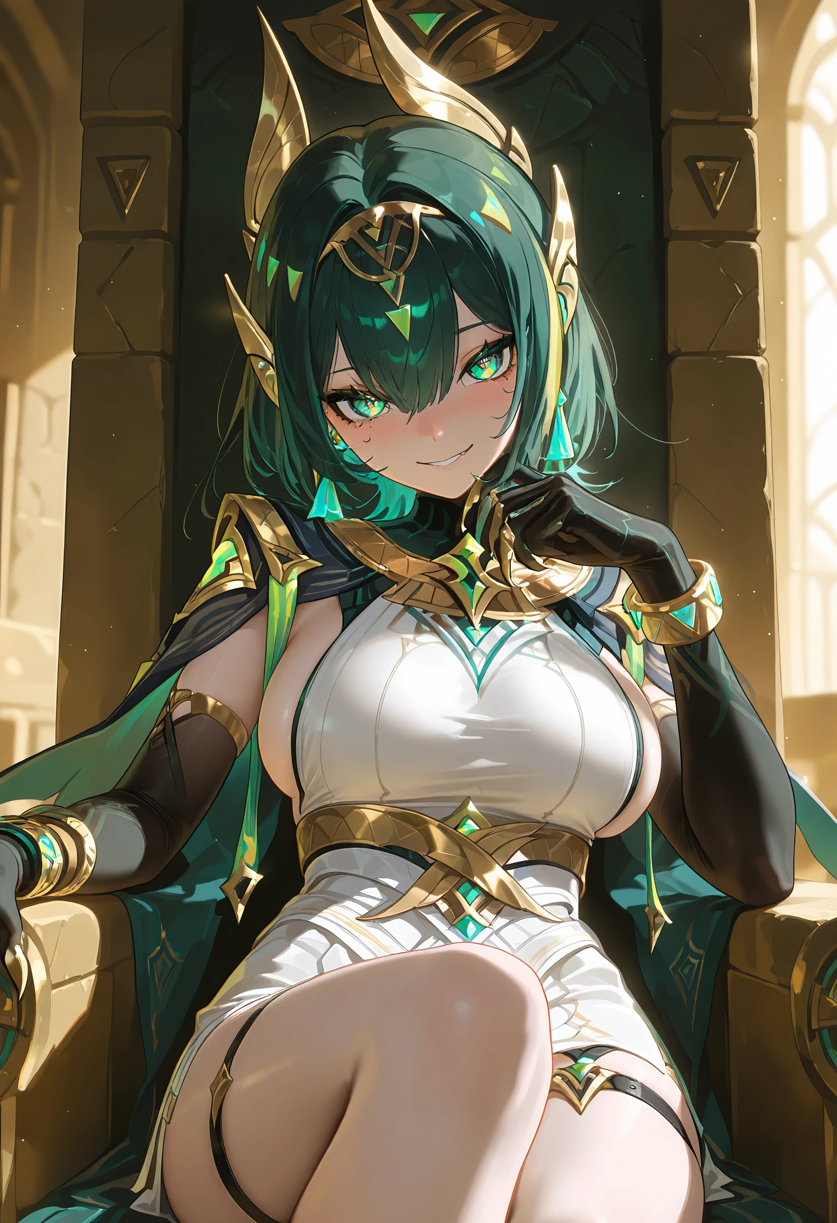 jewelry, black gloves, elbow gloves, cape, bracelet, bare legs, thigh strap, sideboob, white skirt, thighlet, claws, Egyptian clothes, dress,