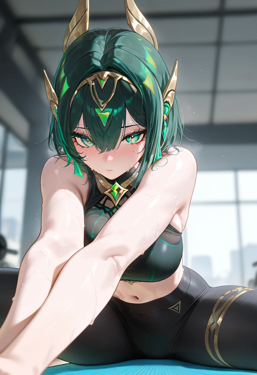 Tags for her look: 1girl, solo, ?????????????, green eyes, multicolored hair, earrings, green hair, medium hair, hair between eyes, multicolored eyes, two-tone eyes, mechanical ears, pale skin,