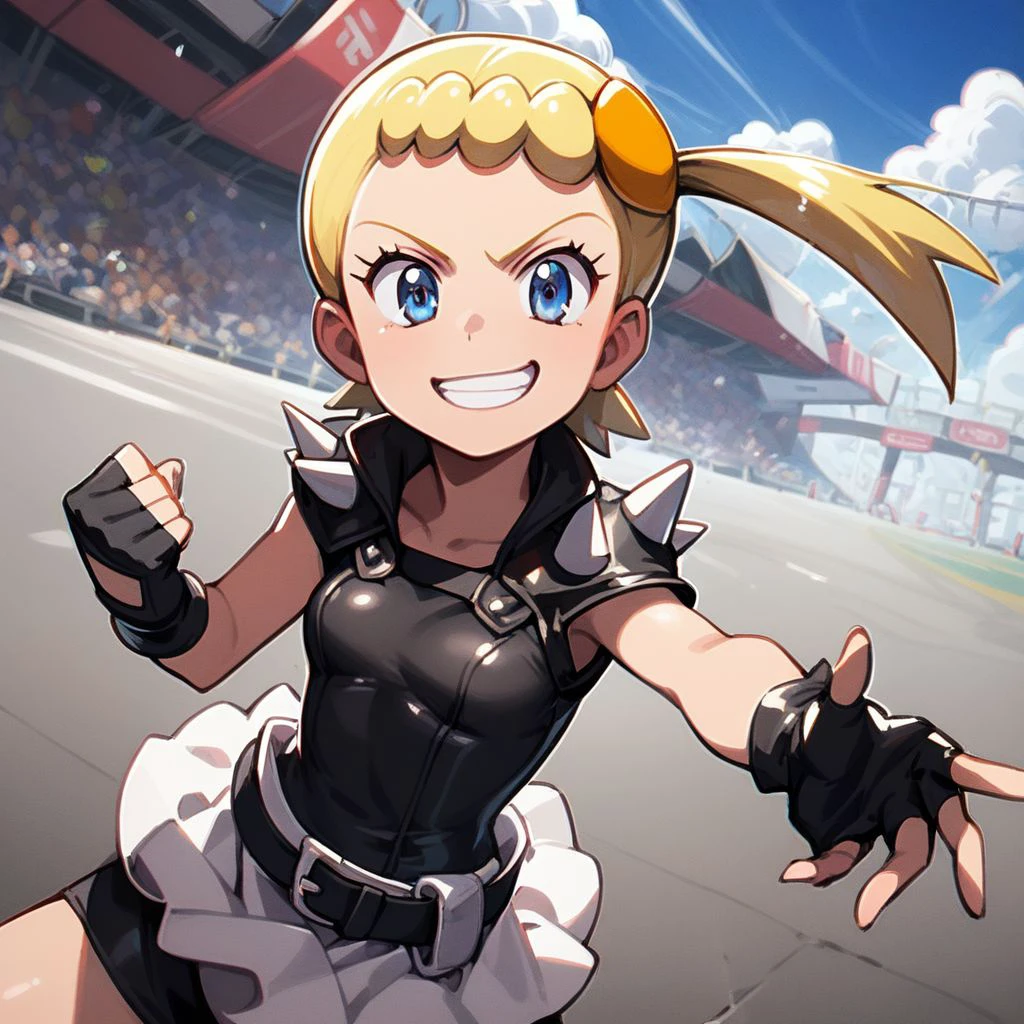 bonnie, blue eyes, blond hair, side ponytail, brown shirt, bike shorts