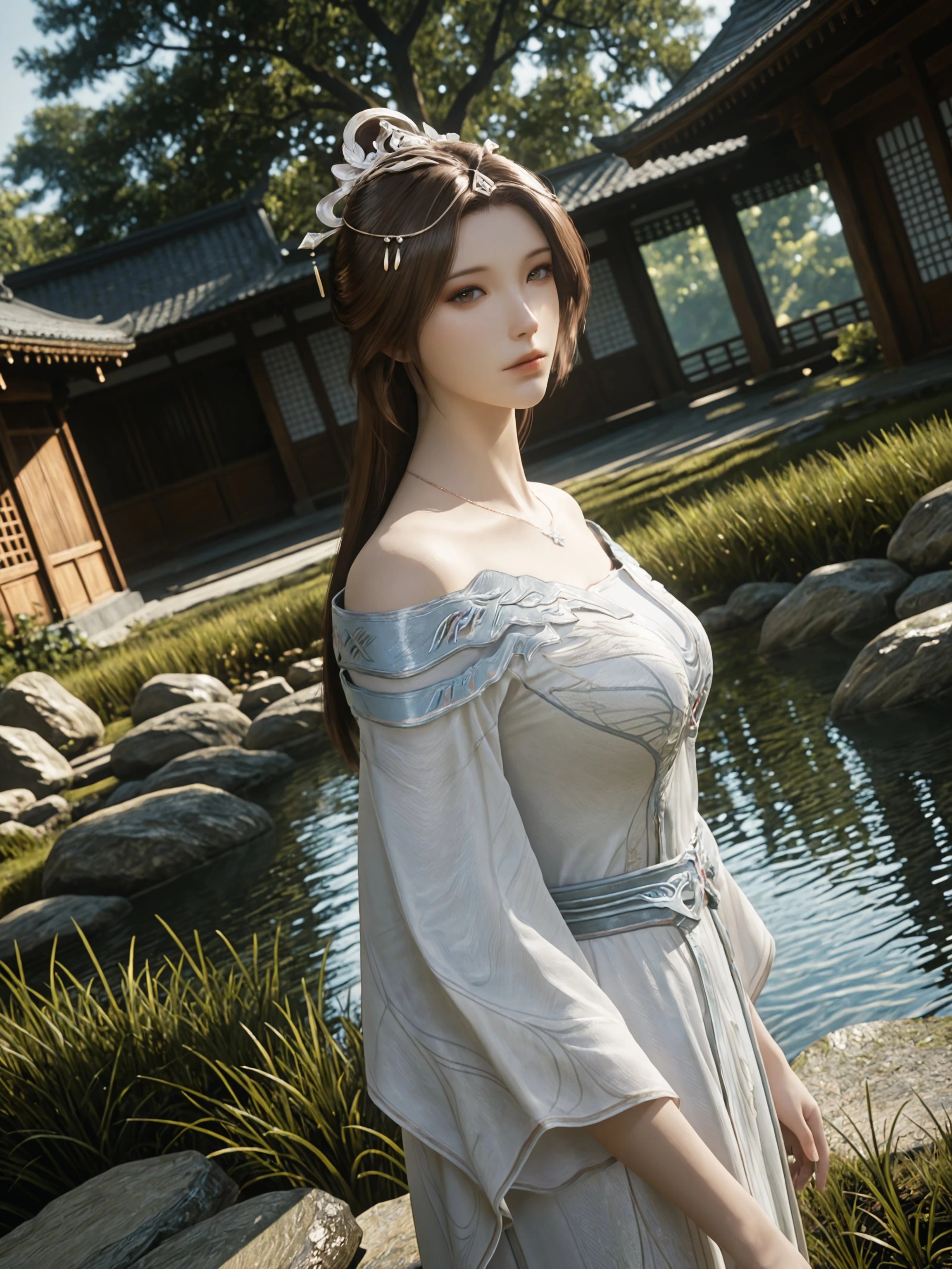 1girl, solo, dress, long hair, brown hair, hair ornament, white dress, jewelry, necklace, bare shoulders,