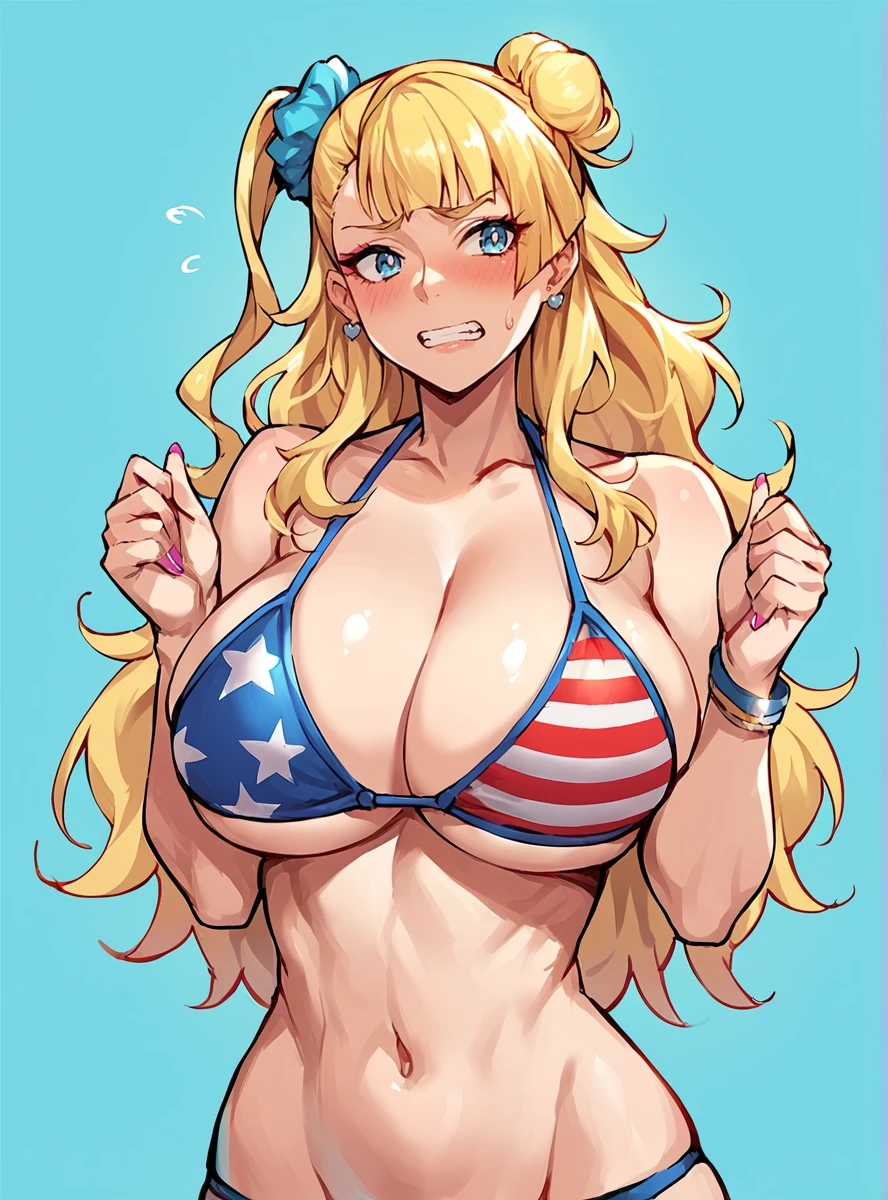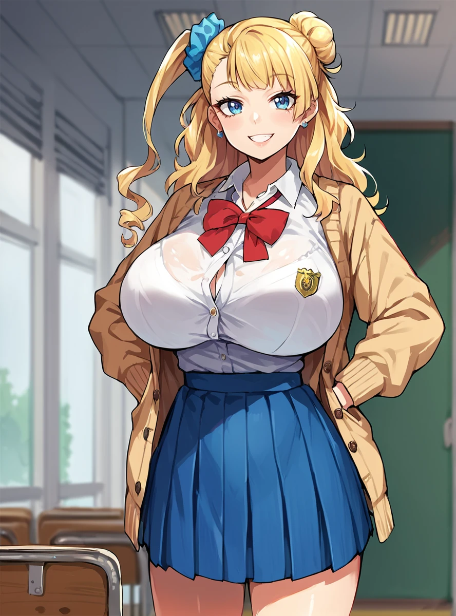 Prompt: long hair, asymmetrical hair, blonde hair, blue eyes, hair bun, scrunchie, single side bun, jewelry, earrings, school uniform, skirt, cardigan indoors, smile, huge breast,