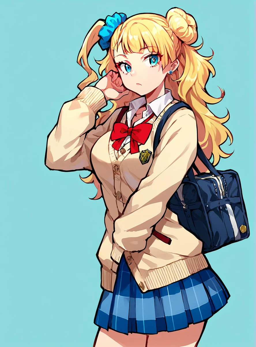 long hair, asymmetrical hair, blonde hair, blue eyes, hair bun, scrunchie, single side bun, jewelry, earrings, school uniform, skirt, cardigan , , huge breast,