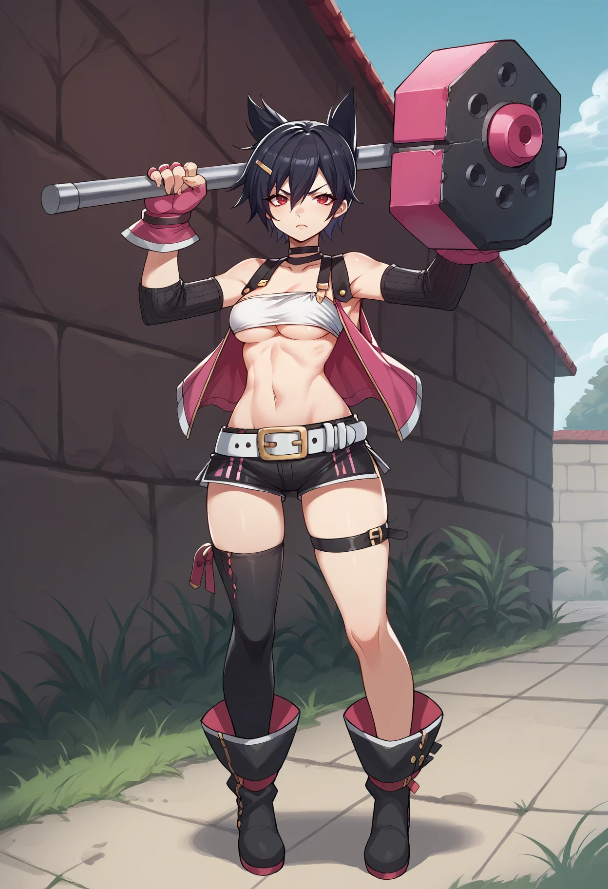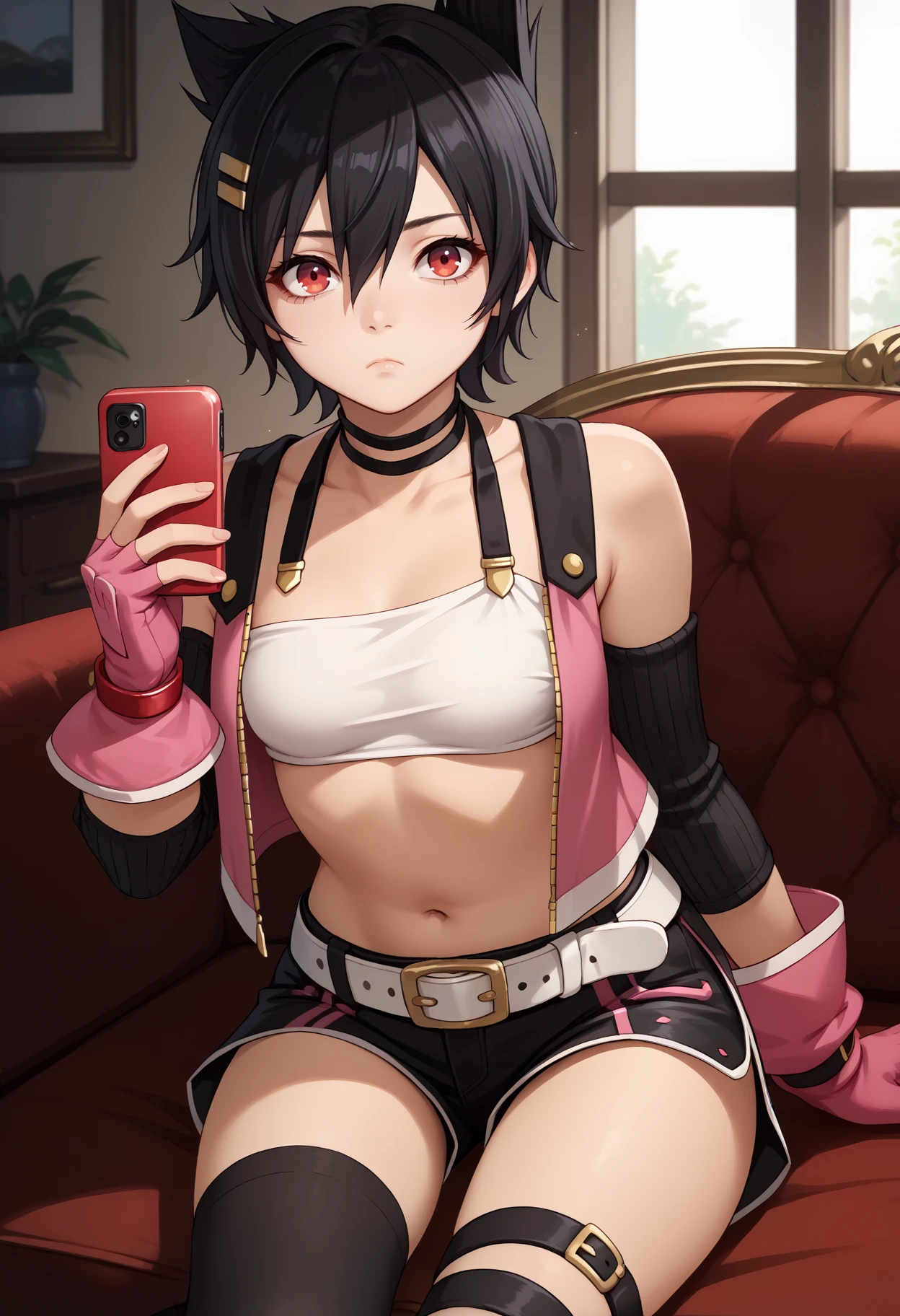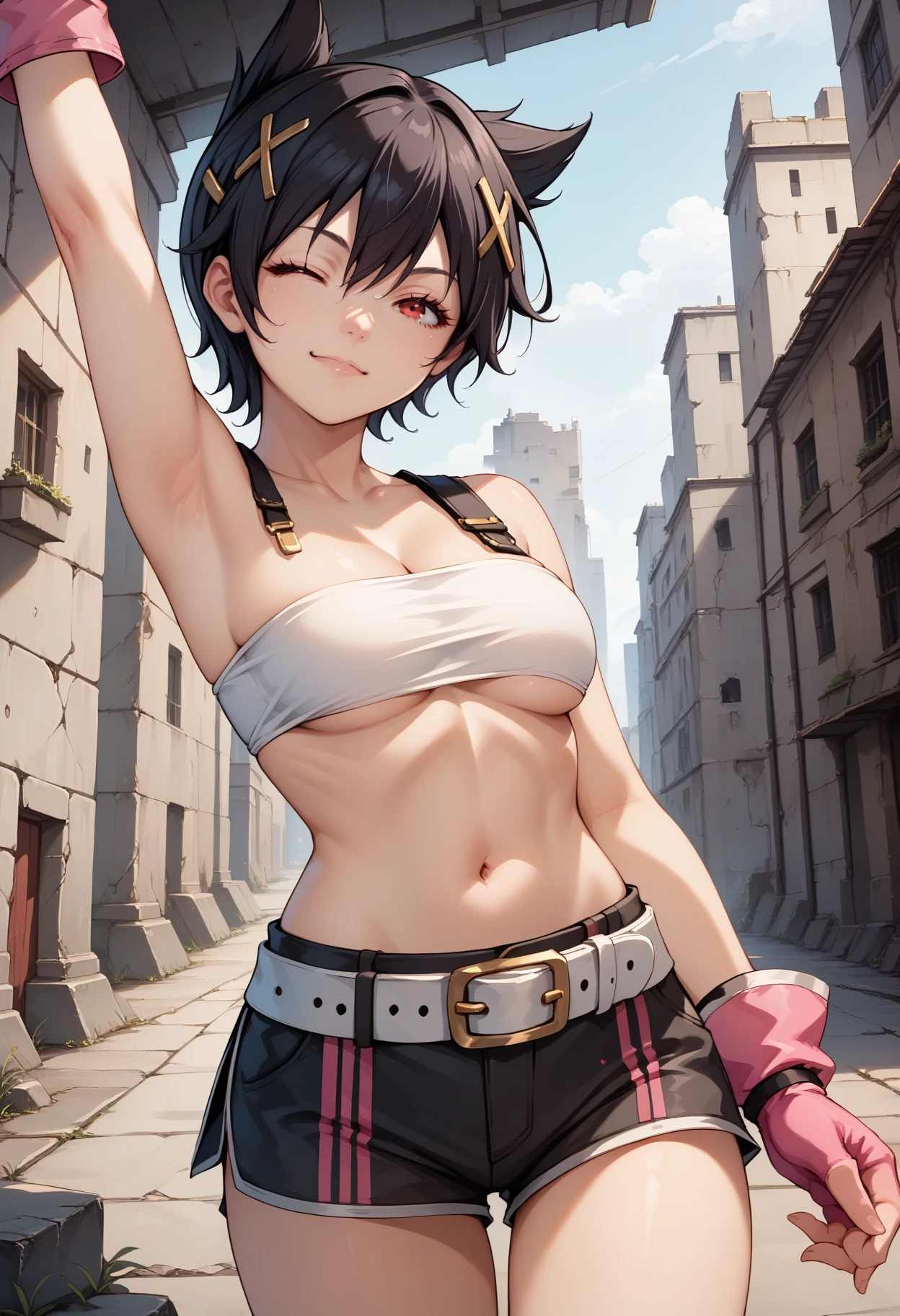 kozuki, black hair, short hair, x hair ornament, red eyes, black choker, white bandeau, underboob, bare shoulders, pink vest, open vest, detached sleeves, pink gloves, fingerless gloves, black short shorts, white belt, black thighhighs, single thighhigh, thigh strap