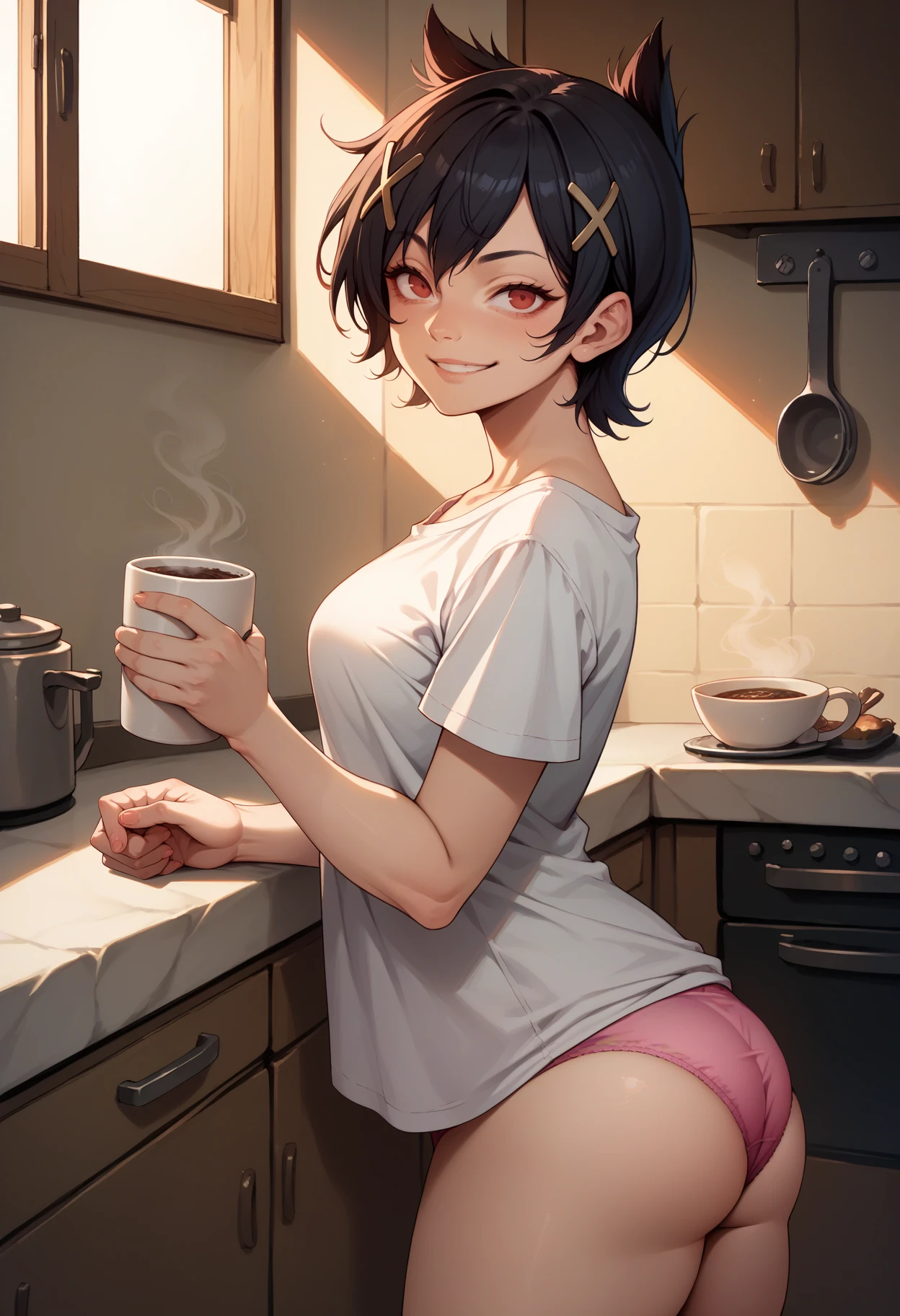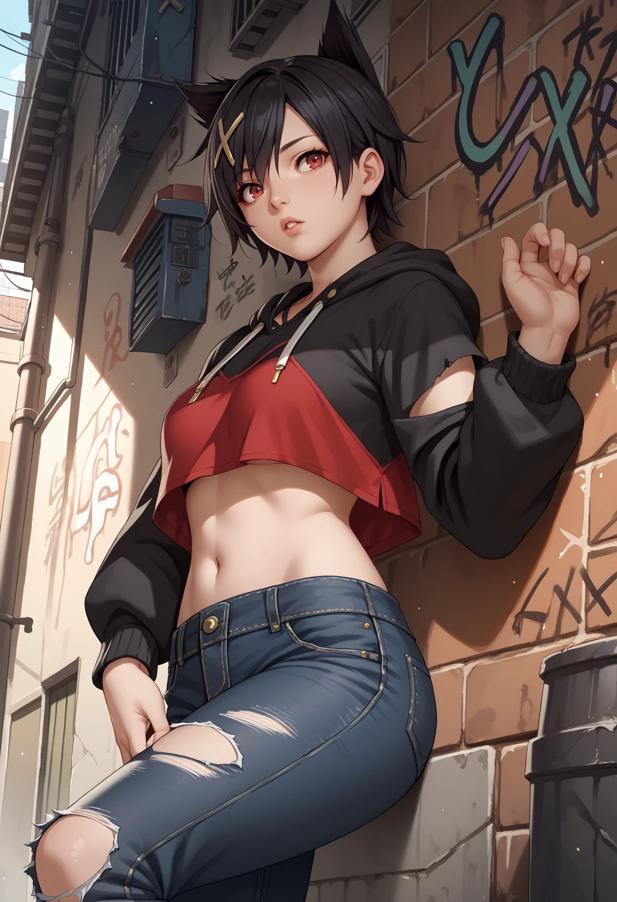 • Default appearance: kozuki, black hair, short hair, x hair ornament, red eyes, black choker, white bandeau, underboob, bare shoulders, pink vest, open vest, detached sleeves, pink gloves, fingerless gloves, black short shorts, white belt, black thighhighs, single thighhigh, thigh strap