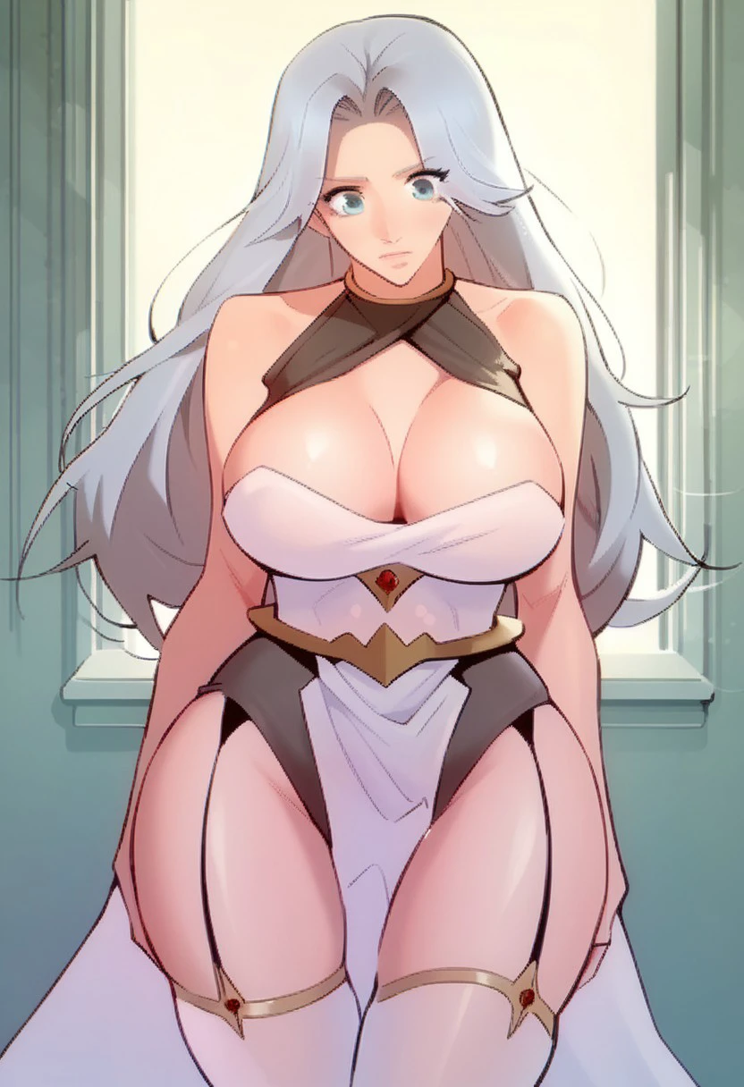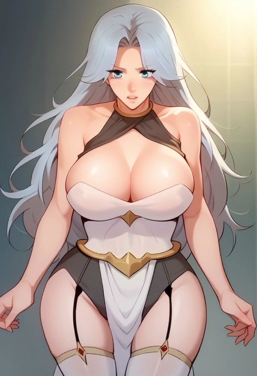 halterneck, cleavage, bare shoulders, leotard, pelvic curtain, garter straps, thigh gap, white thighhighs,