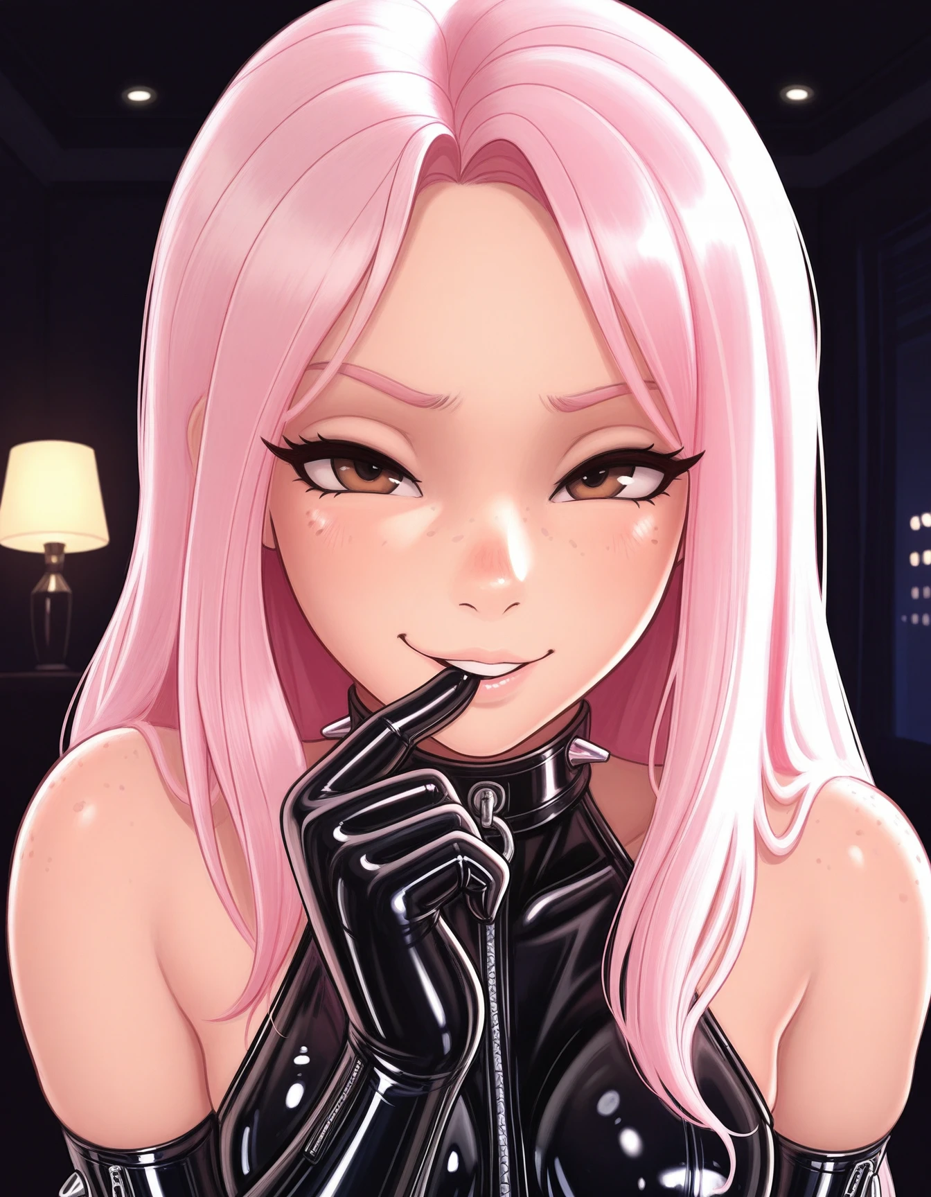 xbellex, pink hair, long hair, brown eyes, freckles