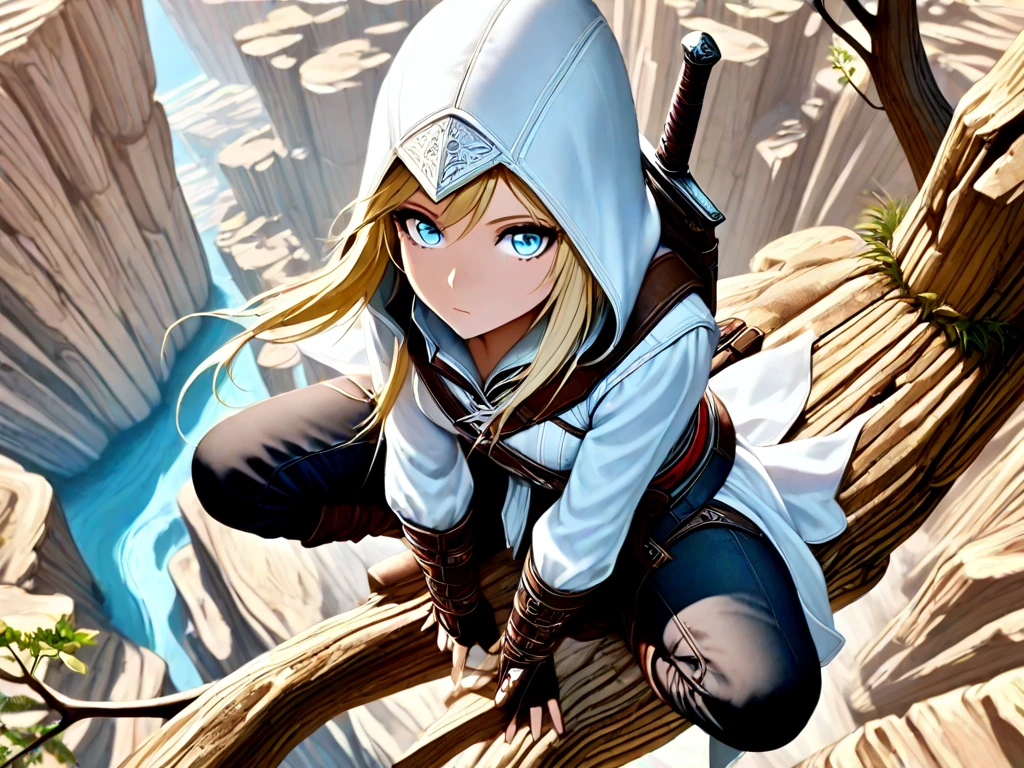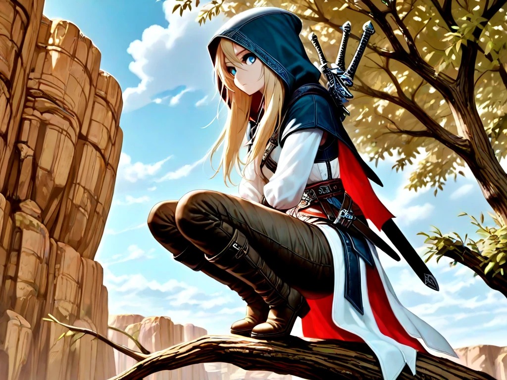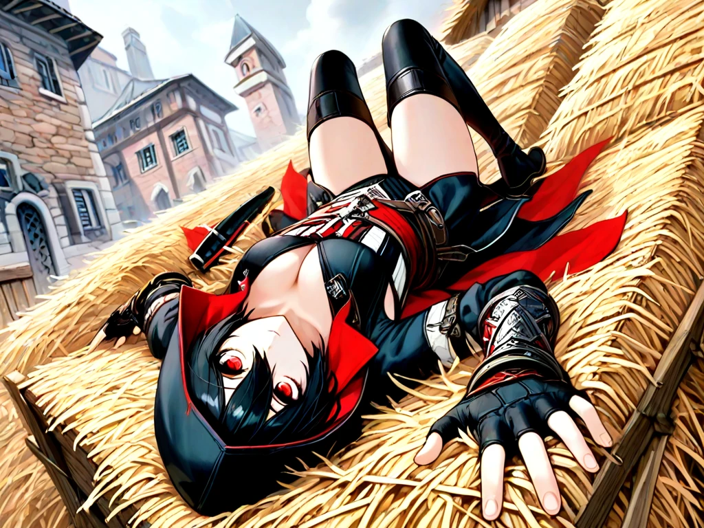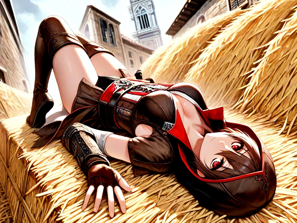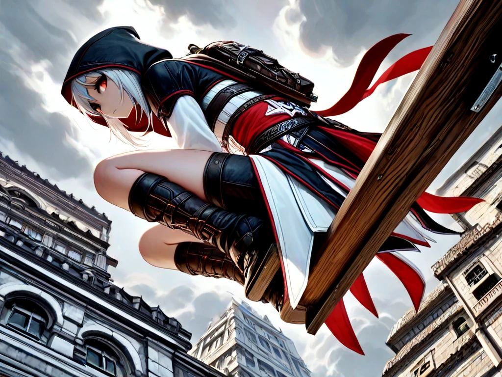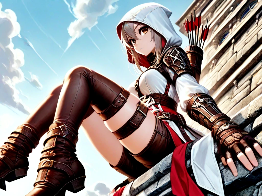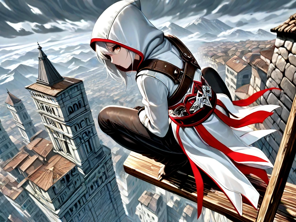 leap of faith, falling, 1girl, hood, boots, midair, assassin, assassin's creed \(series\),