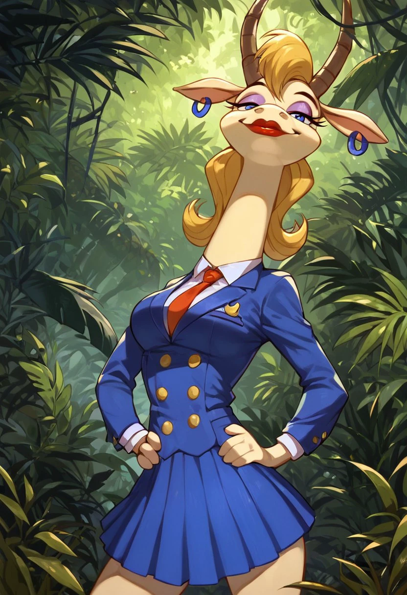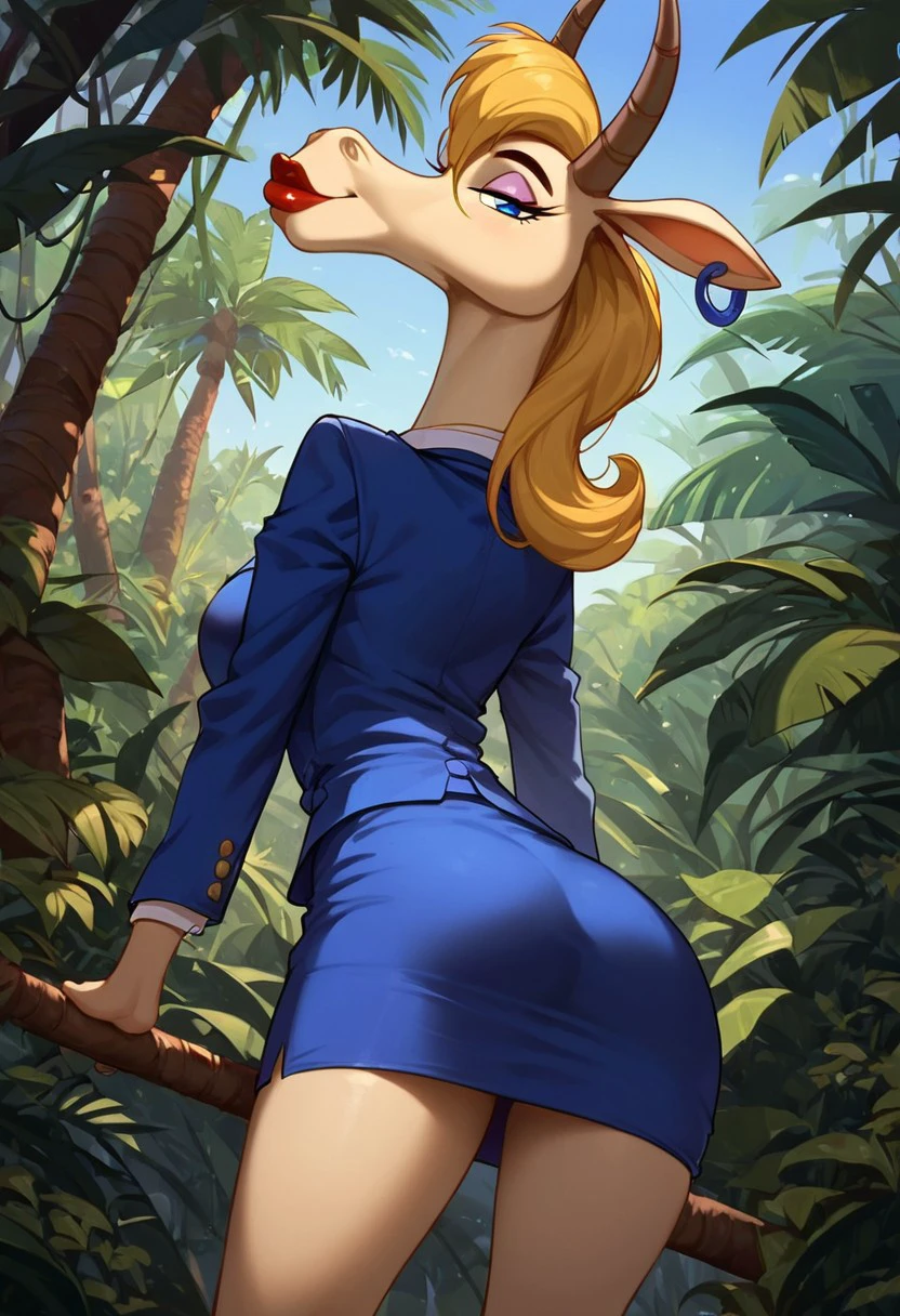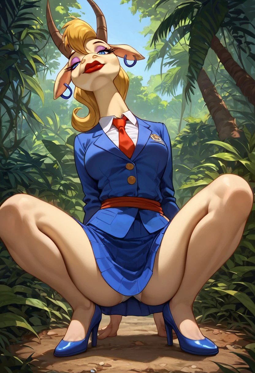 mary_antelope, 1girl, female furry, anthro, female antelope, yellow fur, brown horns, animal ears, blonde hair, eyelashes, blue eyes, makeup, pink eyeshadow, red lips, small blue hoop earings, blue office blazer (yellow buttons), red necktie, white shirt, blue skirt, blue high heels,