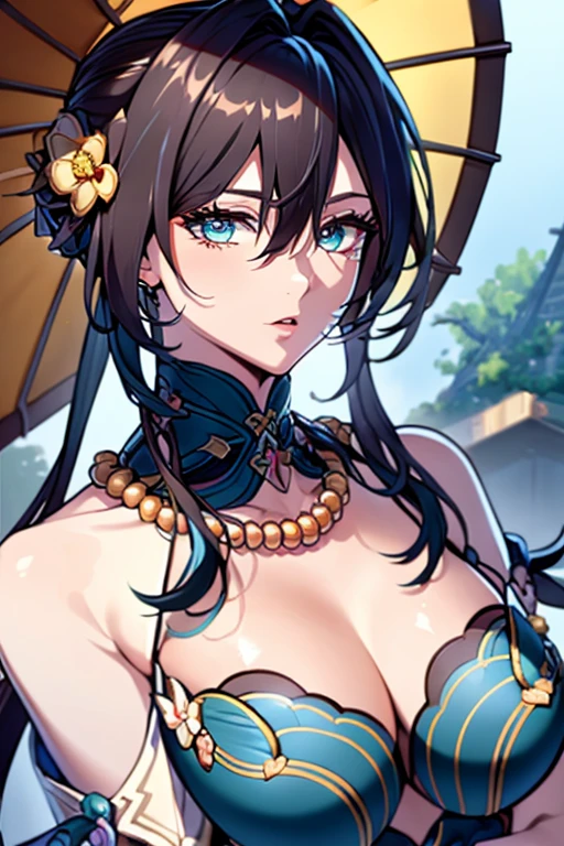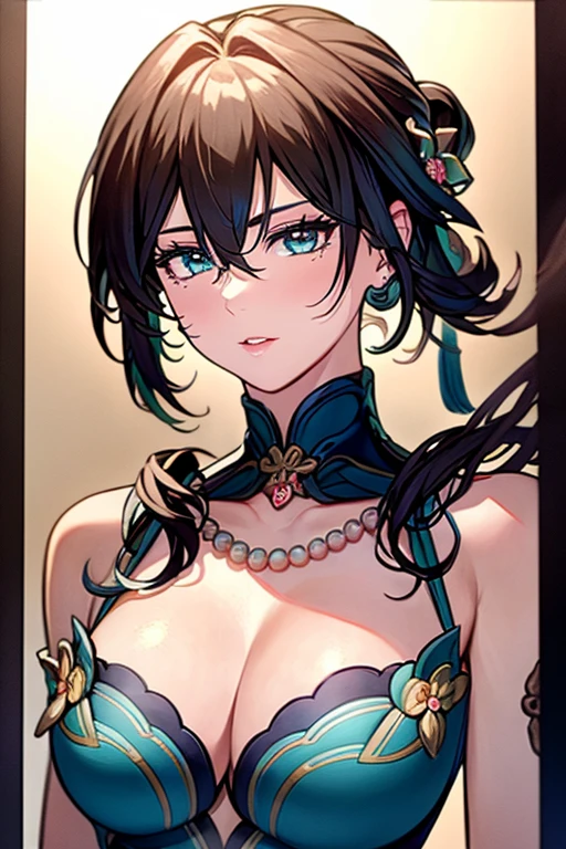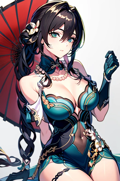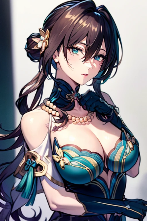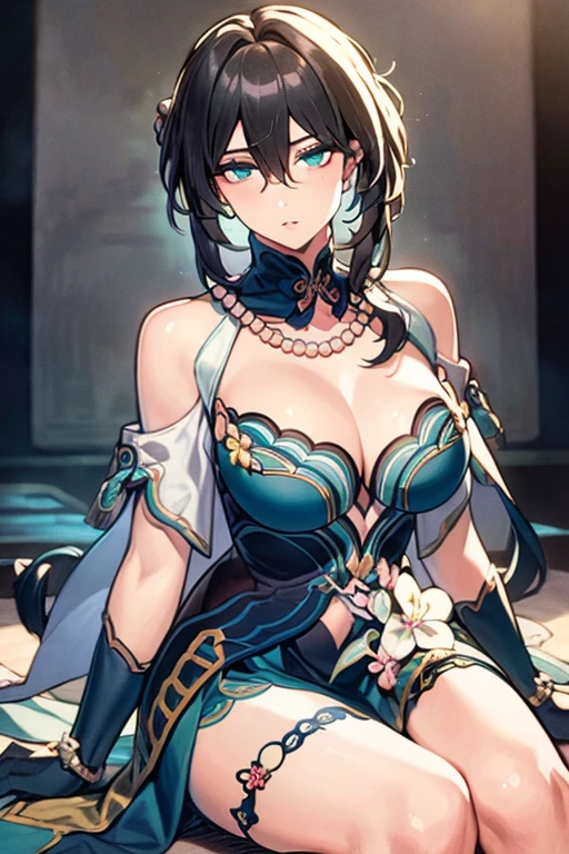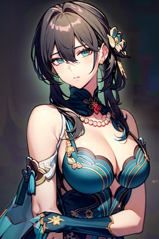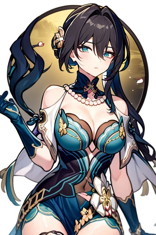 Black hair, bright blue eyes, pearl necklace, necklaces, blue Chinese clothing, blue gloves, blue high heels,