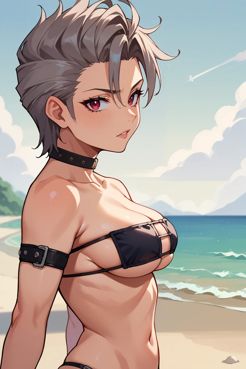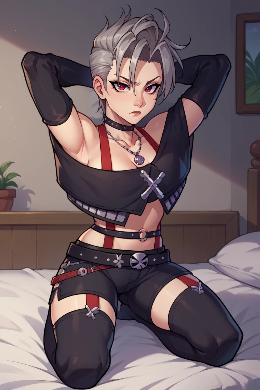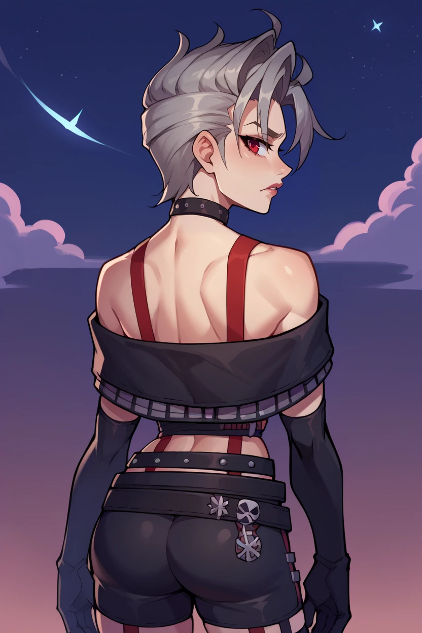 Add "choker, suspenders, necklace, off-shoulder shirt, black shirt, black gloves, midriff, belt, black shorts, black thighhighs" for her typical look.