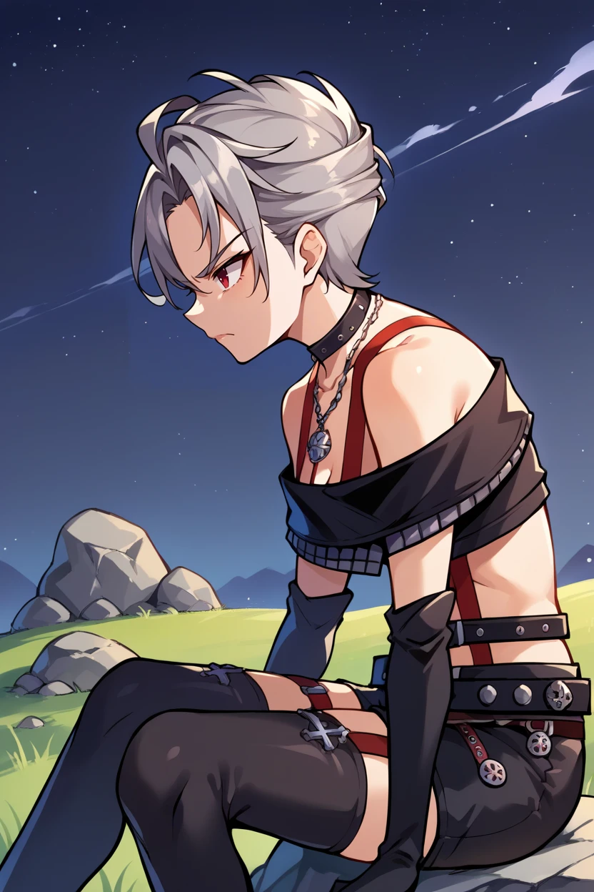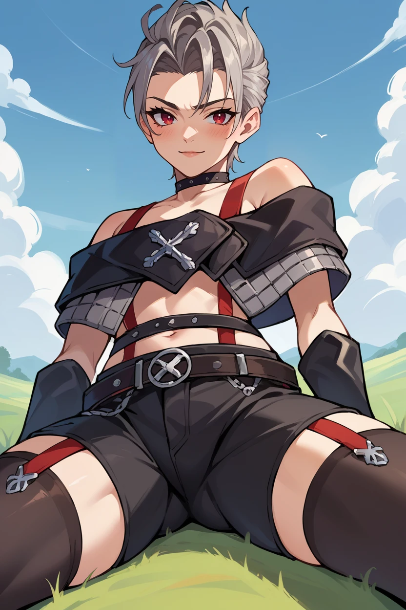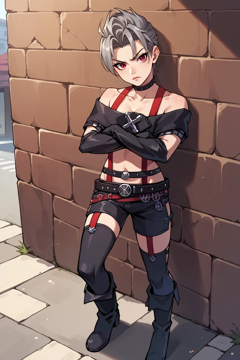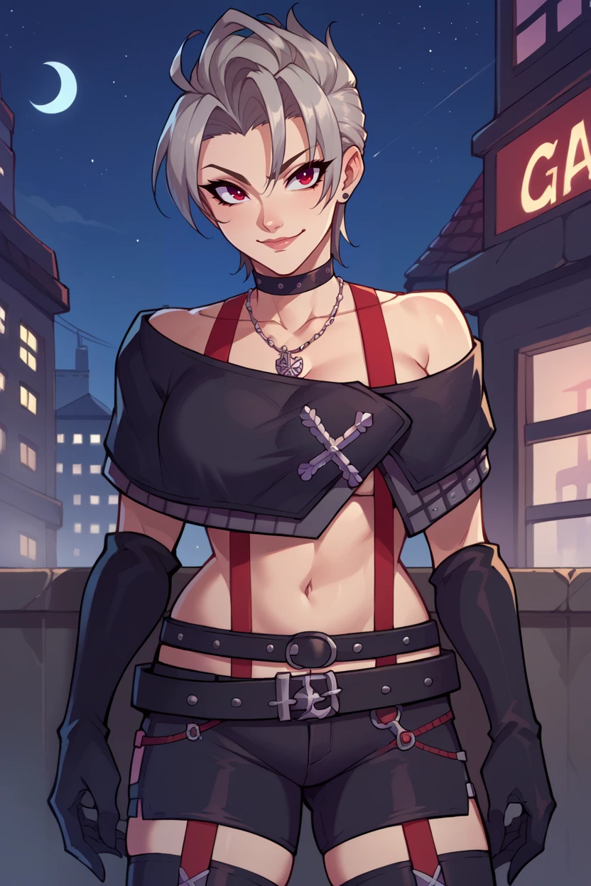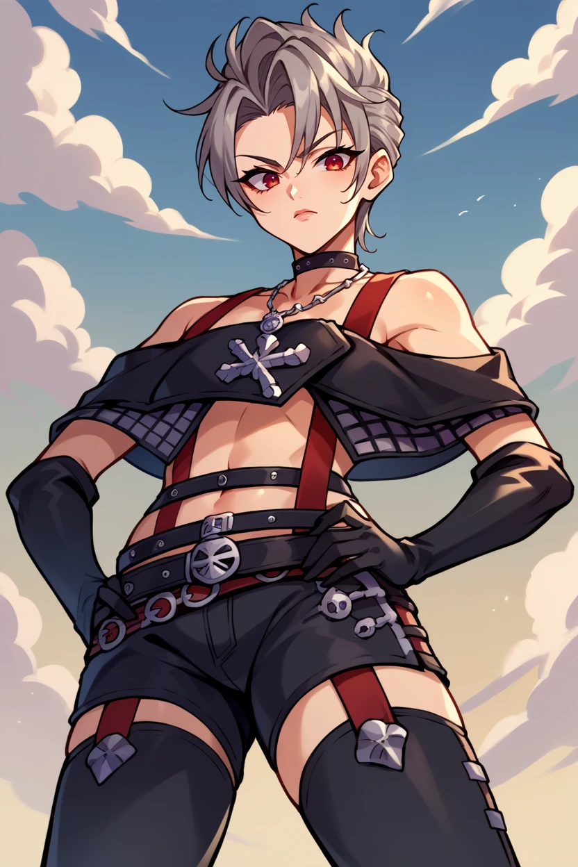 choker, suspenders, necklace, off-shoulder shirt, black shirt, black gloves, midriff, belt, black shorts, black thighhighs
