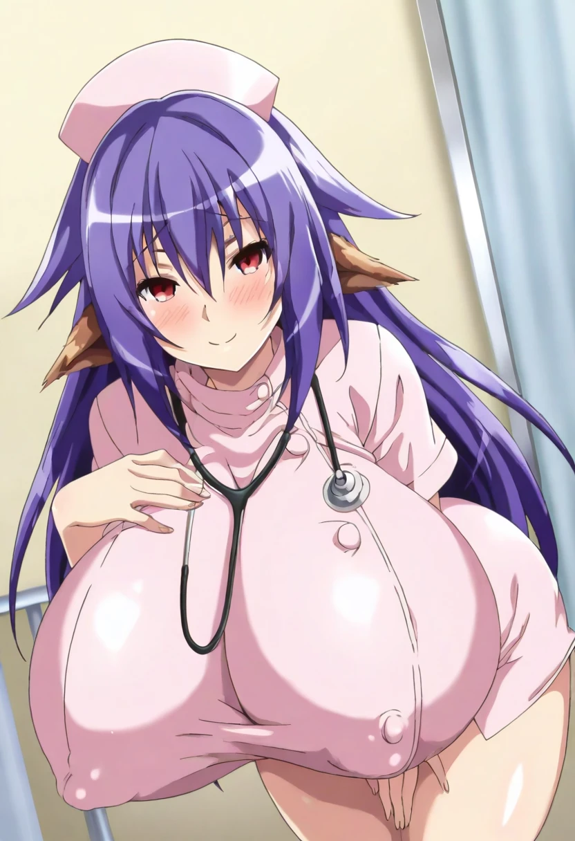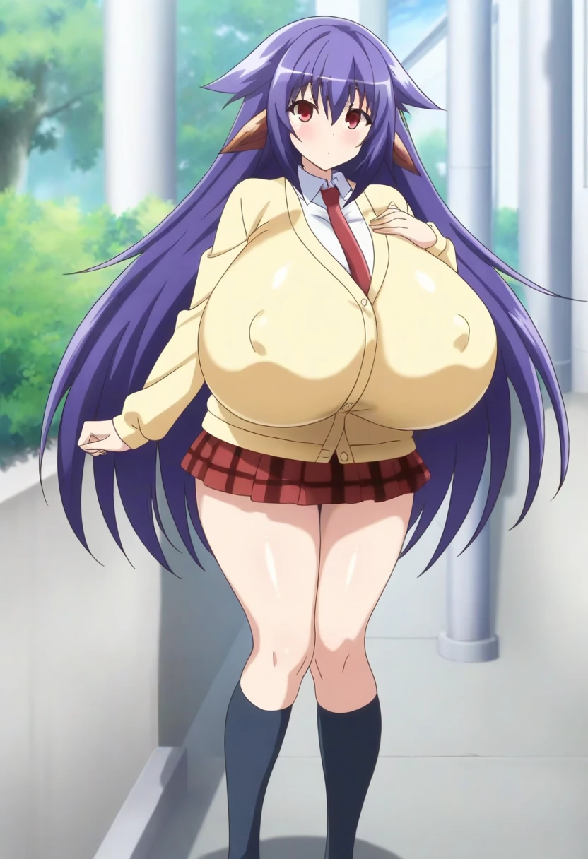 ayana,1girl,solo,gigantic breasts,pink jacket,zipper,cleavage,areola slip,animal ears,very long hair,purple hair,red eyes,looking at viewer,standing,covered nipples,black thighhighs,
