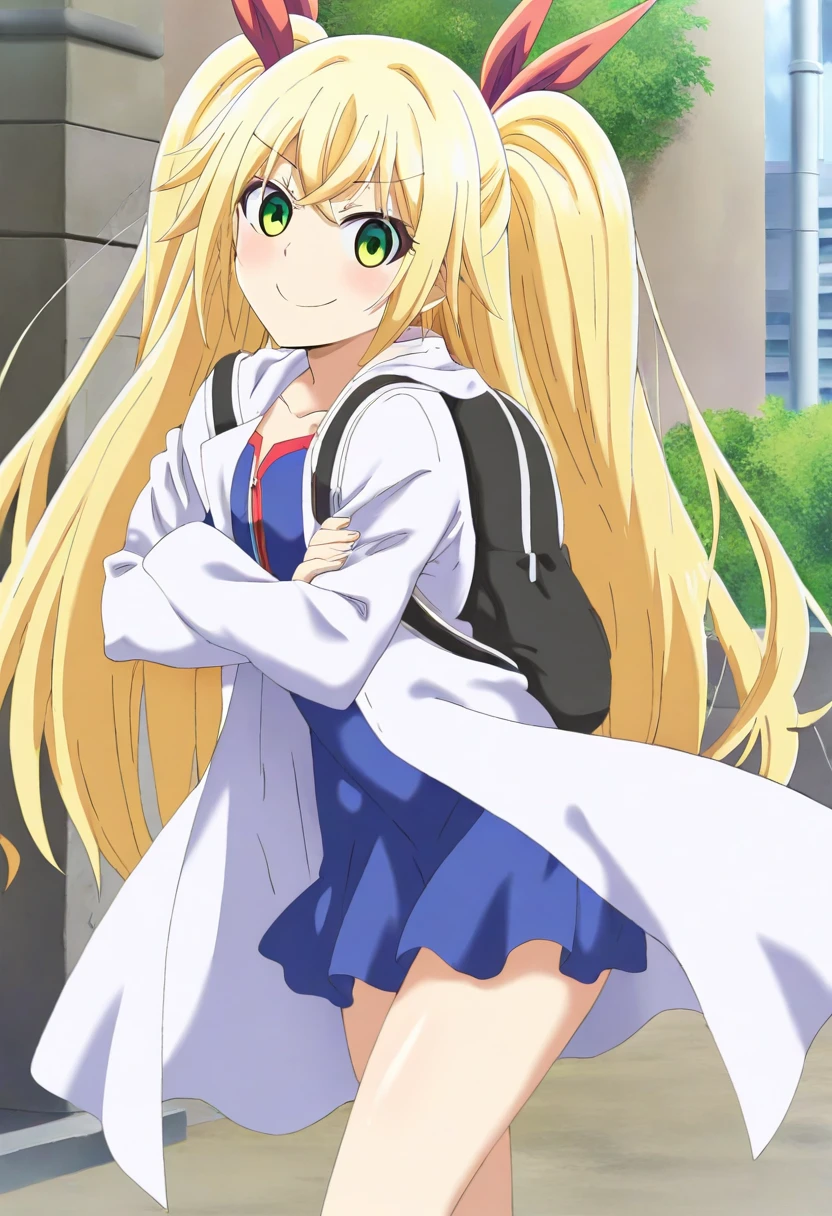 airi,1girl, solo,standing,white coat, blonde hair, twintails, long hair, green eyes, red ribbon, backpack,