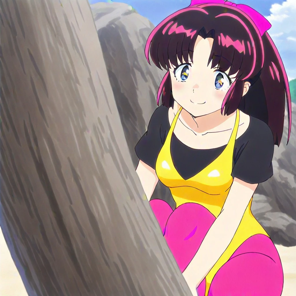 asuka mizunokoji \(uy\), dark red hair, long hair, ponytail, bangs, blue eyes, yellow leotard, black undershirt, pink pantyhose, heels, large breasts, 1girl, solo