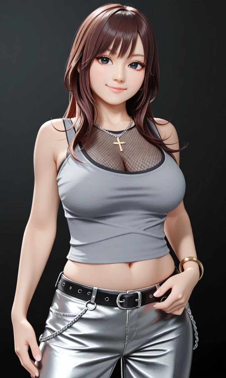 nami tamaki,1girl, solo, black hair,black eyes, long hair, bangs, belly, jewelry, belly button, short top, belt, cross necklace, shirt, sleeveless, tank top, bare shoulders, makeup,belt, bracelet, pants,Silver pants denim pants ,large breasts,