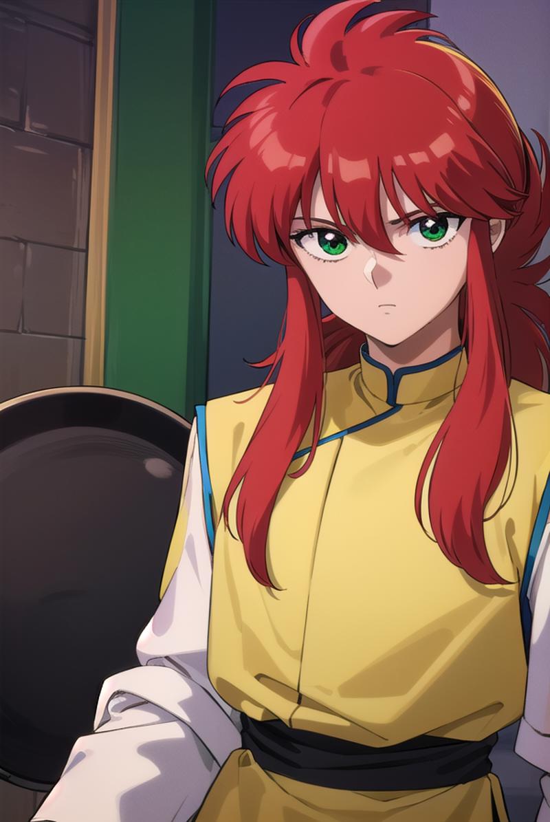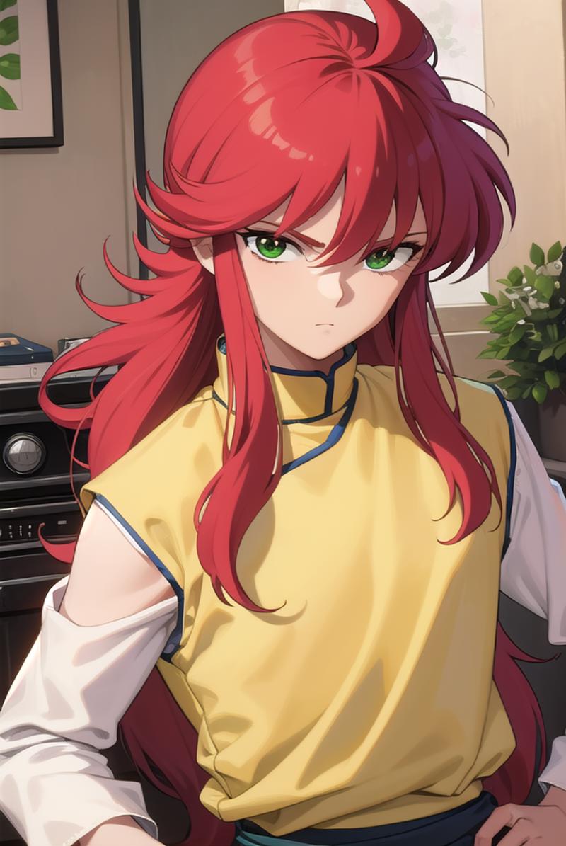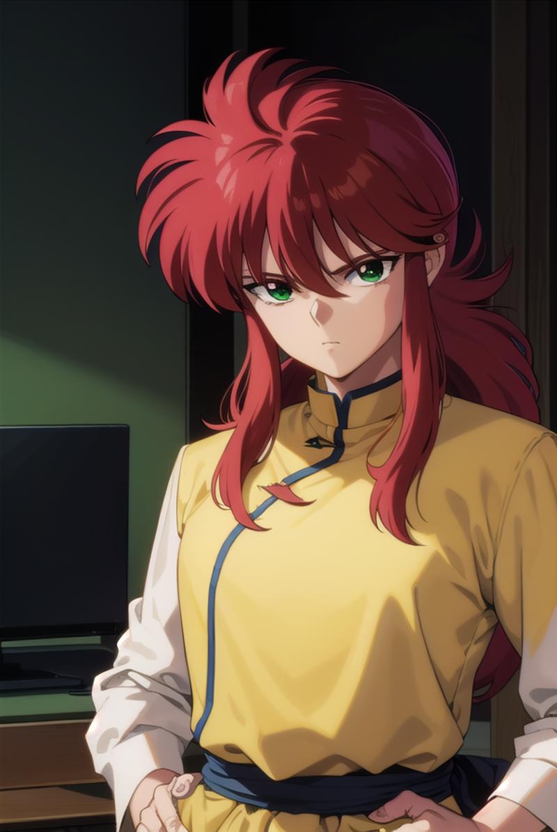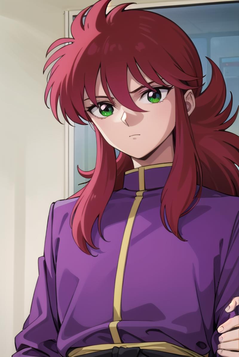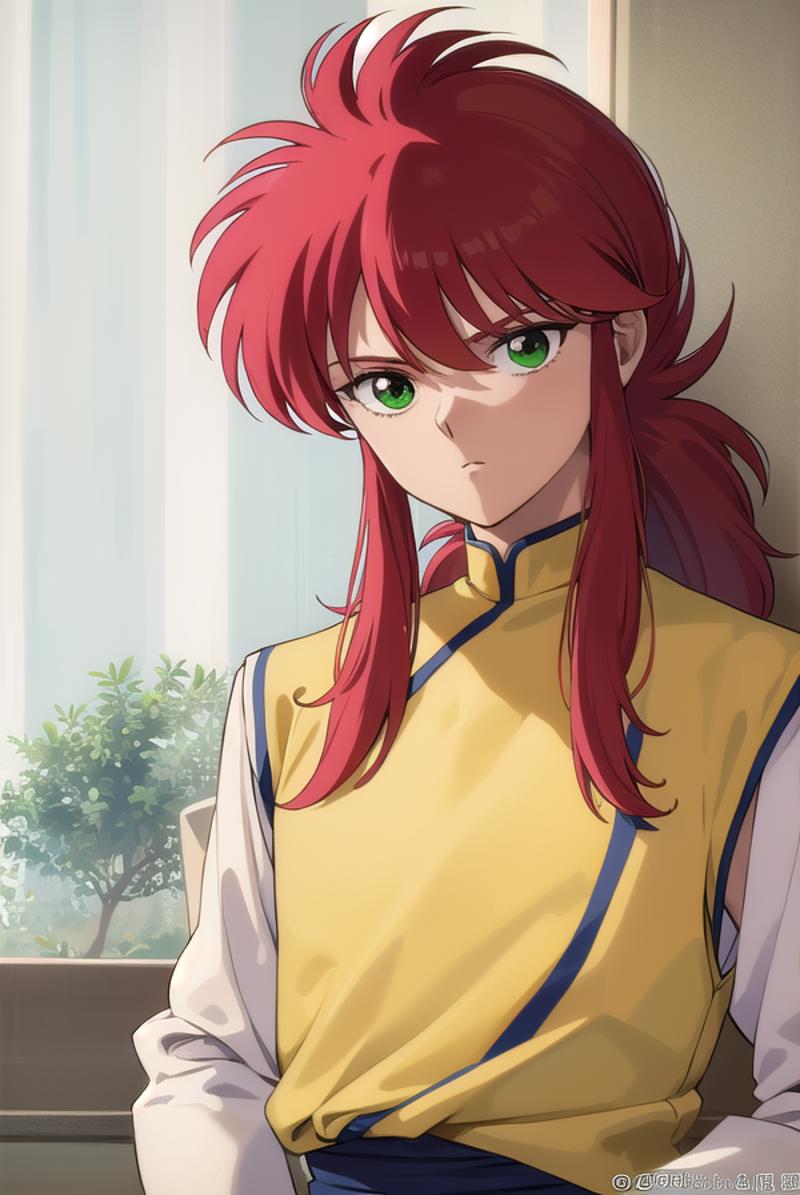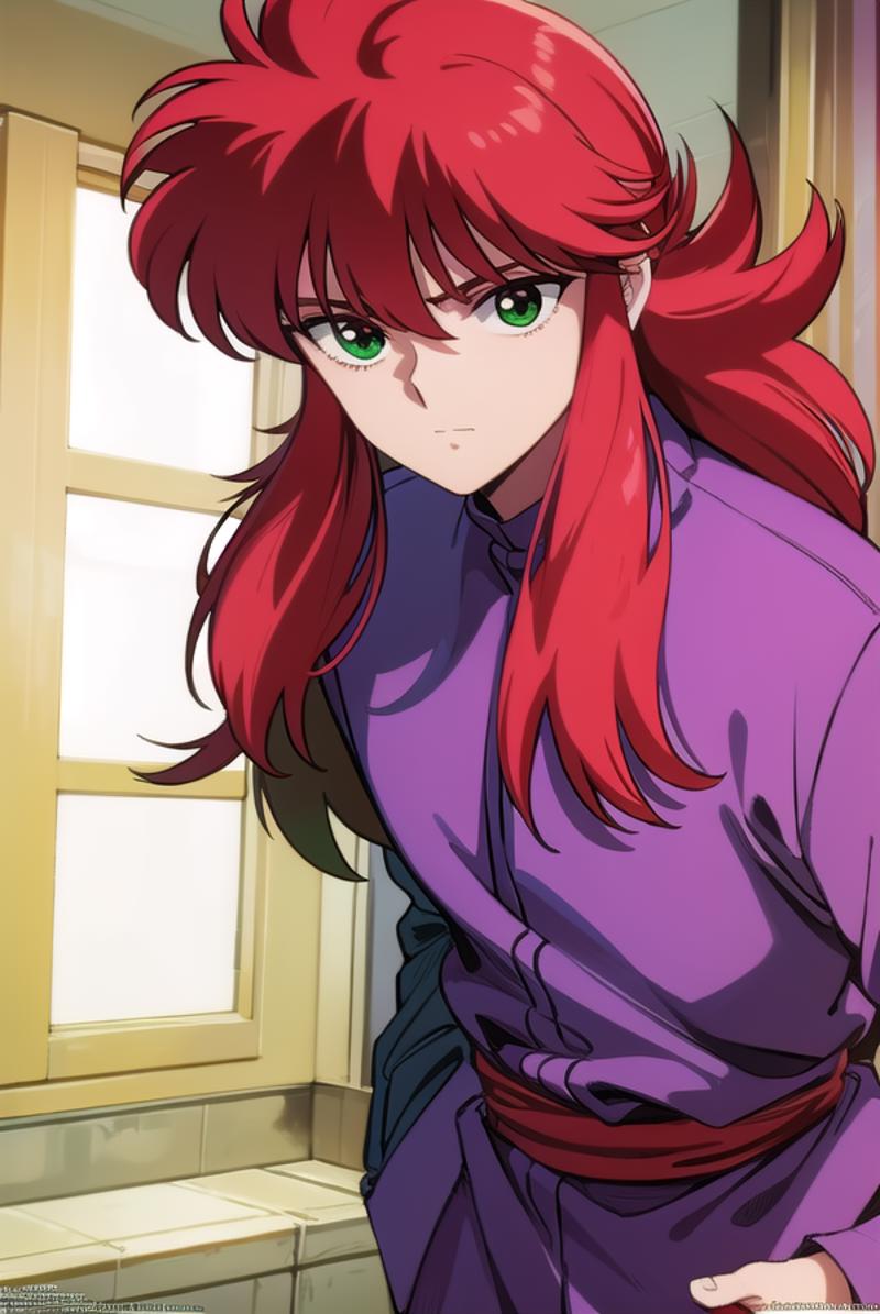 kurama, long hair, red hair, bangs, (green eyes:1.5), (retro artstyle:1.5), 1990s \(style\),