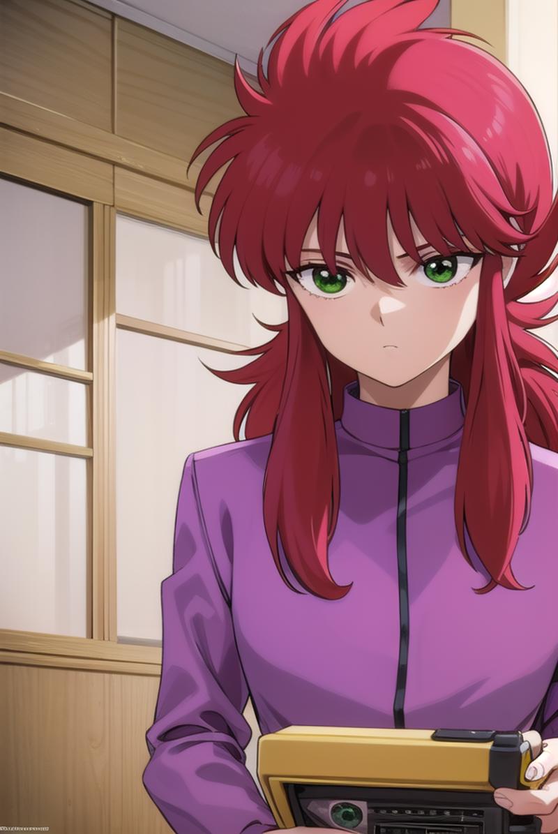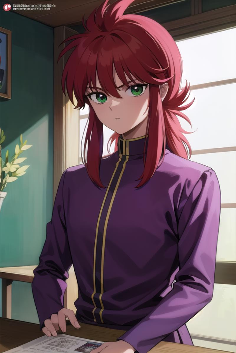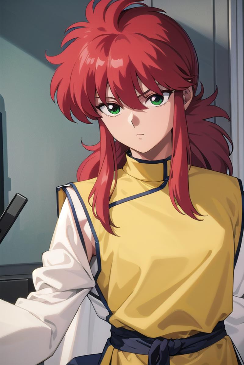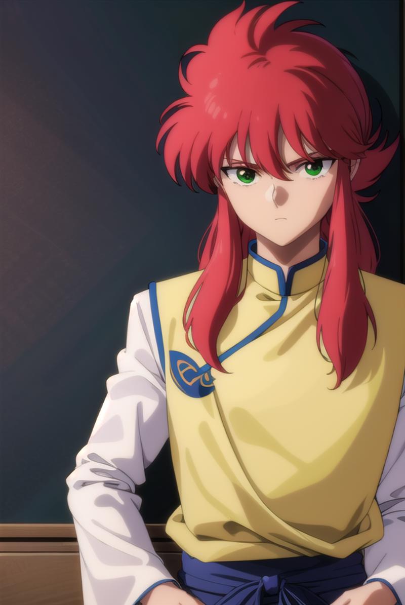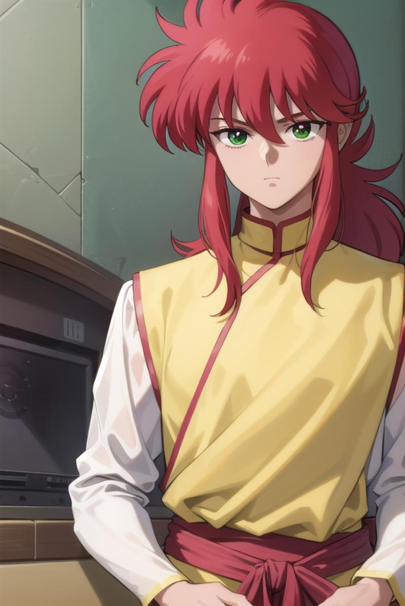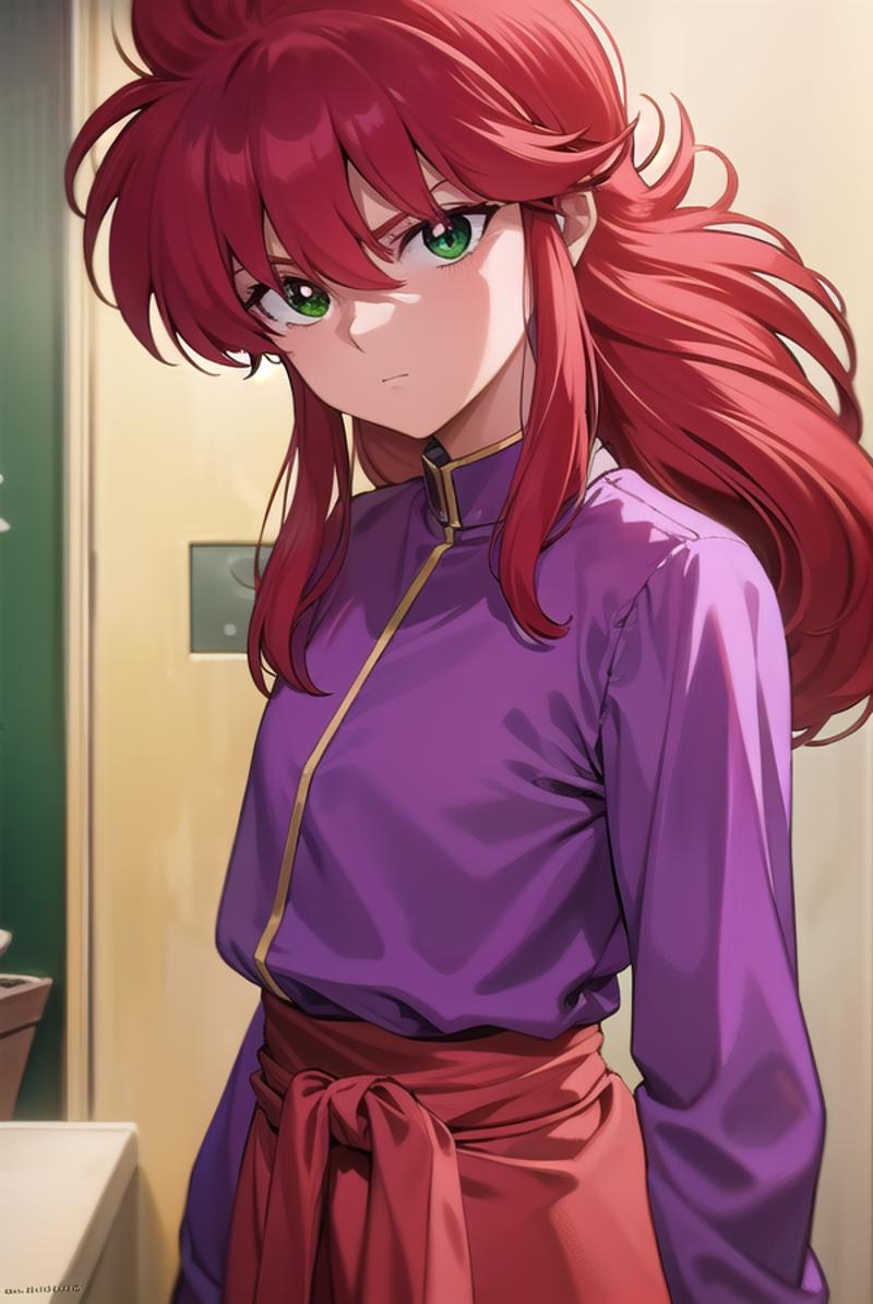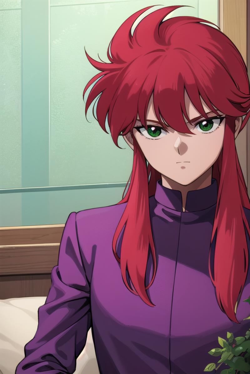 kurama, long hair, red hair, bangs, (green eyes:1.5), (retro artstyle:1.5), 1990s \(style\),