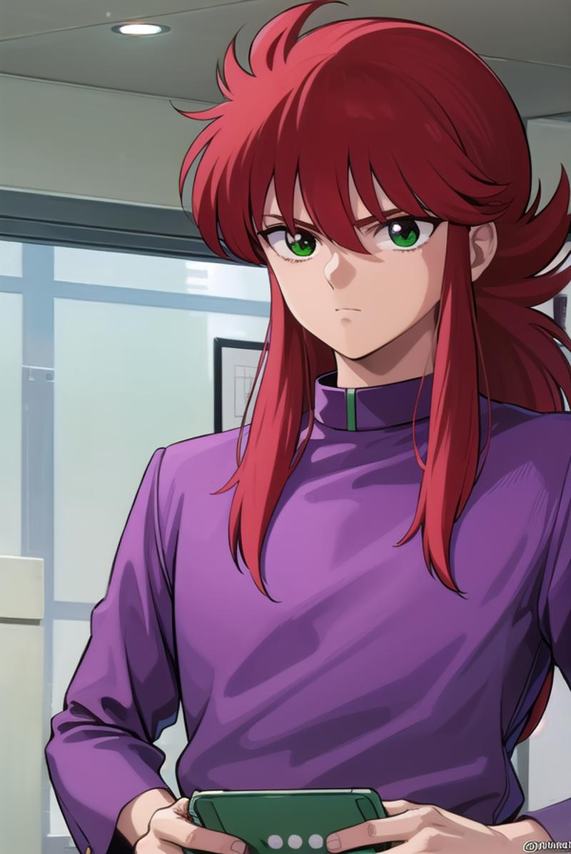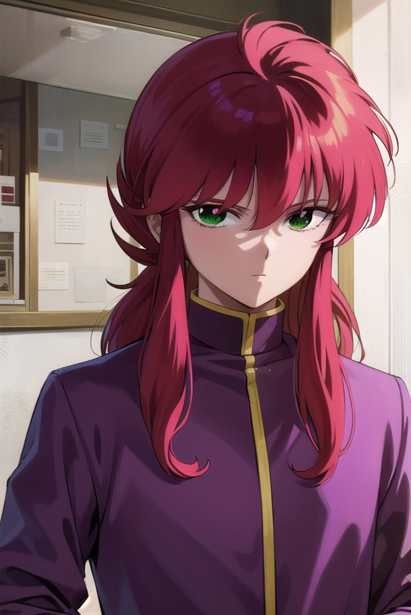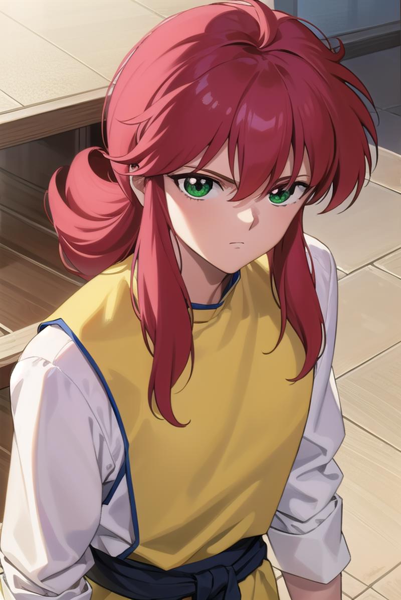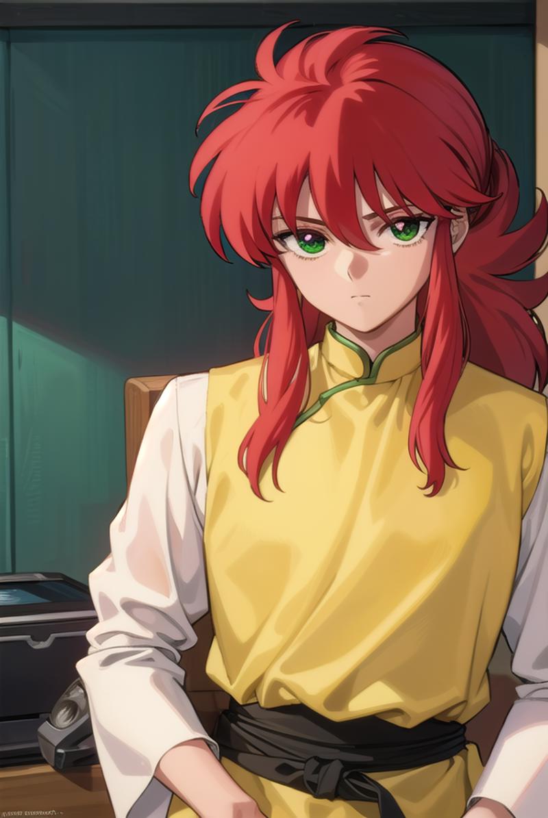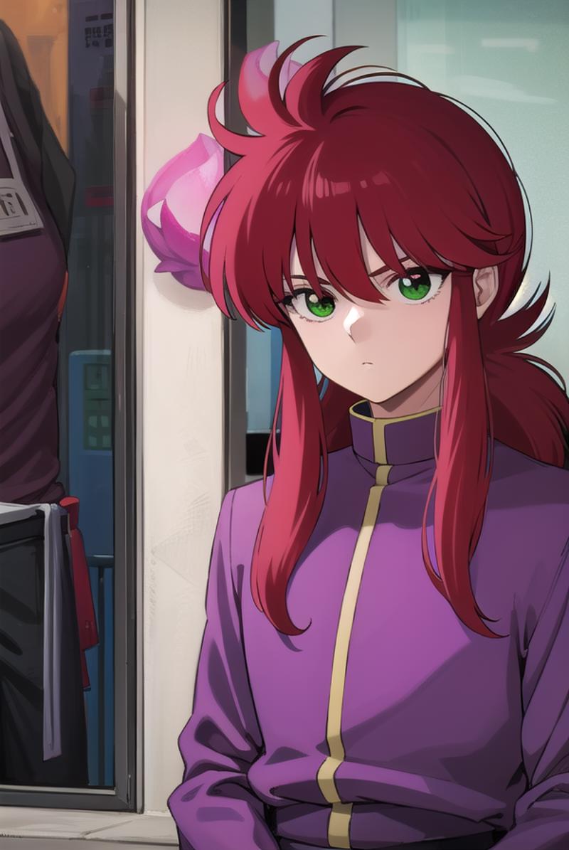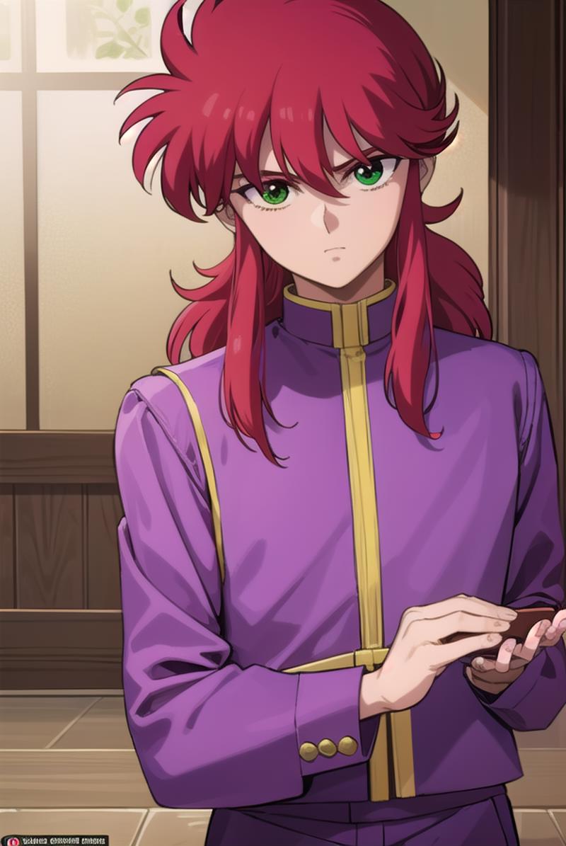 kurama, long hair, red hair, bangs, (green eyes:1.5), (retro artstyle:1.5), 1990s \(style\),