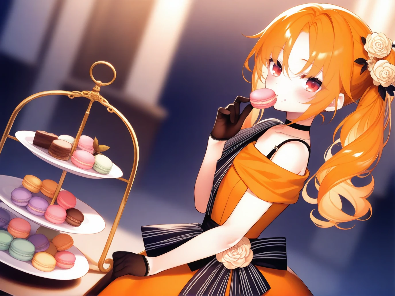 Schleiner/\(Canonicals\)/\(MagpieBridge\),gloves,dress,pantyhose,black gloves,orange hair,long hair,side ponytail,choker,hair ornament,blonde hair,flower,orange dress,red eyes,black pantyhose,hair flower,red eyes,black_loafers,single bare shoulder,Description