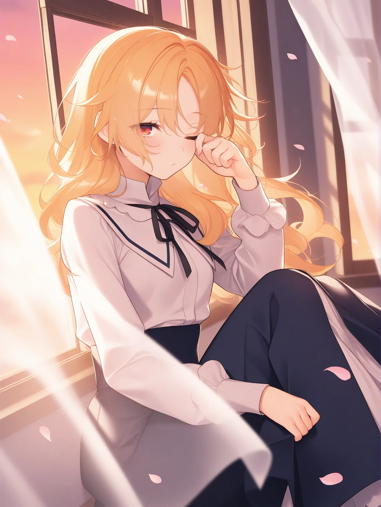 Schleiner/\(CollegeUniform\)/\(MagpieBridge\),long hair,blonde hair,socks,long sleeves,white background,white shirt,shoes,shirt,black socks,brown footwear,ribbon,black ribbon,neck ribbon,red eyes,loafers,long skirt,