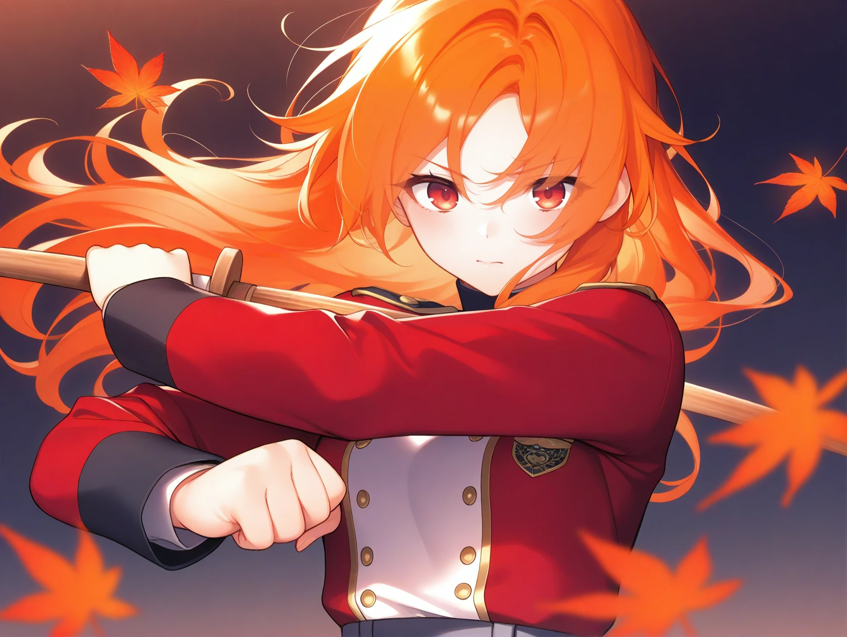 Schleiner/\(TrainingUniform\)/\(MagpieBridge\),black footwear,boots,long hair,black socks,red jacket,shorts,socks,black shorts,long sleeves,jacket,orange hair,red eyes,buttons,belt,uniform,Canonicals: