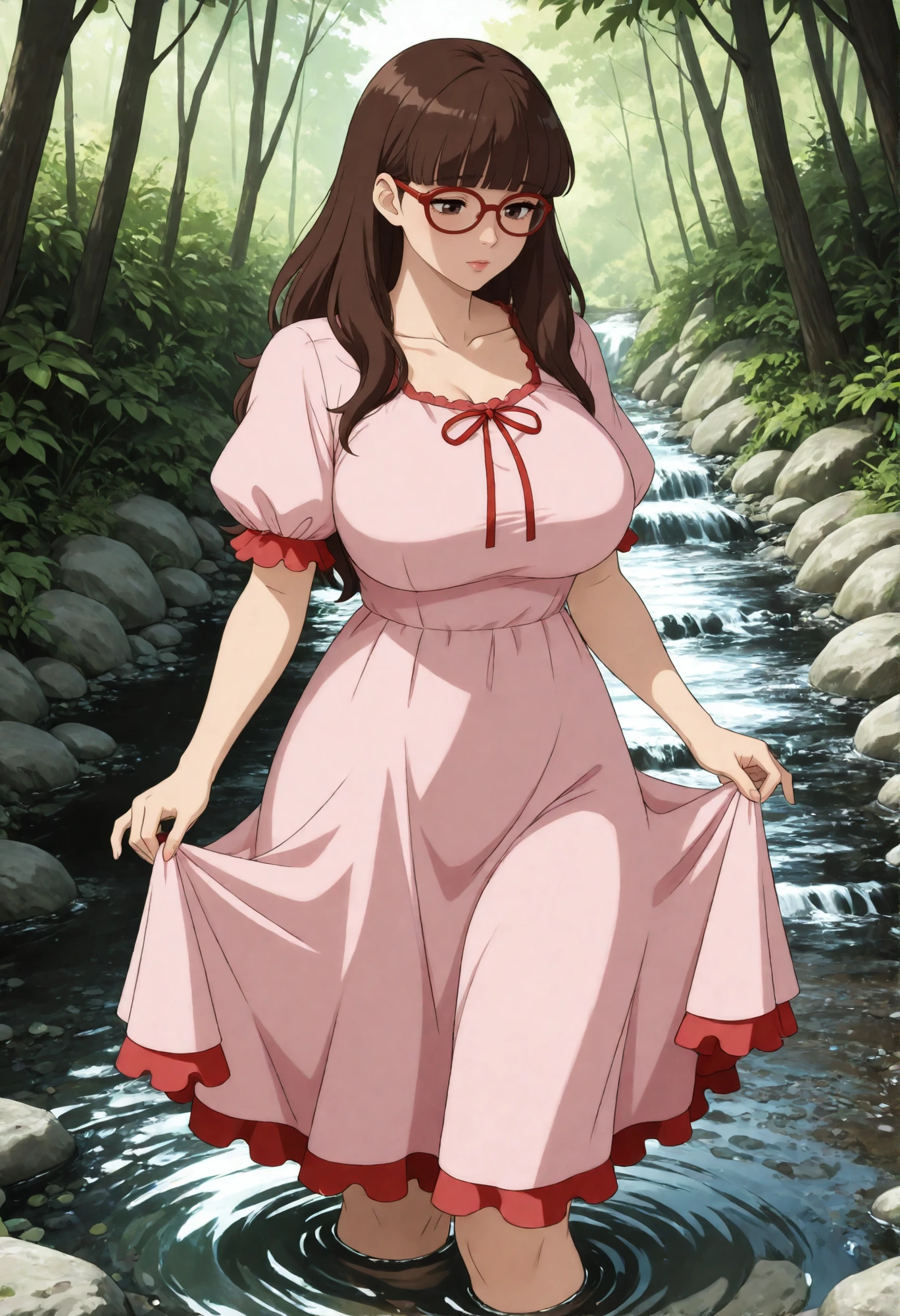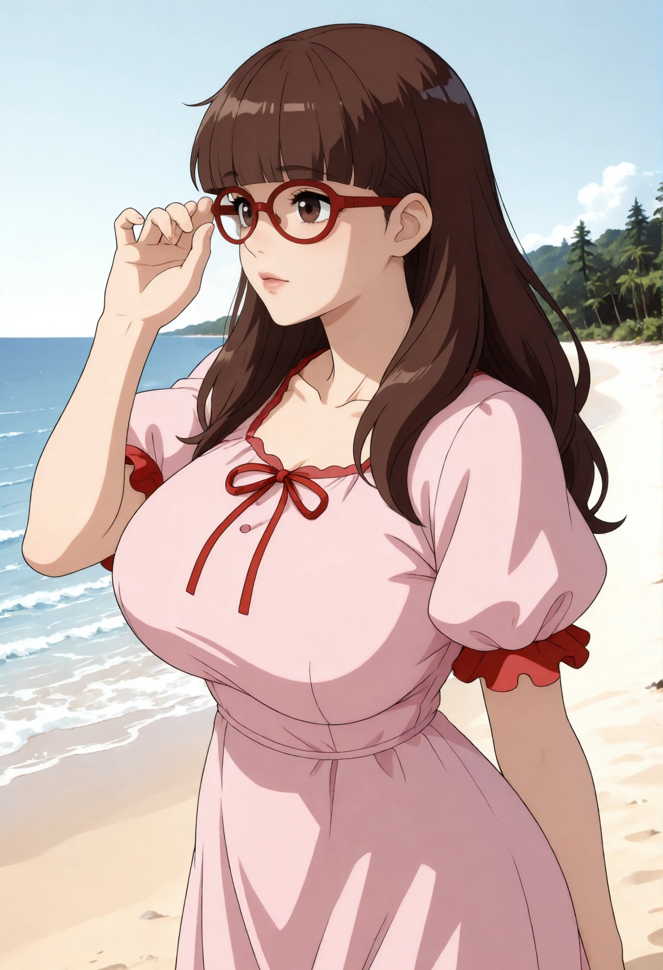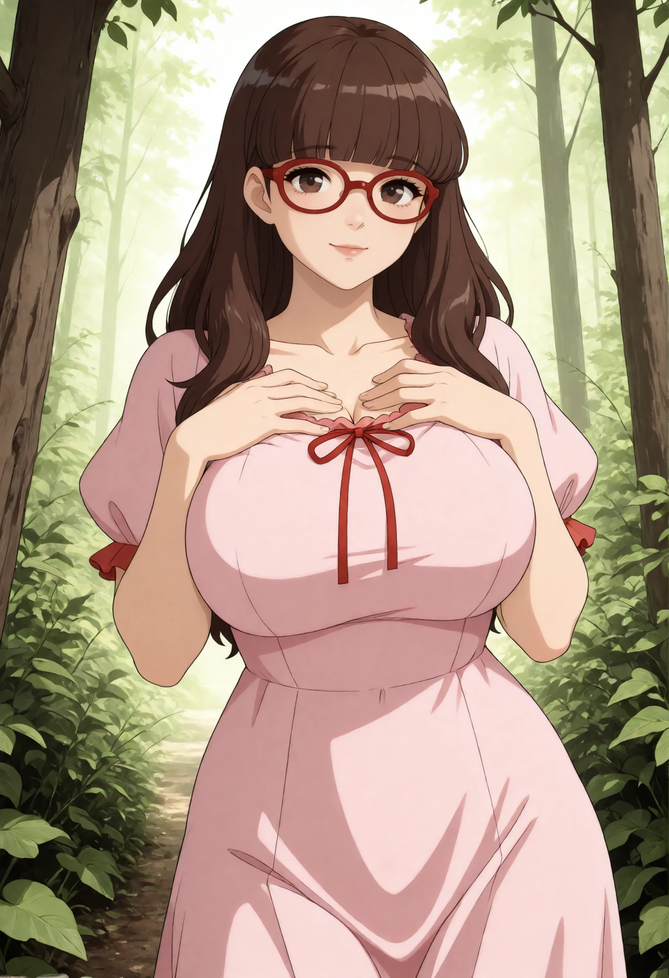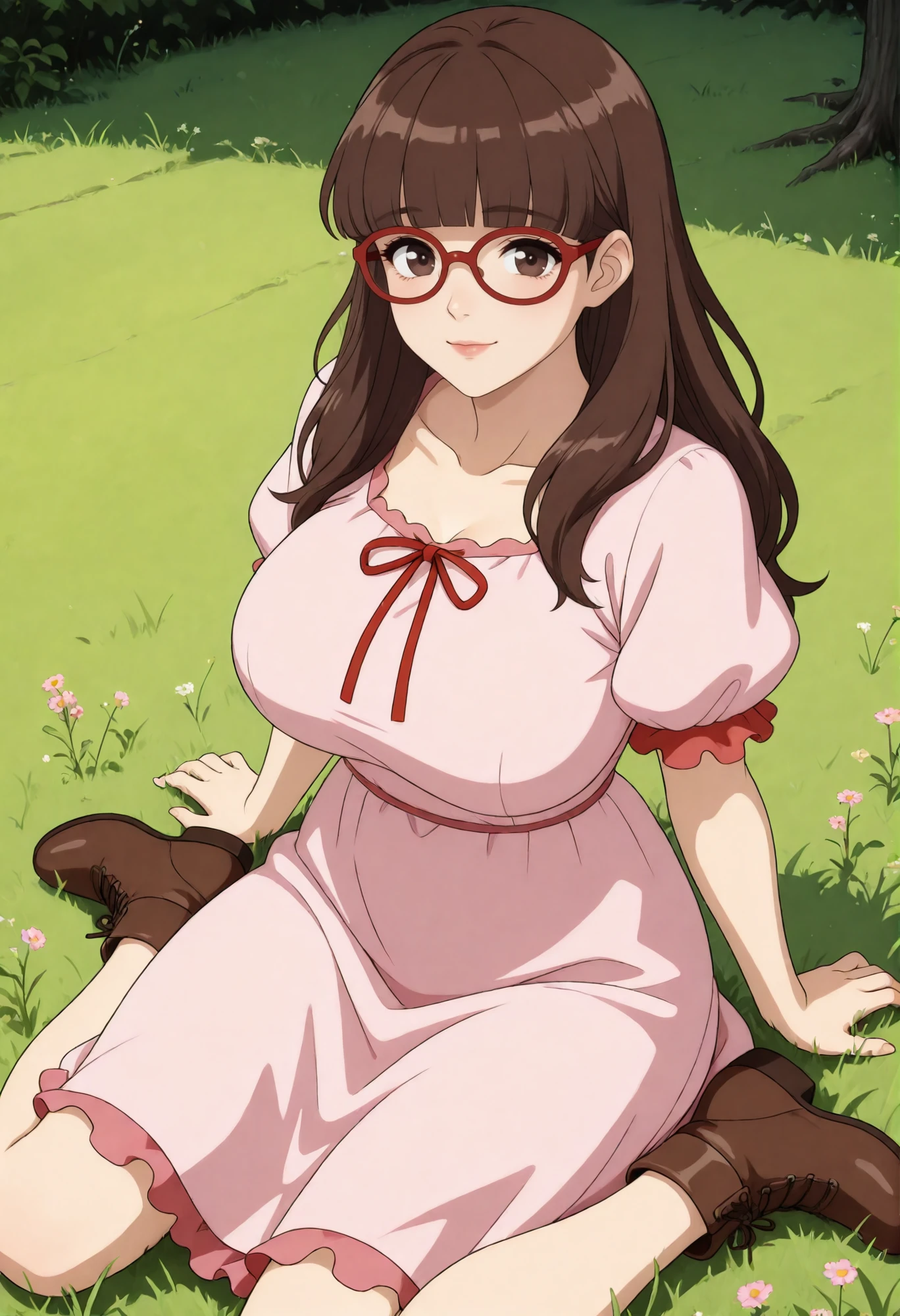 sod,akemi,brown hair,long hair,blunt bangs,brown eyes,brown footwear,,collarbone,pink dress,puffy short sleeves,red ribbon,red-framed eyewear,