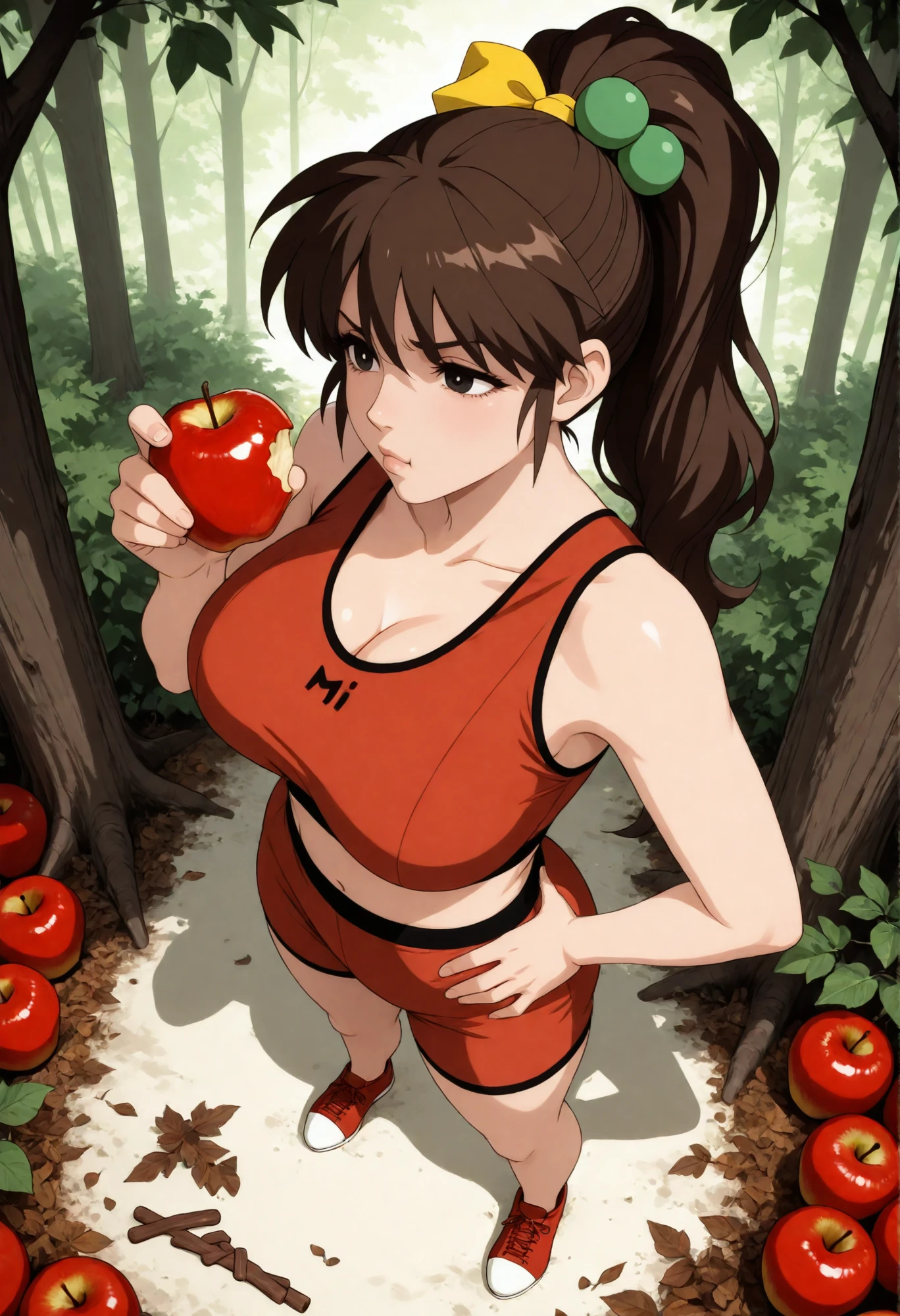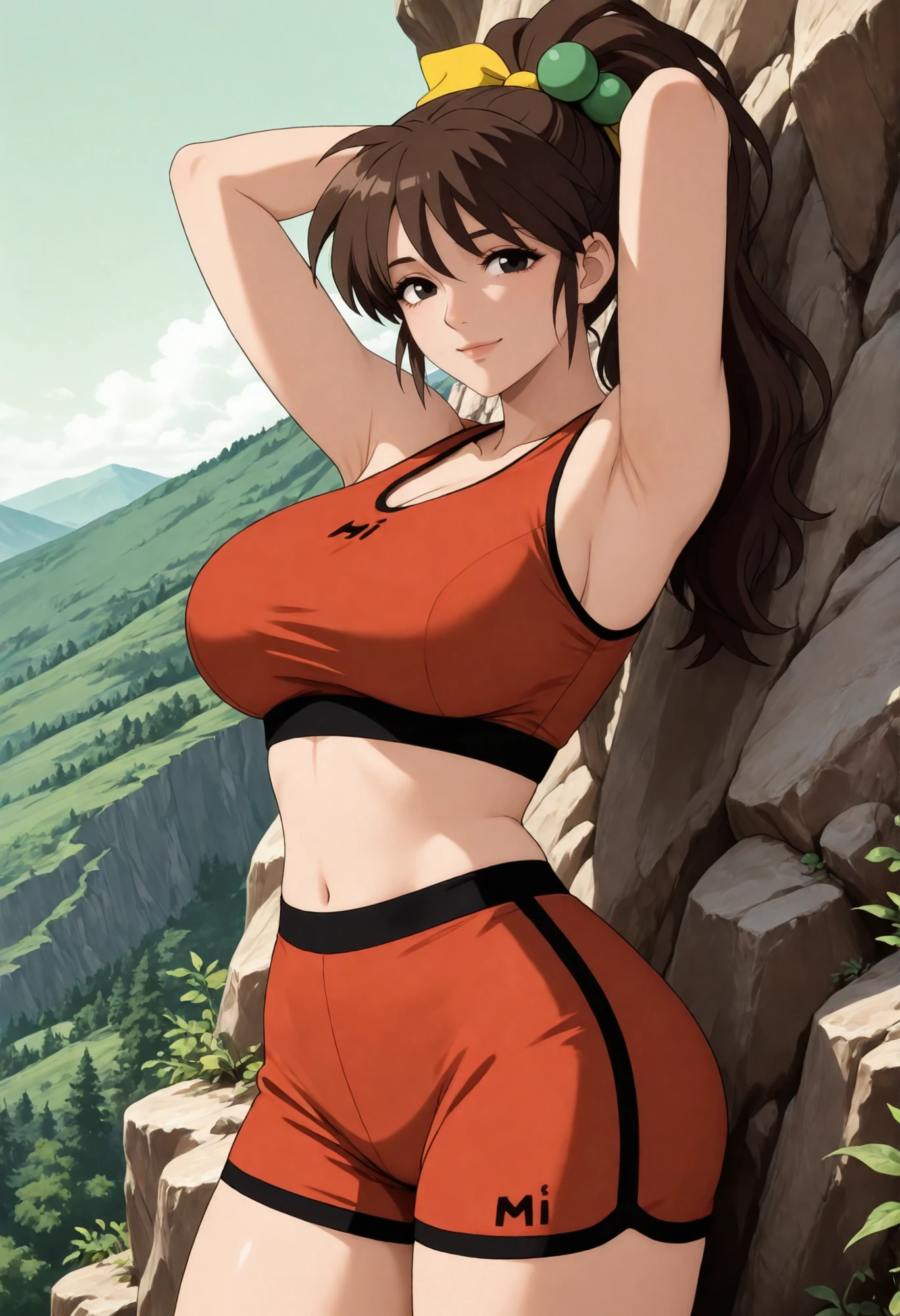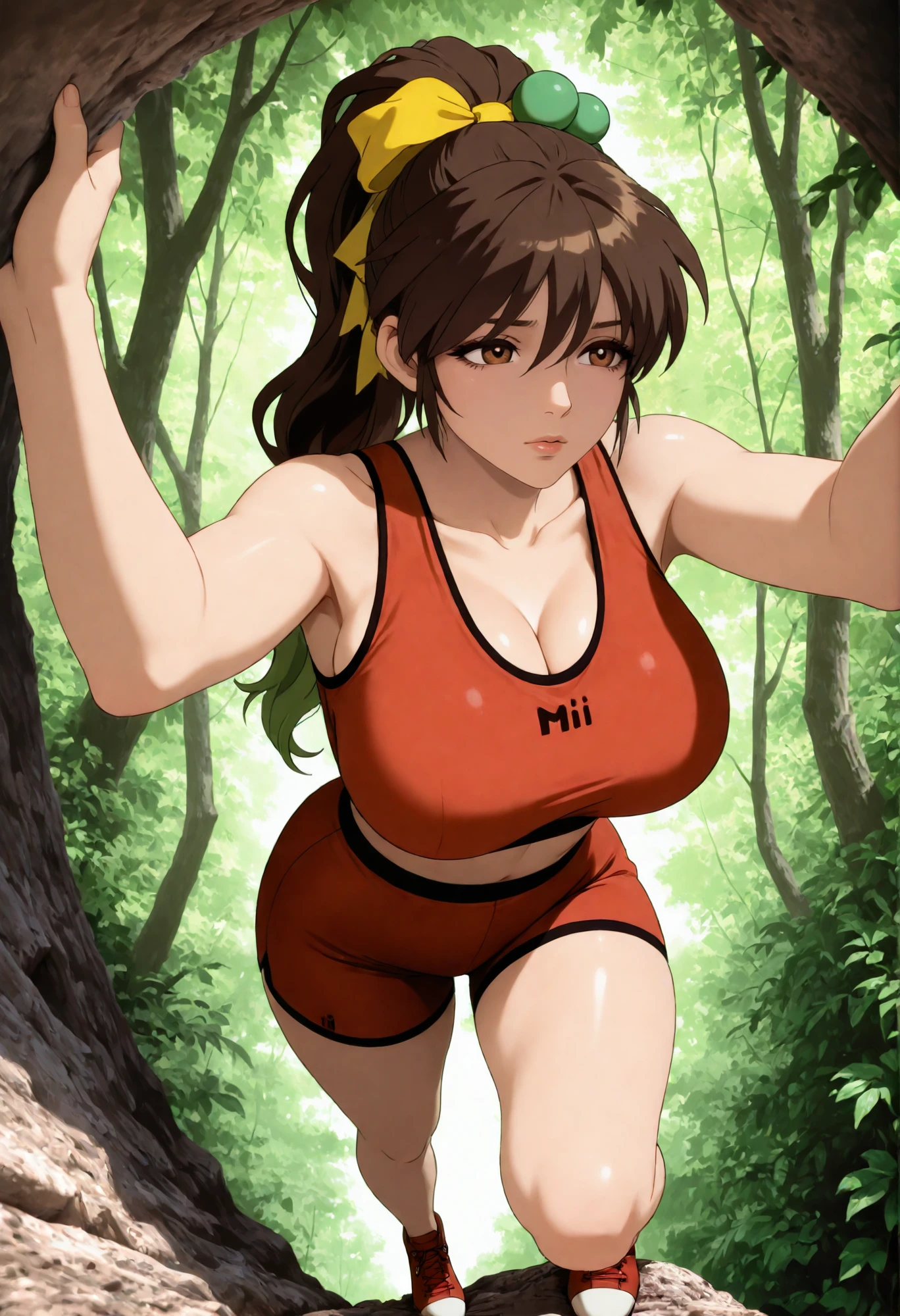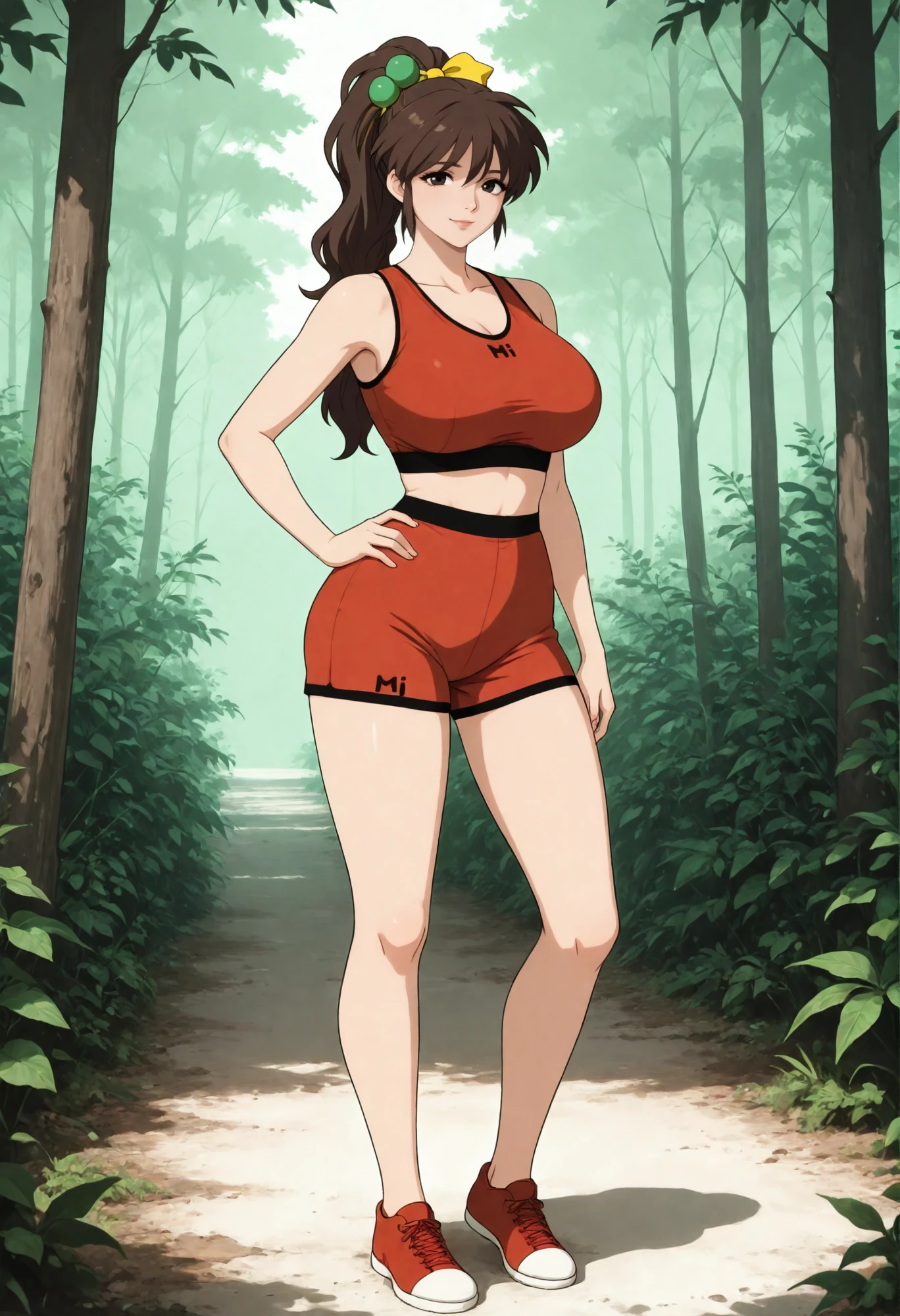 sod,yuko,brown hair,long hair,ponytail,black eyes,green hair ornament and yellow hair ribbon,sportswear,sports bra,midriff,red shorts,red white shoes,