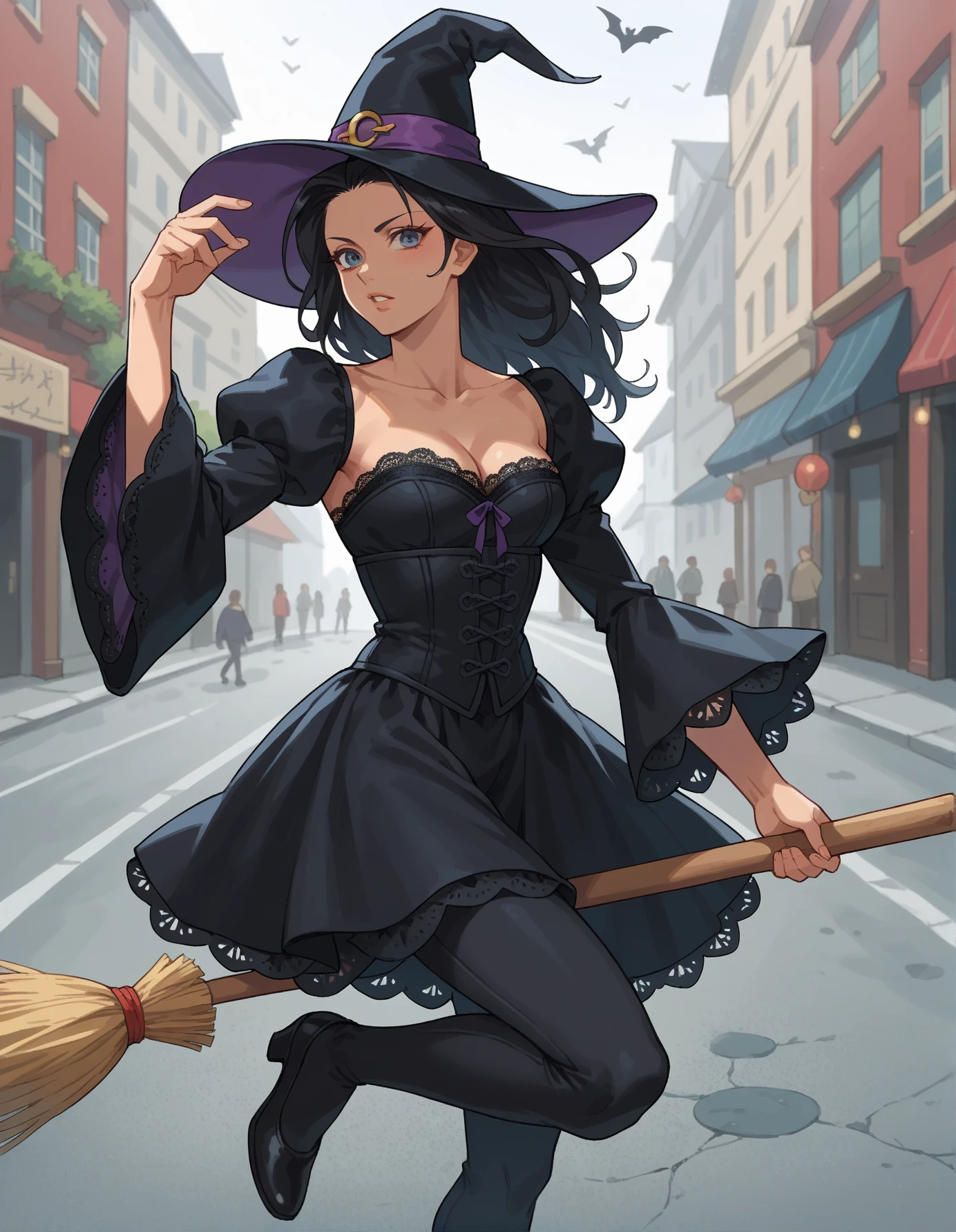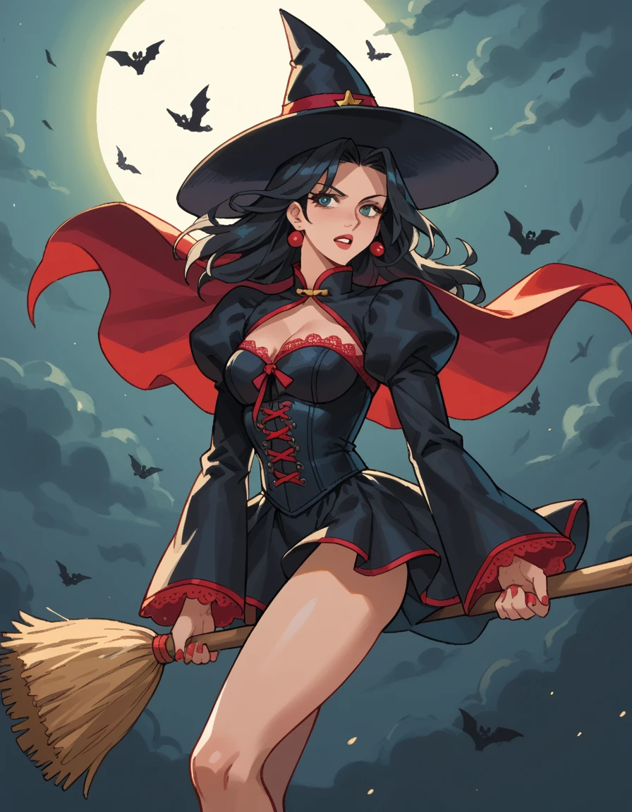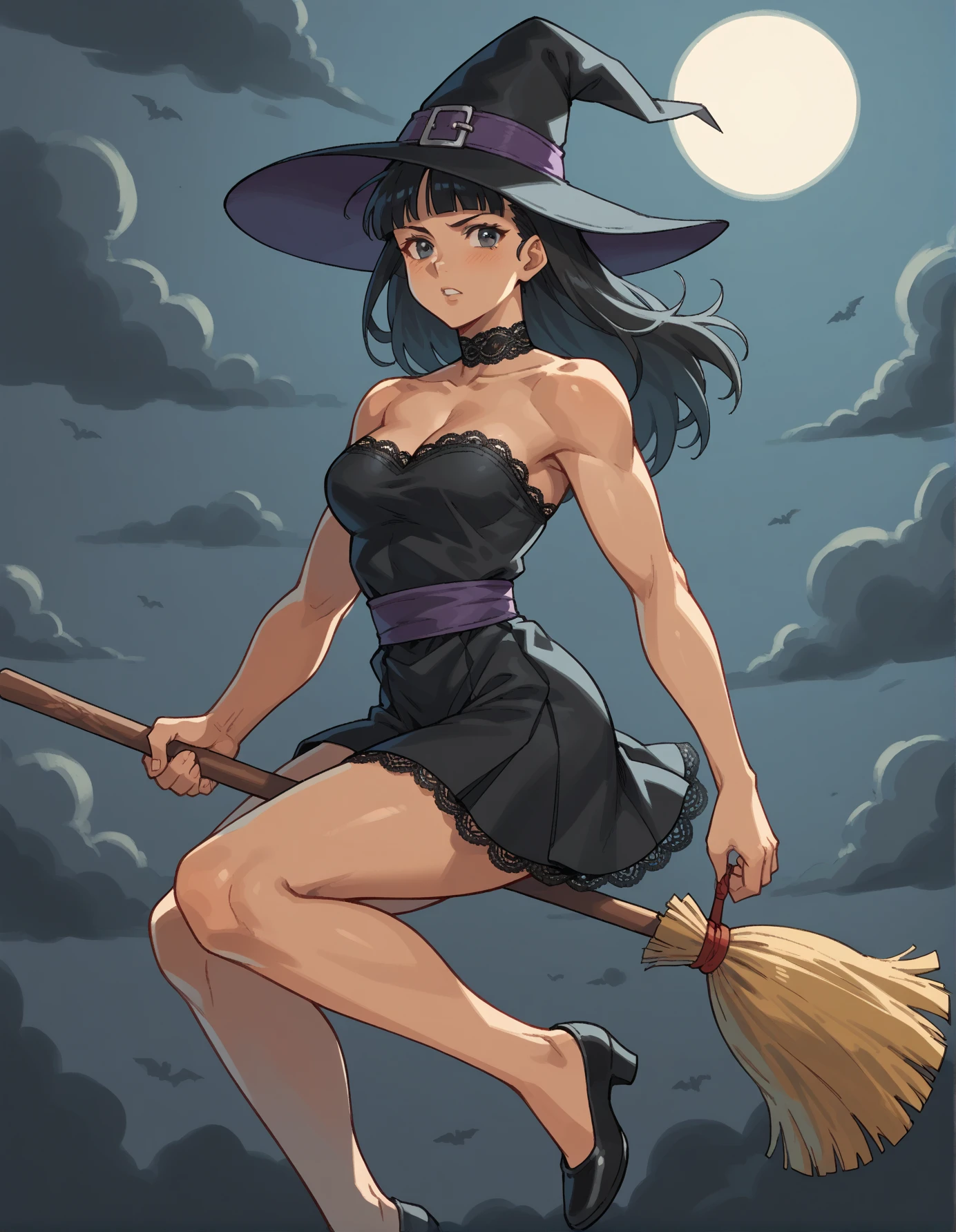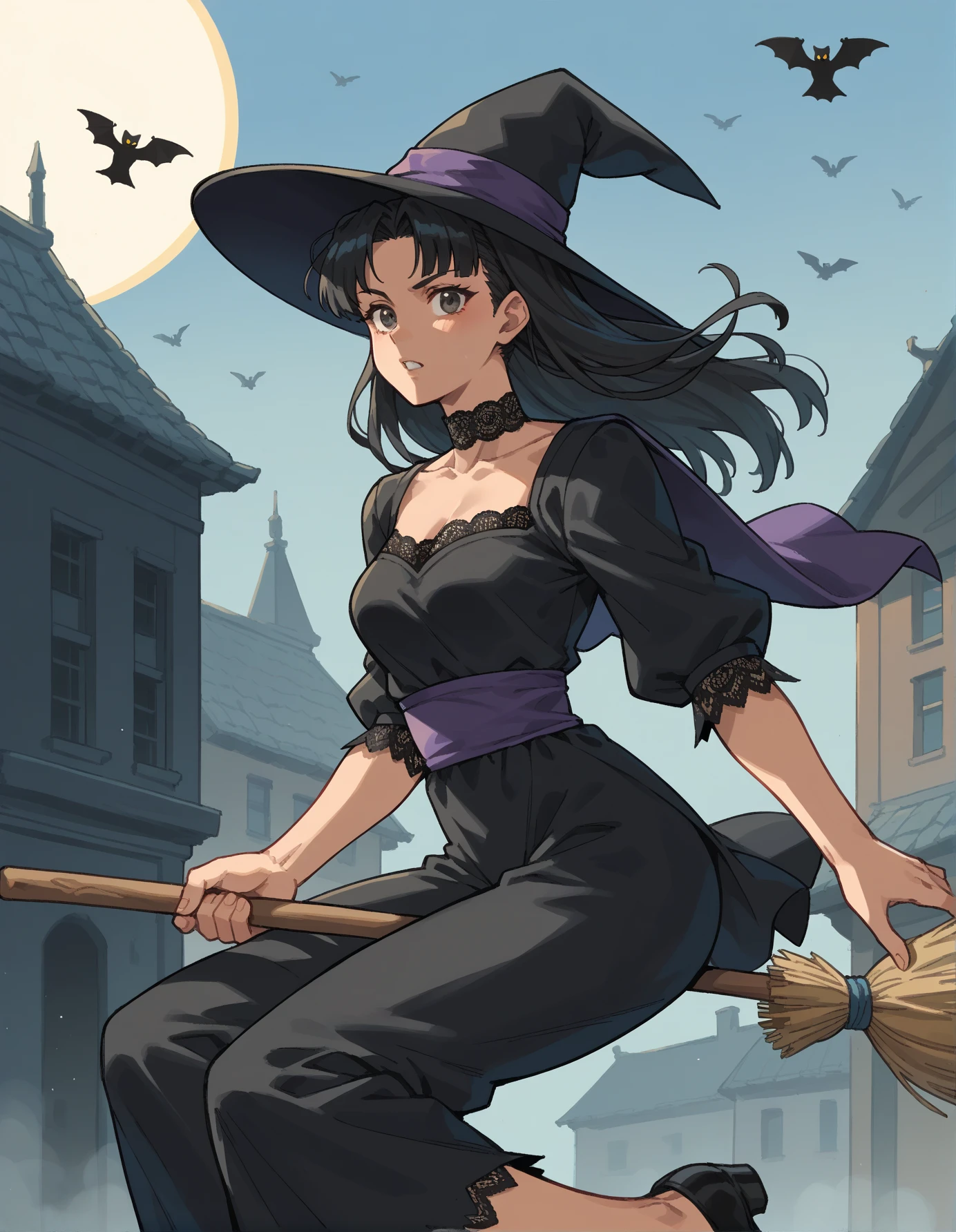 Keywords: hud_br00m, 1girl, solo, broom, CLOTHING, broom riding, long black hair, witch hat (or hat), midair