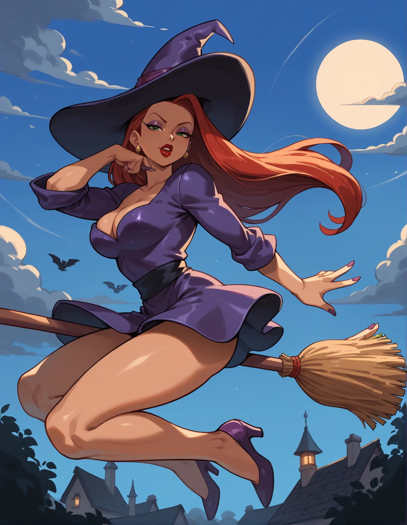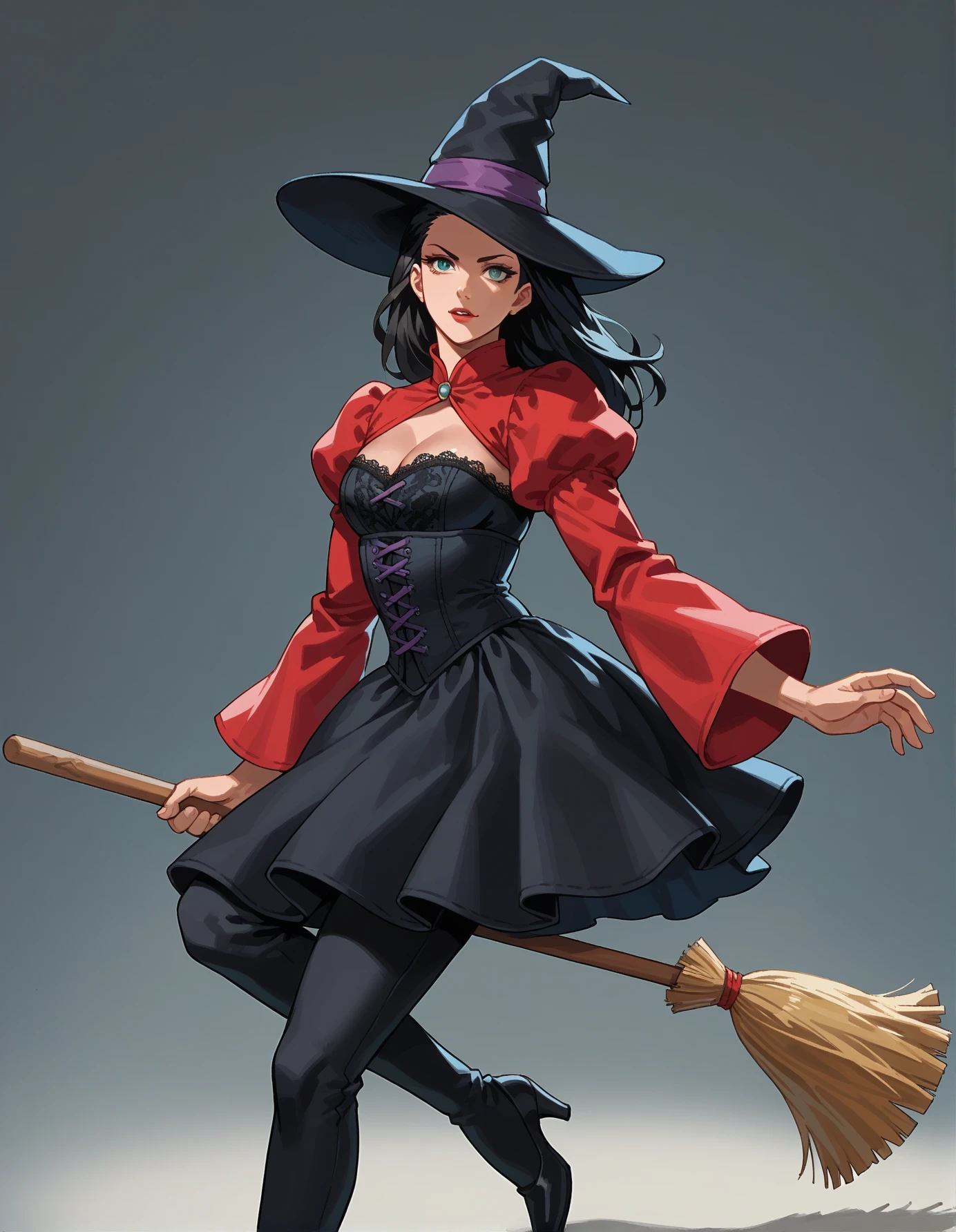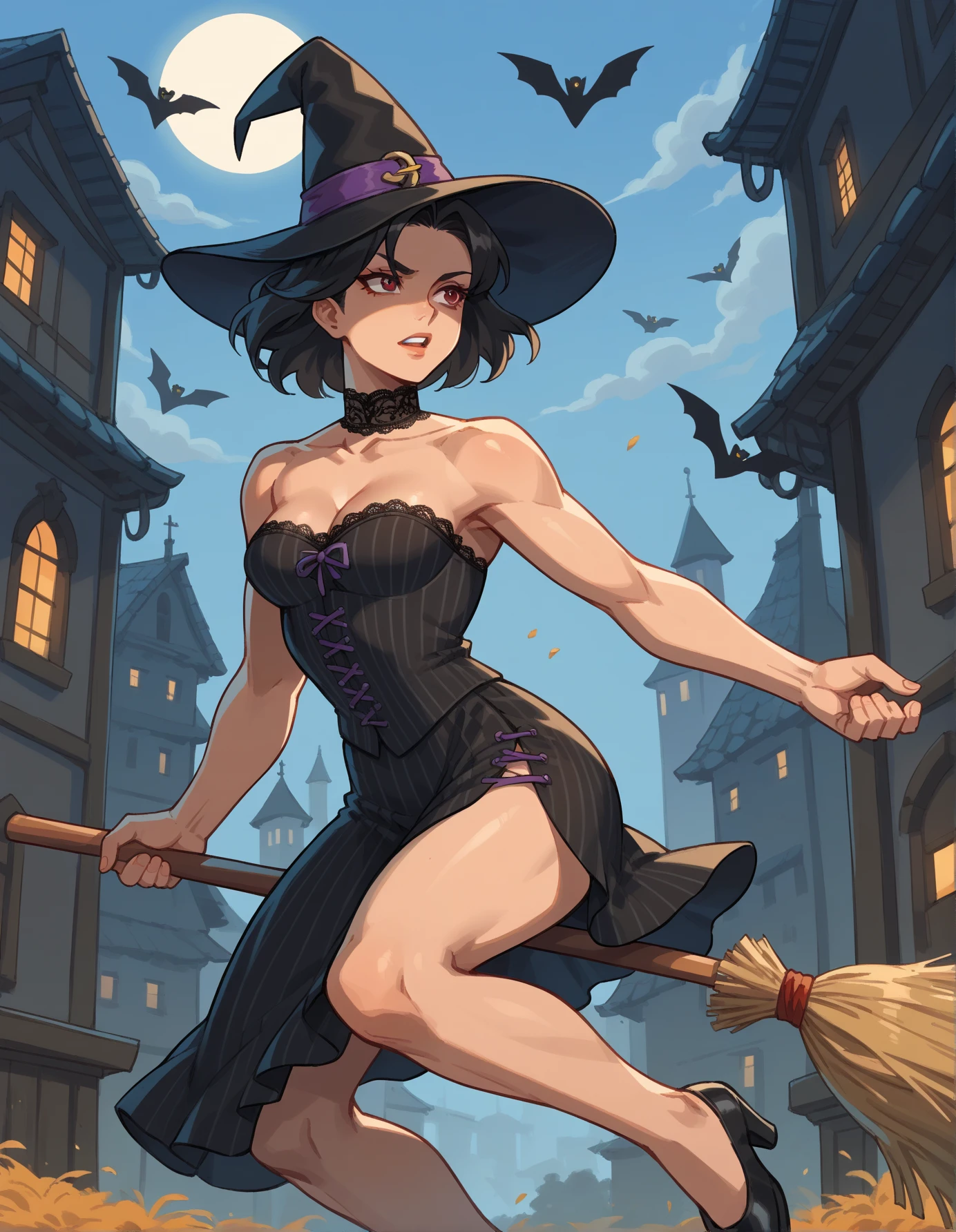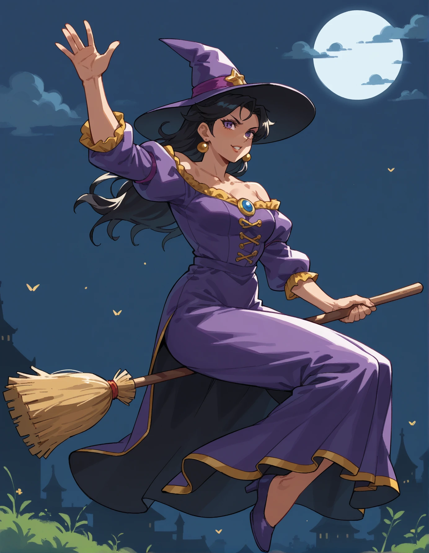Keywords: hud_br00m, 1girl, solo, broom, CLOTHING, broom riding, long black hair, witch hat (or hat), midair