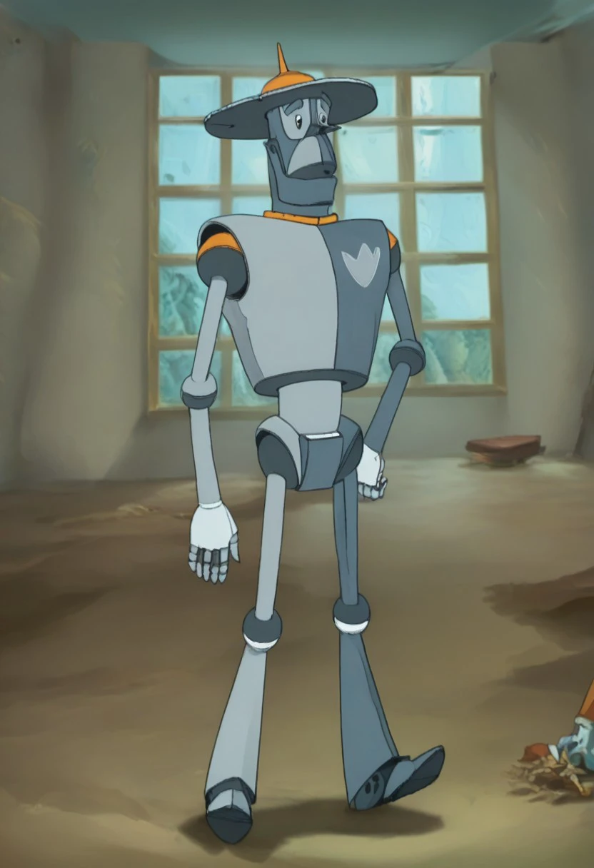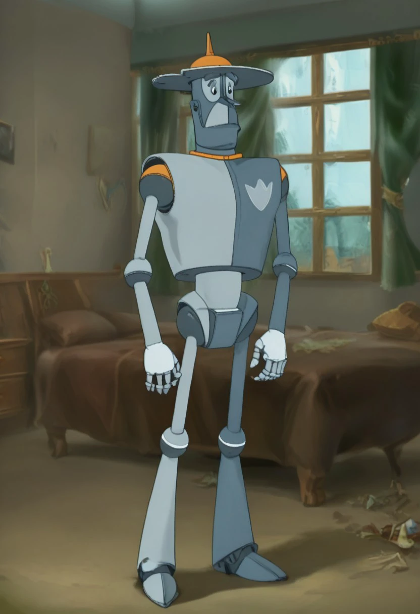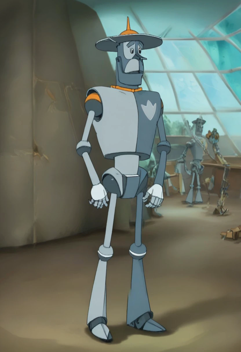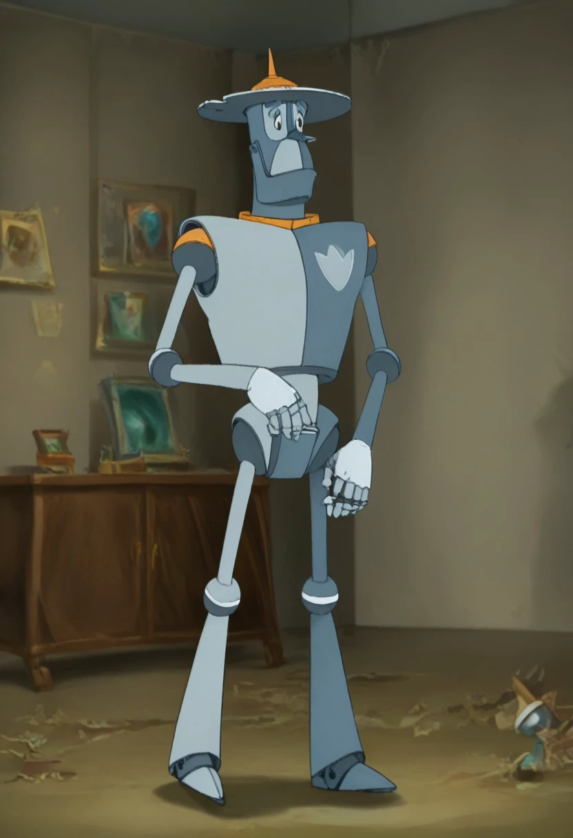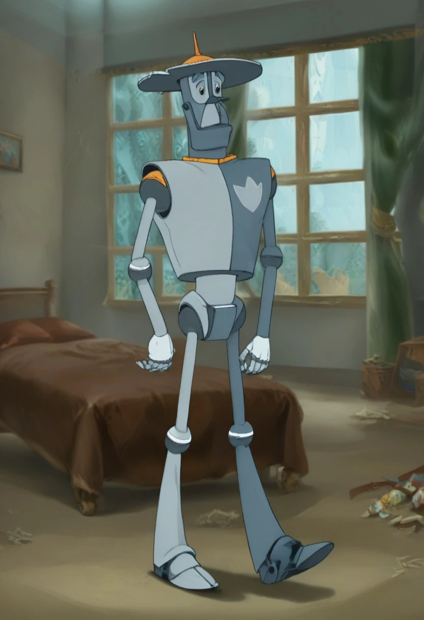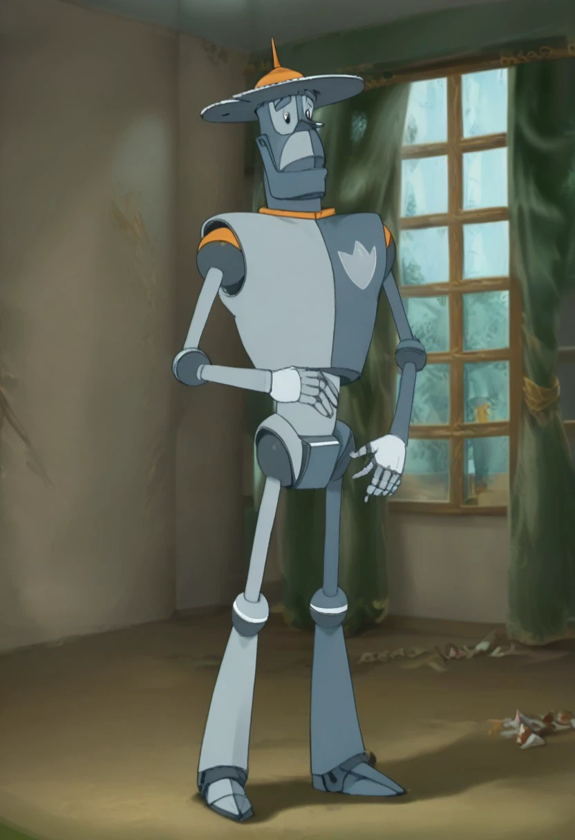 (drovosek), 1boy, male robot, anthro robot, hinge joints, ball joints, metal skin, long nose, humanoid robot, flat iron hat,