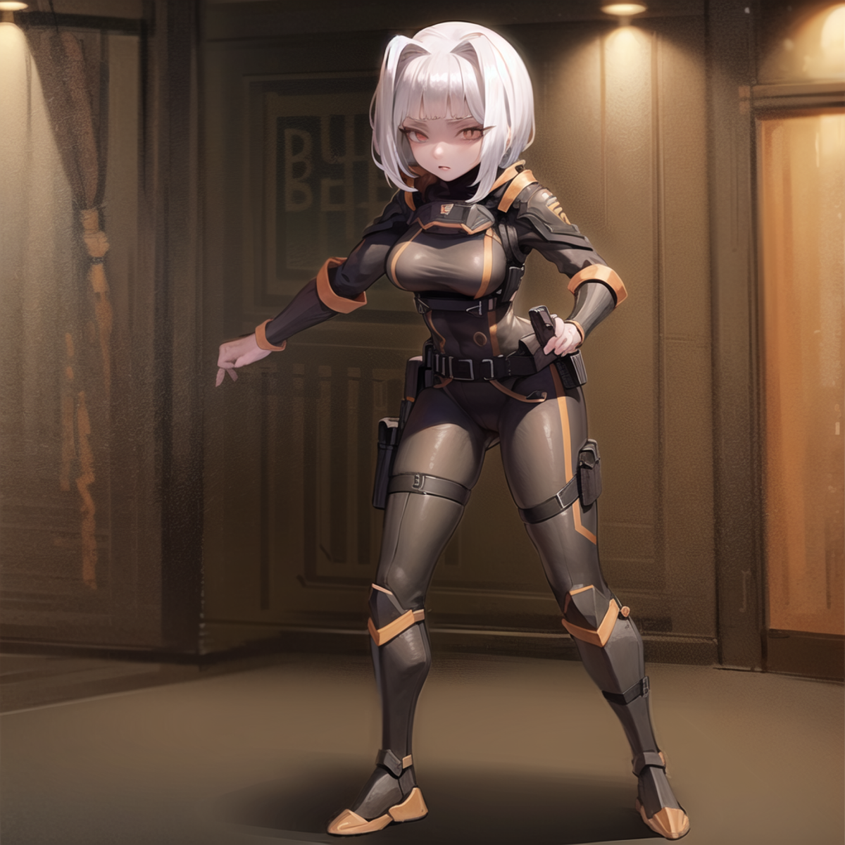 a girl dressed in black and orange outfit with short hair, 1girl, solo, short hair, white hair, full body