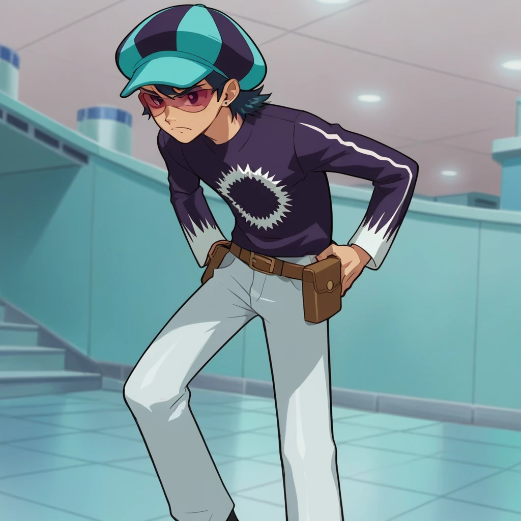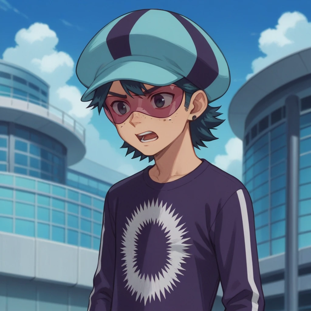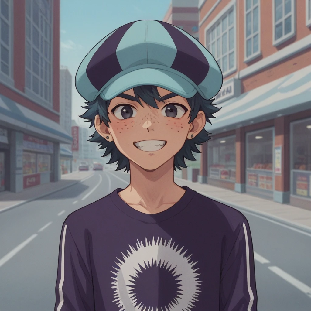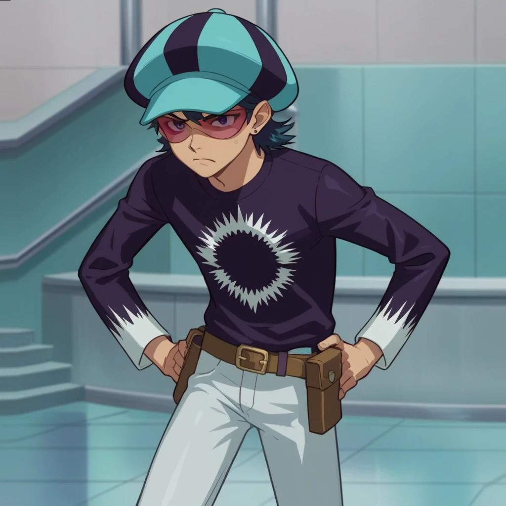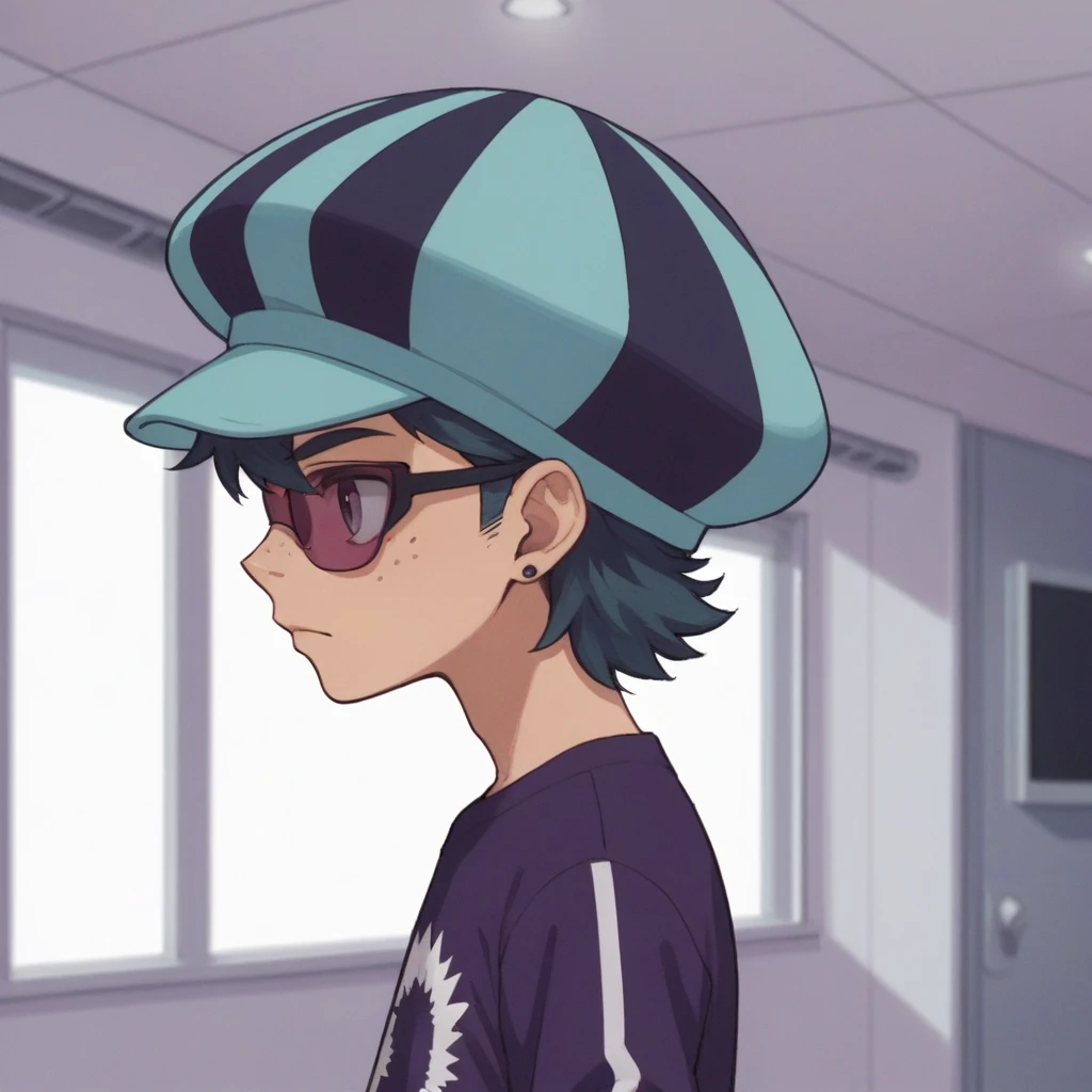 Prompts: male, dark teal hair, cabbie hat, black eyes, tinted eyewear, visor, freckles, stud earrings, jewelry, purple long-sleeved shirt, purple print shirt, ring, belt, belt pouches, pants, black loafers, indoors (laboratory/tile floor/front counter/stairs/window), indoors (hallway/ceiling light/door/monitor), outdoors (laboratory/sky/cloud/building/grass/trees/bushes/nuclear reactor), outdoors (department store/jumbotron/signs/street/road)
