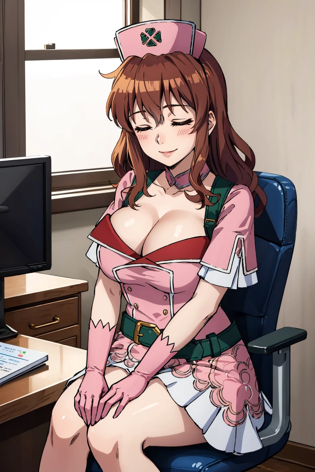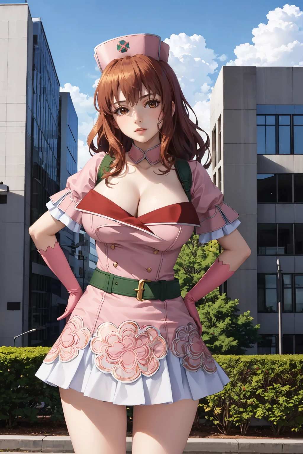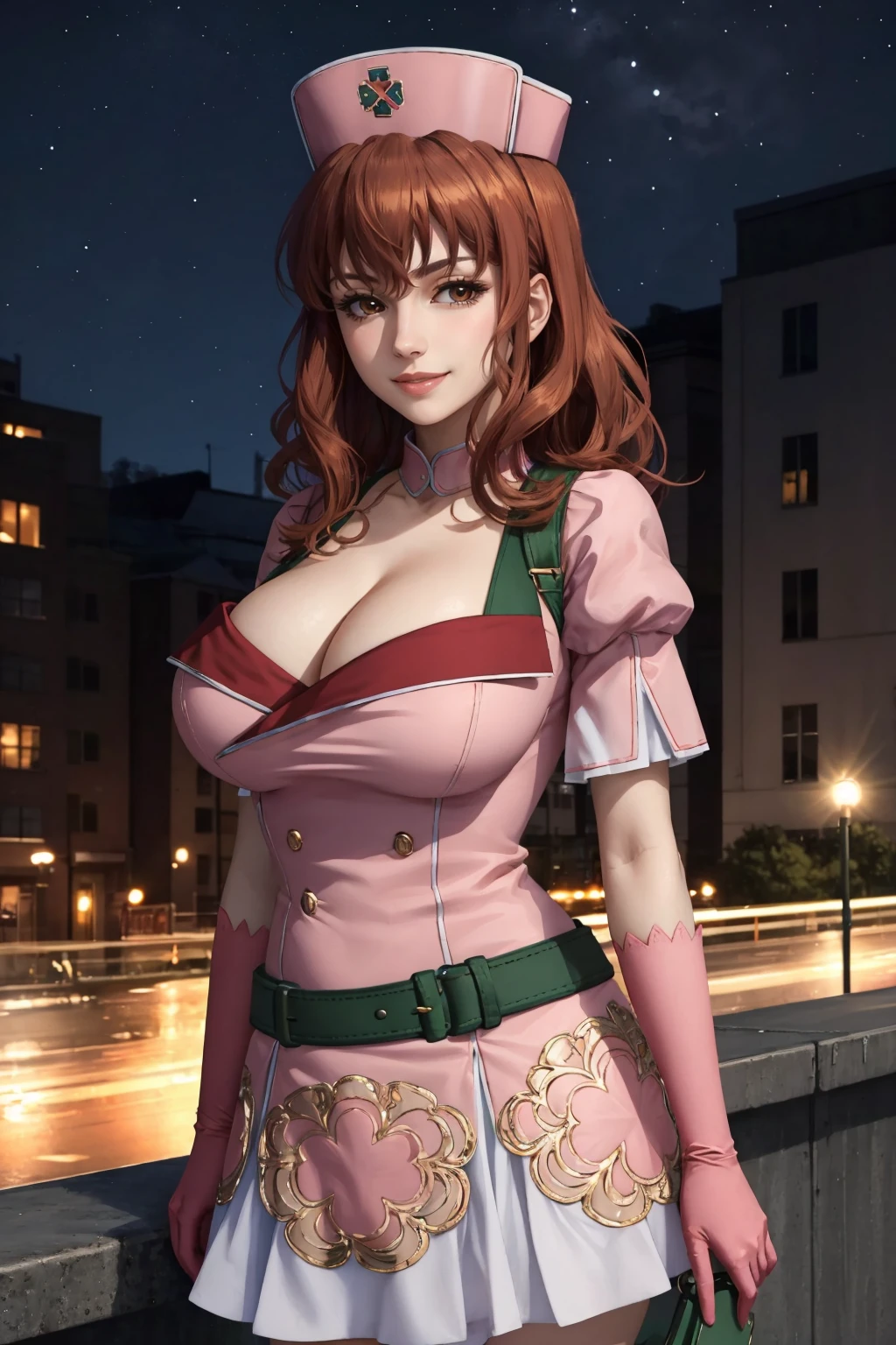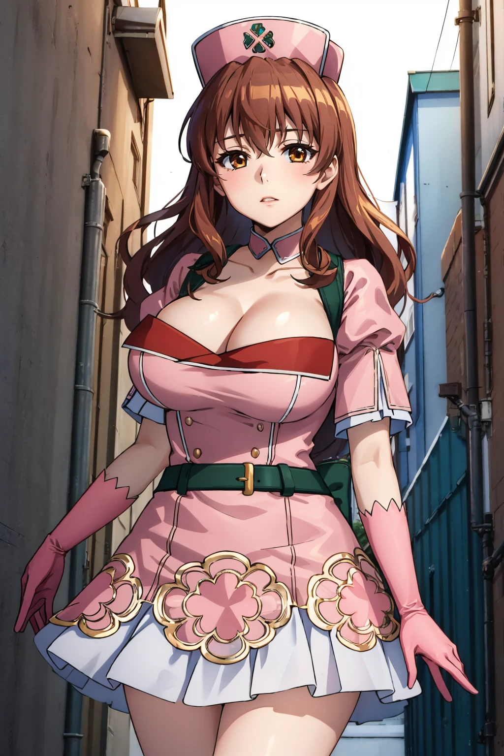 Add "nurse cap, pink dress, short sleeves, cleavage, belt, pink skirt, pink gloves, black thighhighs" for her typical look.