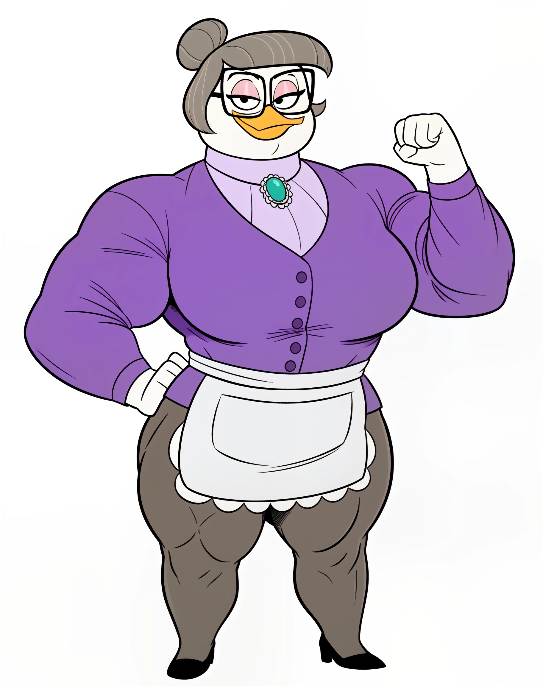 purple clothing, long sleeves, apron, skirt, legwear, pantyhose, high heels, eyewear, glasses, button (fastener), slightly chubby, muscular femaleReinforcement NSFW Tags: