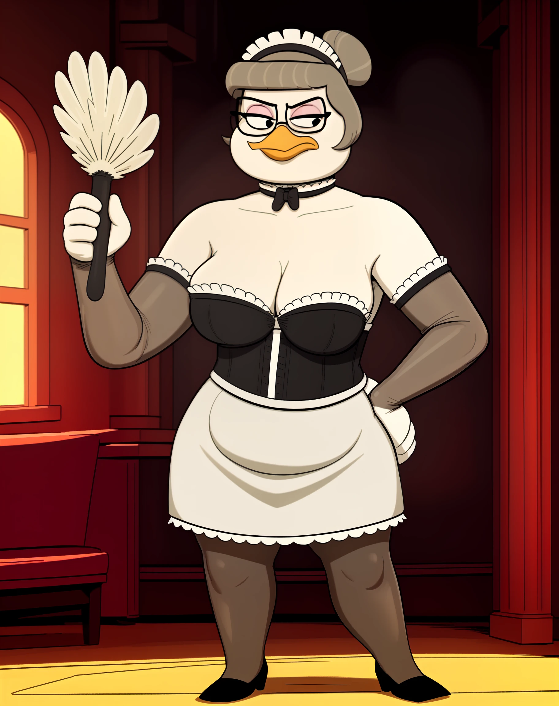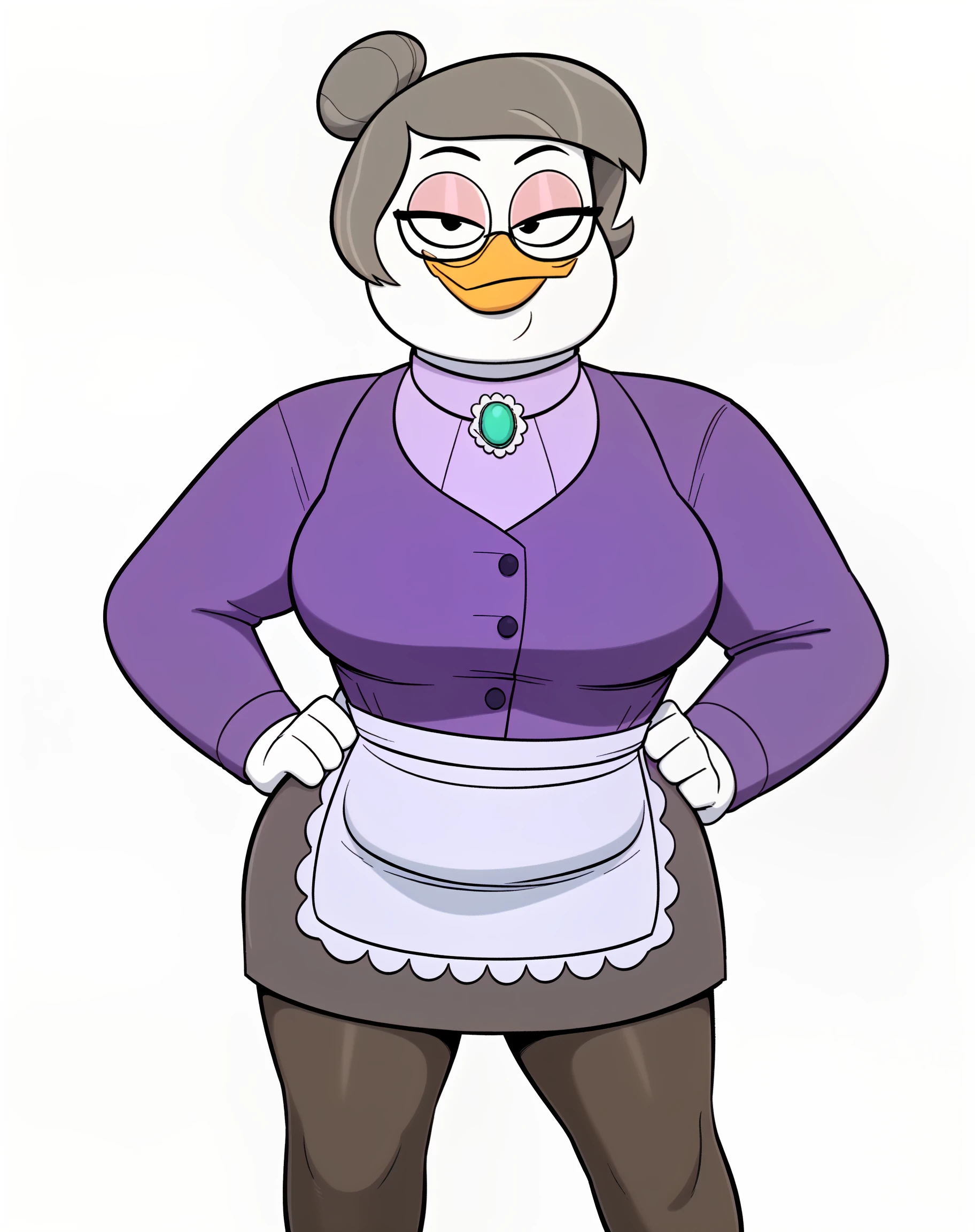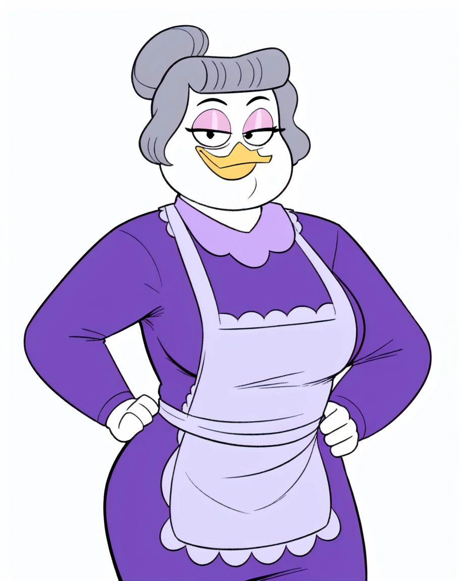 bentina beakley, duck, beak, white skin, brown hair, greying hair, hair bun, black eyes, pink eyeshadow, eyeliner, orange legs, webbed feetReinforcement SFW Tags: