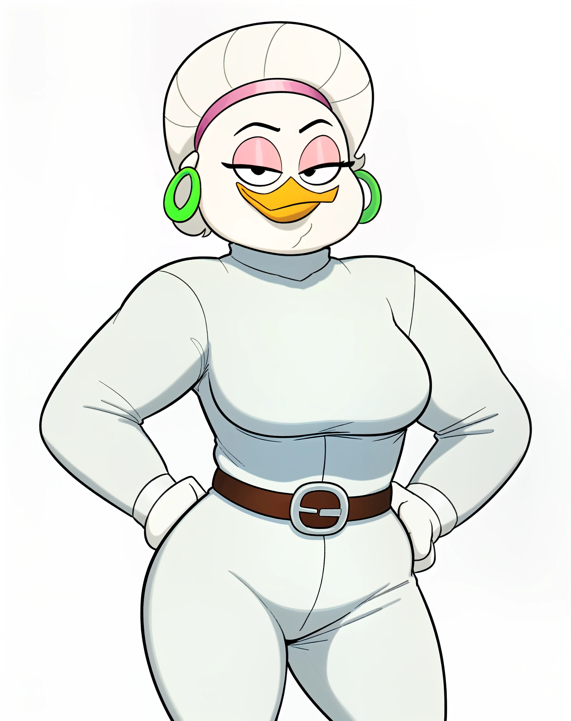 white clothing, white hair, jumpsuit, belt, tight clothing, green hoop ear ring, hairband, alternative hairstyle, high heeled boots, red footwearQuack Pack/DT87 Outfit: