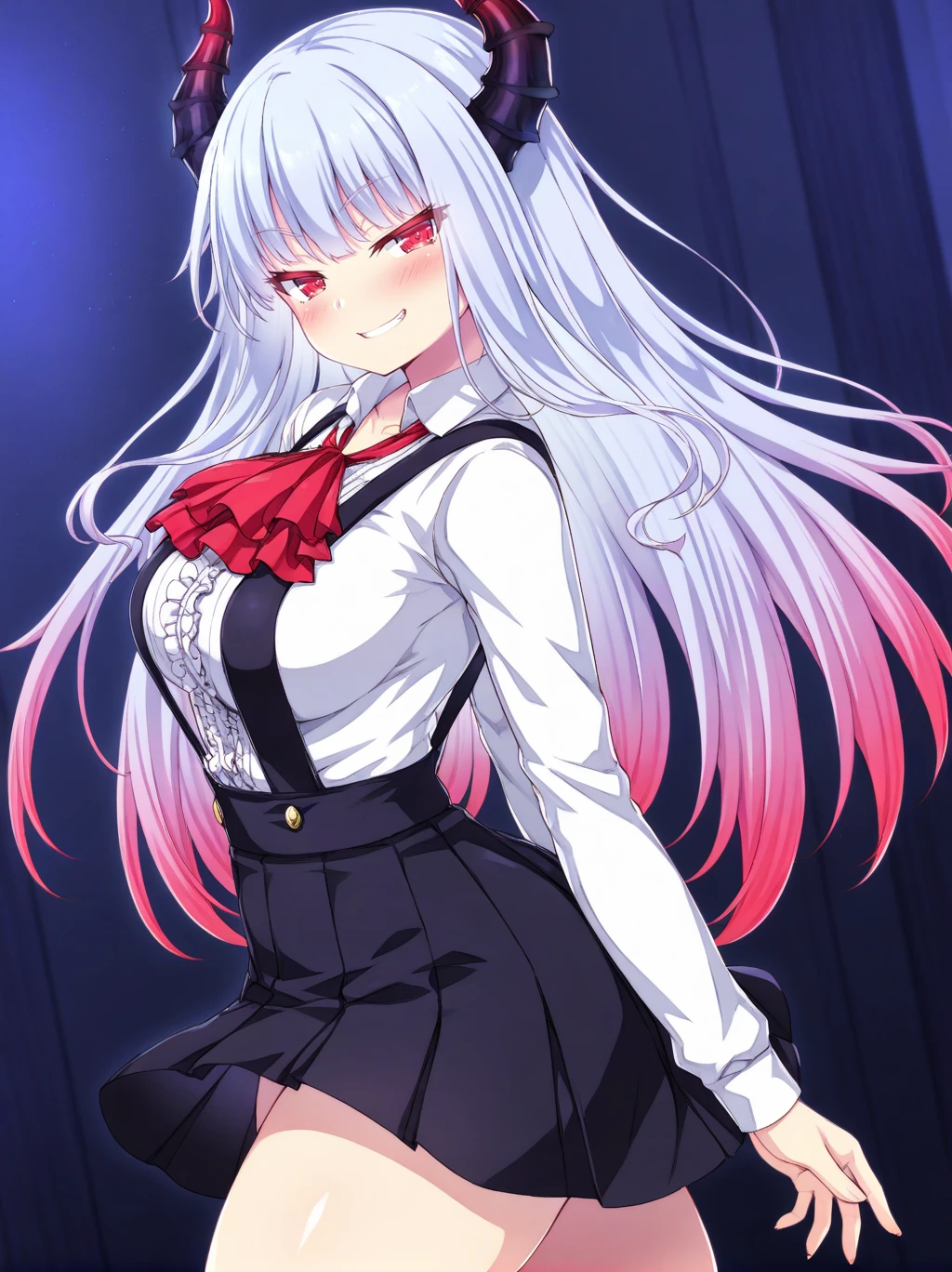 tag: Arccco, (white hair), red ascot, red eyes, v-shaped eyebrows, hair between eyes, bangs, ((((dragon horns, horns)))), long hair, gradient hair, multicolor hair,